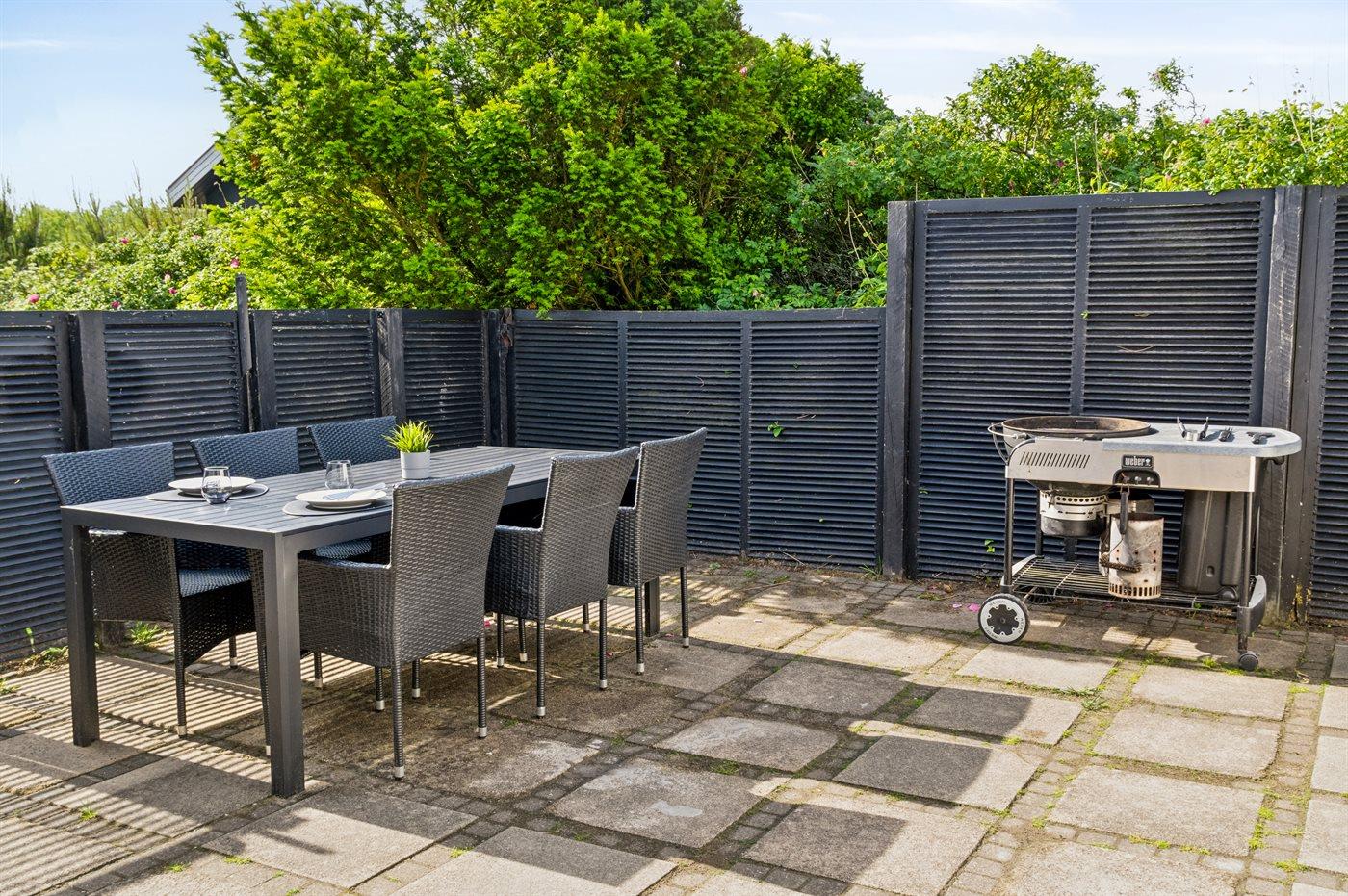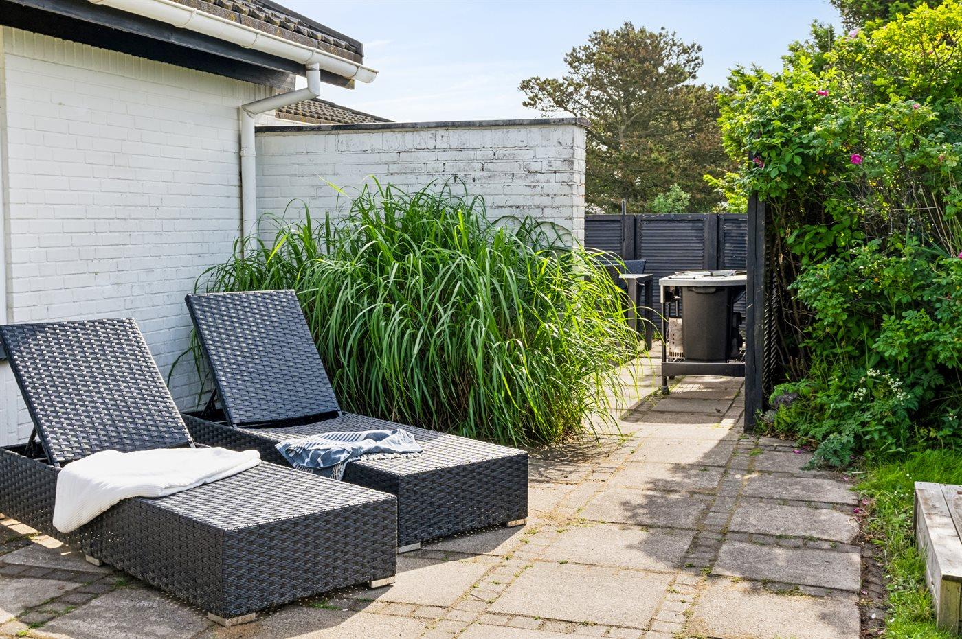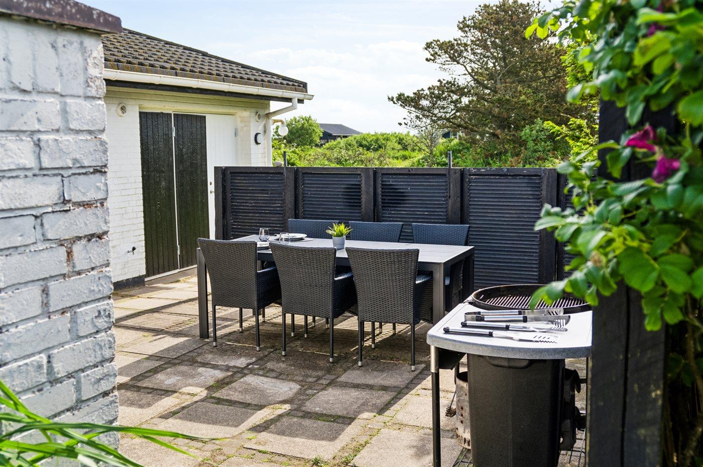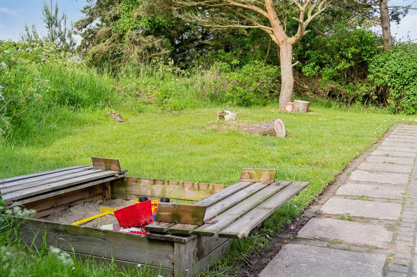 Huset er beliggende på en 1800 m² stor naturgrund. Der er 500 m til havet og nærmeste forretning er beliggende i en afstand af 1200 m. Der findes 50 m² terrasseareal, hvoraf 30 m² er lukket. Sandkasse. Grill til rådighed. Parkering ved ferieboligen.
