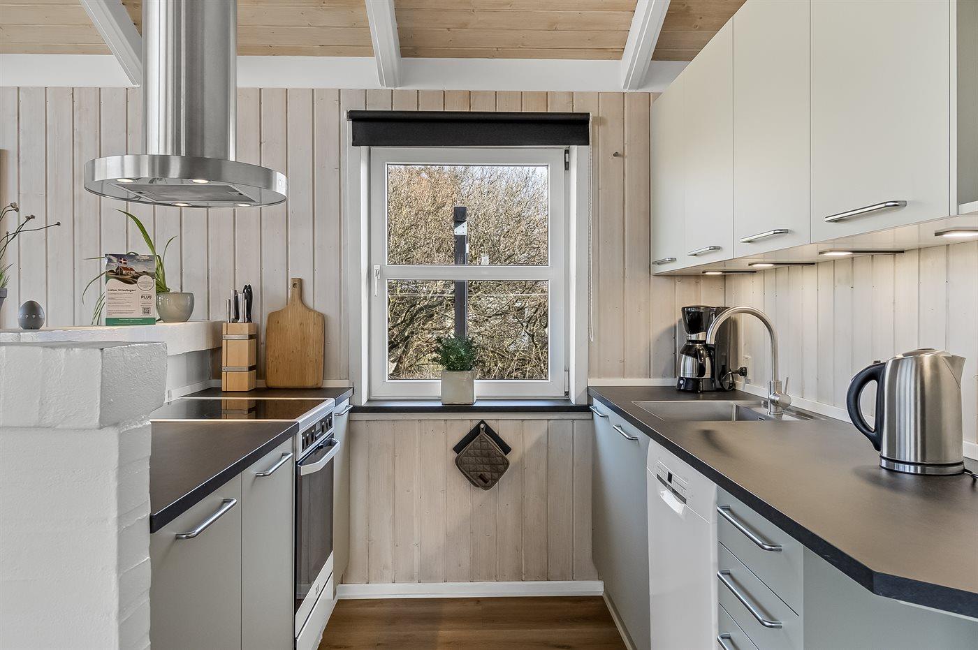 Køkkenet er udstyret med 1 køleskab. Der er 4 induktionskogeplader, varmluftovn, mikrobølgeovn samt opvaskemaskine Der er gulvvarme i køkkenet.