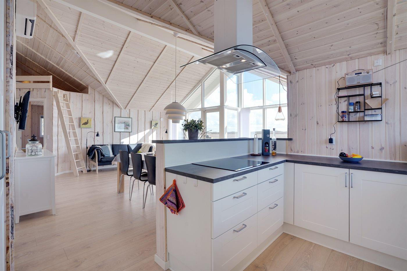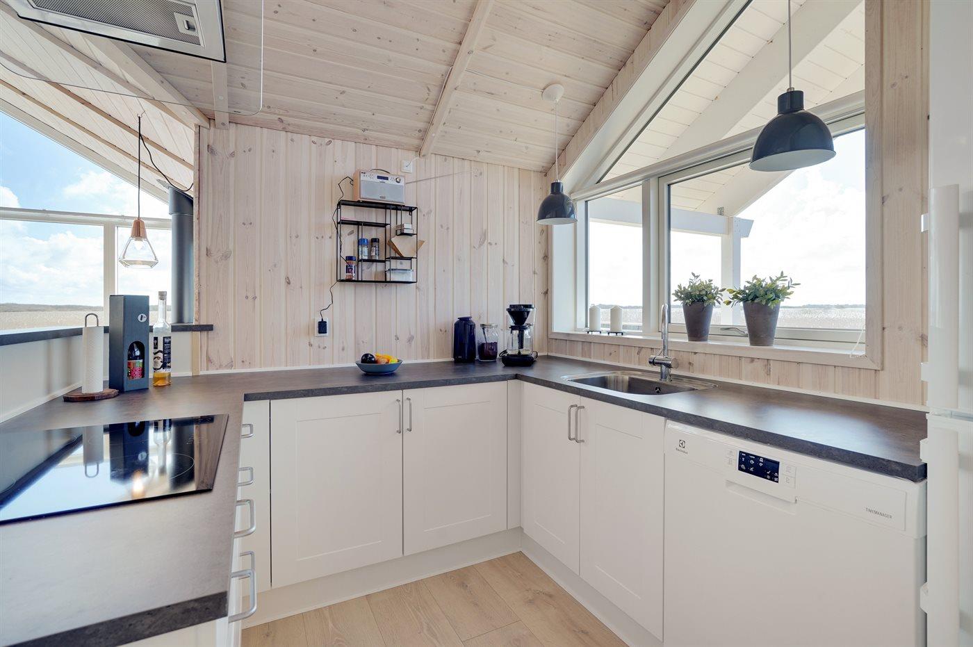 Køkkenet er udstyret med 1 køleskab. Der er 4 keramiske kogeplader, varmluftovn, mikrobølgeovn samt opvaskemaskine.