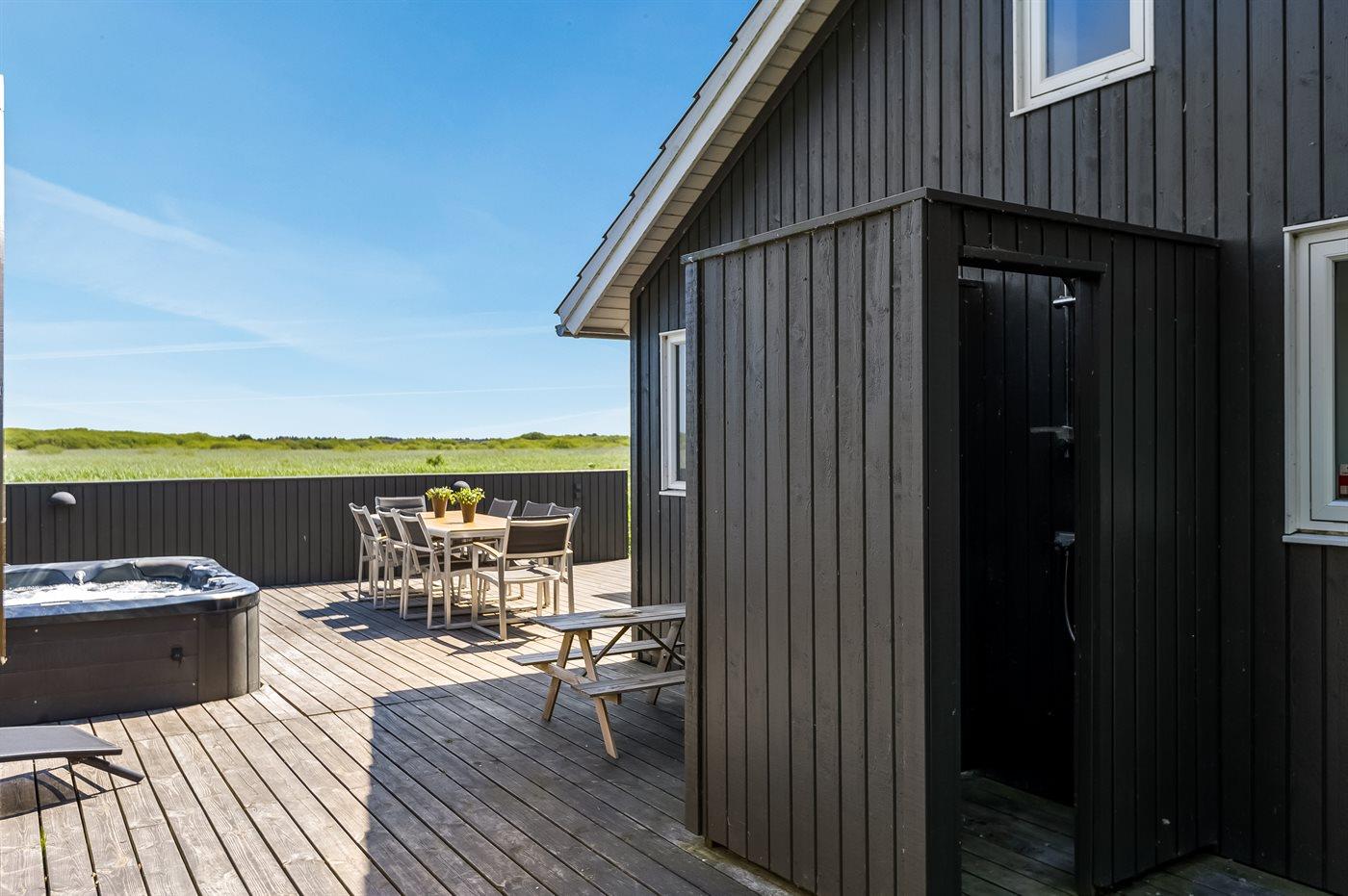 Nybygget sommerhus på stor naturgrund tæt ved havet med spa og sauna for afslappende ferie.