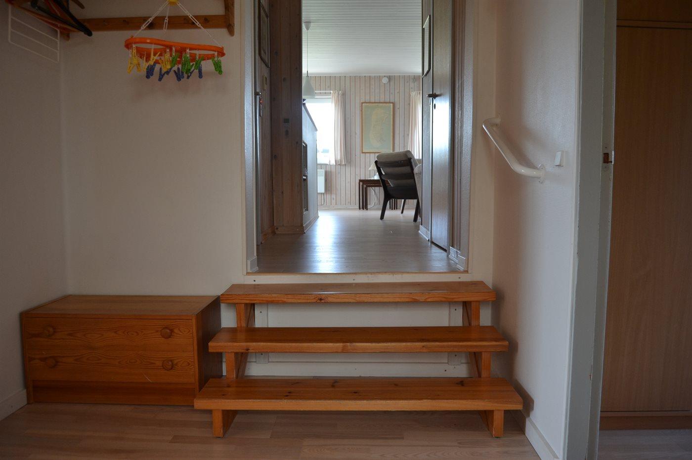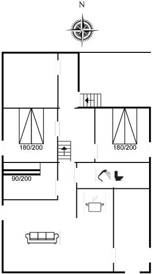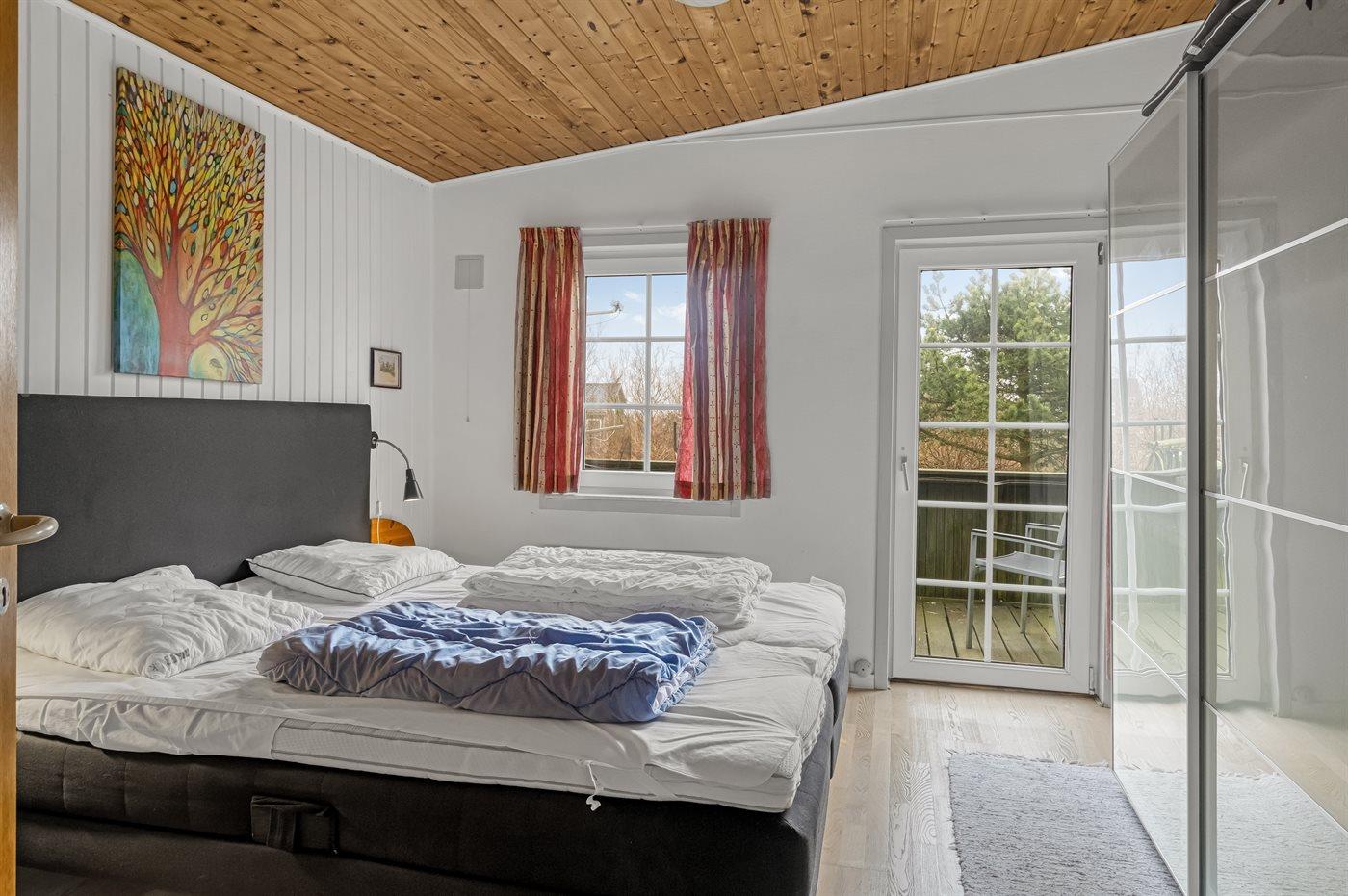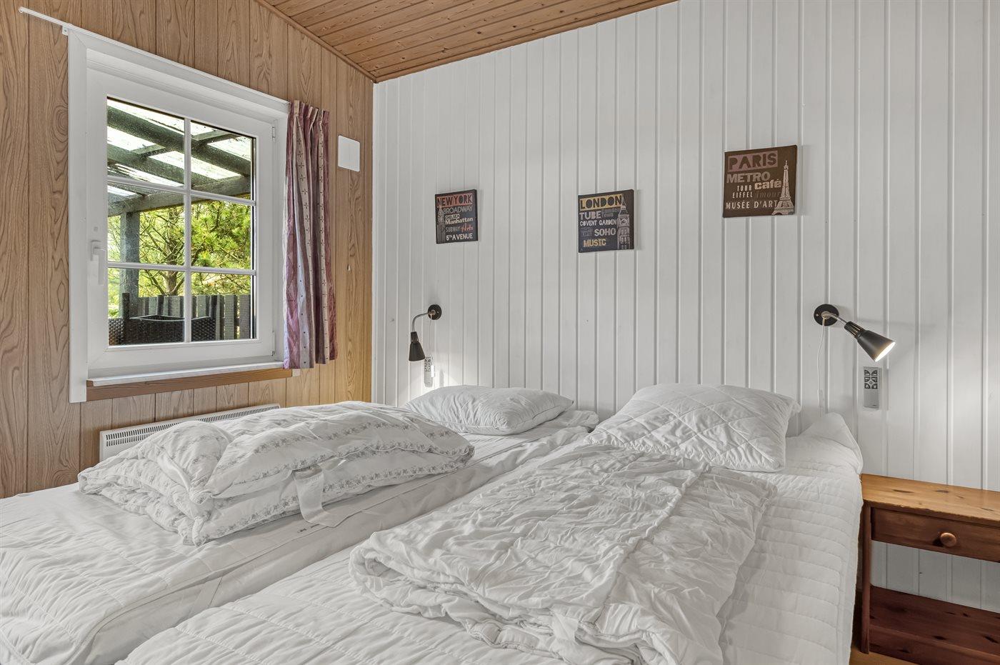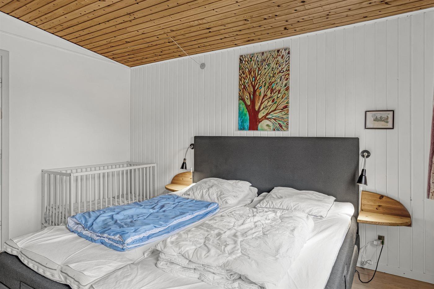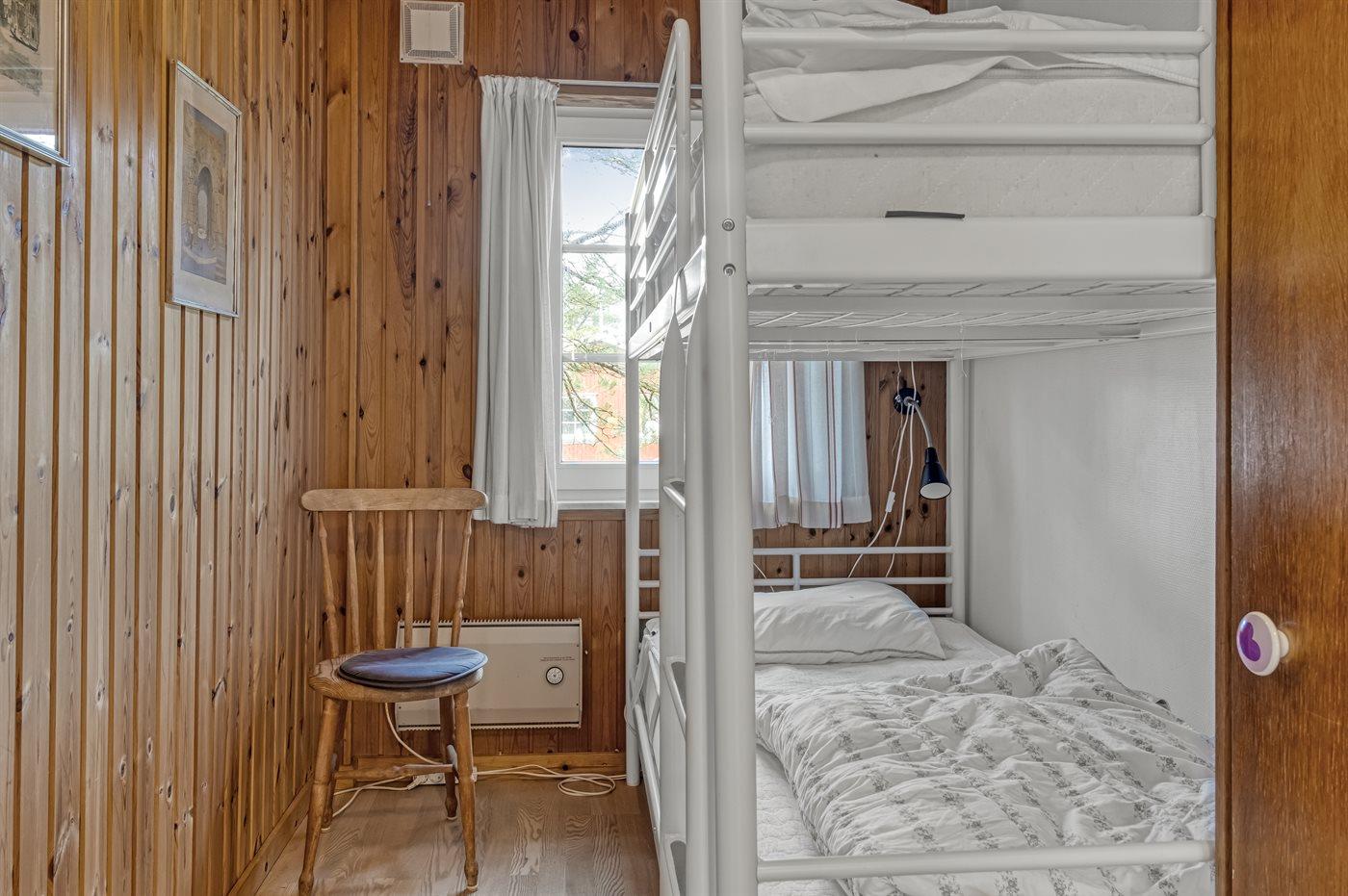 Der er i alt 3 soveværelser. Sovepladserne fordeler sig på: 4 sovepladser i dobbeltsenge. 2 sovepladser i køjeseng. Derudover er der 1 stk. barneseng.