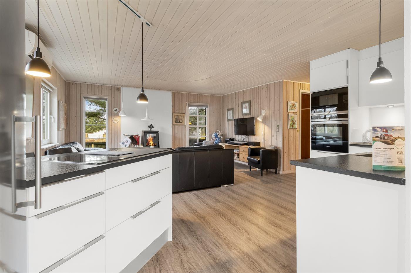 Køkkenet er udstyret med 1 køleskab. Der er 4 keramiske kogeplader, bageovn, mikrobølgeovn samt opvaskemaskine.
