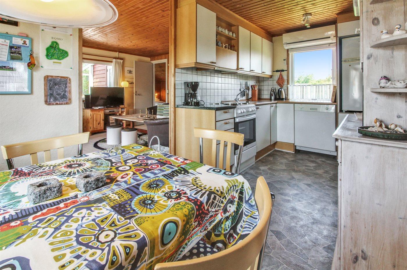 Køkkenet er udstyret med 1 køleskab. Der er 4 elkogeplader, varmluftovn, mikrobølgeovn samt opvaskemaskine.