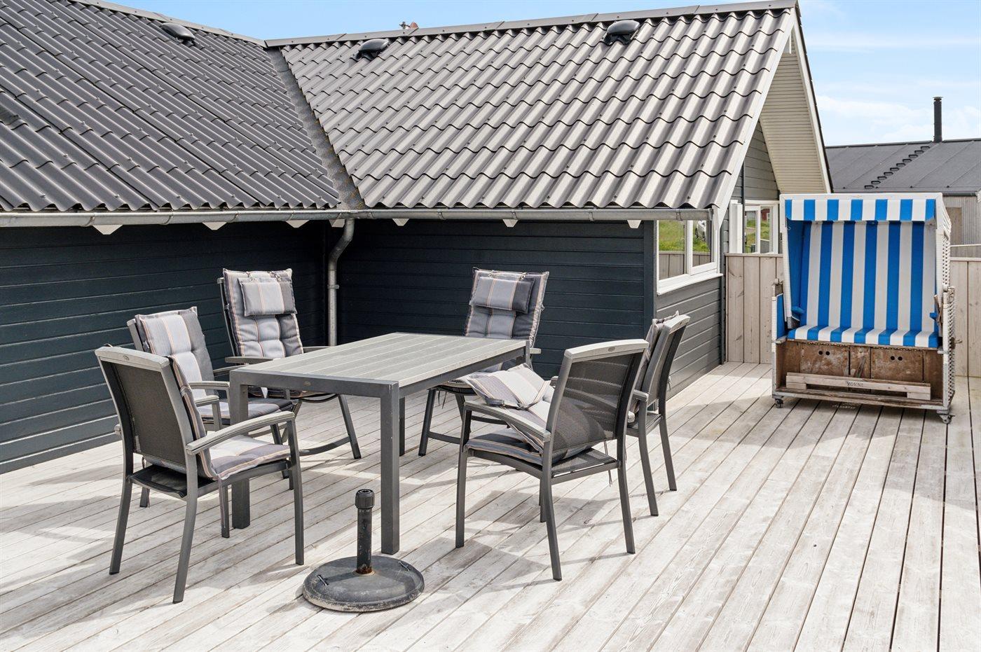Ferieboligen er beliggende på en 1050 m² stor klitgrund. Der er 200 m til havet. Der er 3900 m til Vadehavet. Nærmeste forretning er beliggende i en afstand af 700 m. Der er en golfbane i en afstand af 7600 m. Til ferieboligen hører 40 m² terrasseareal. Heraf i alt 40 m² lukket terrasse. Gynge. Sandkasse. Parkering ved ferieboligen.