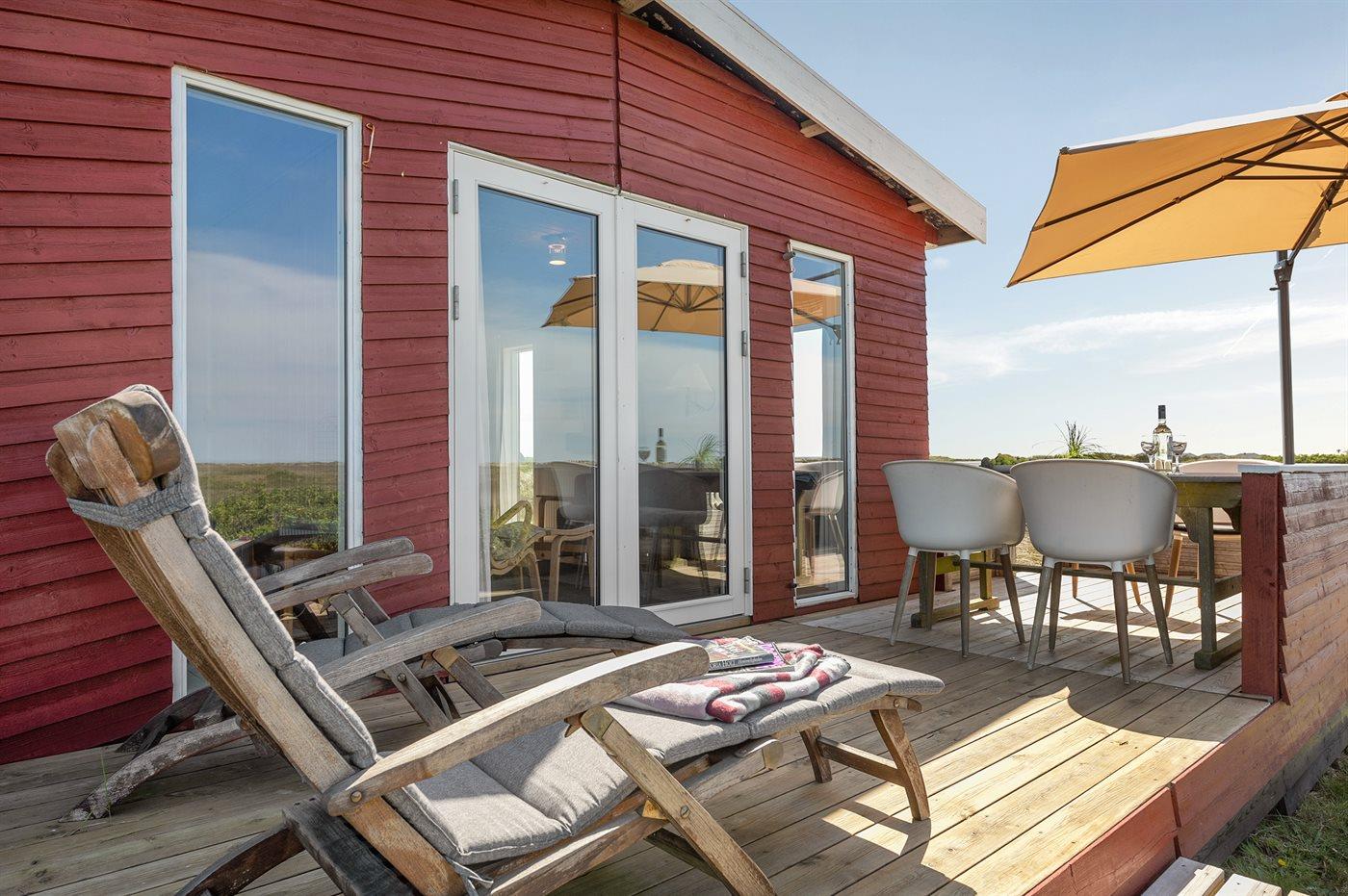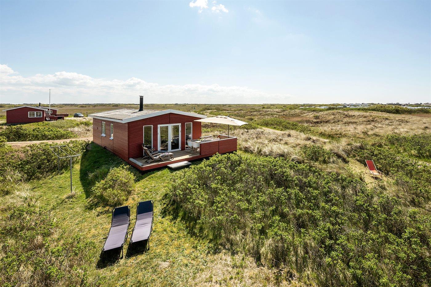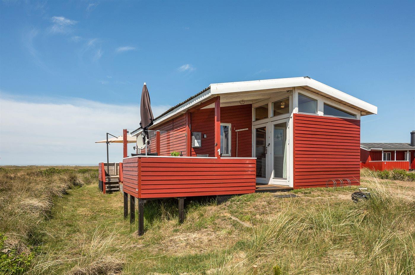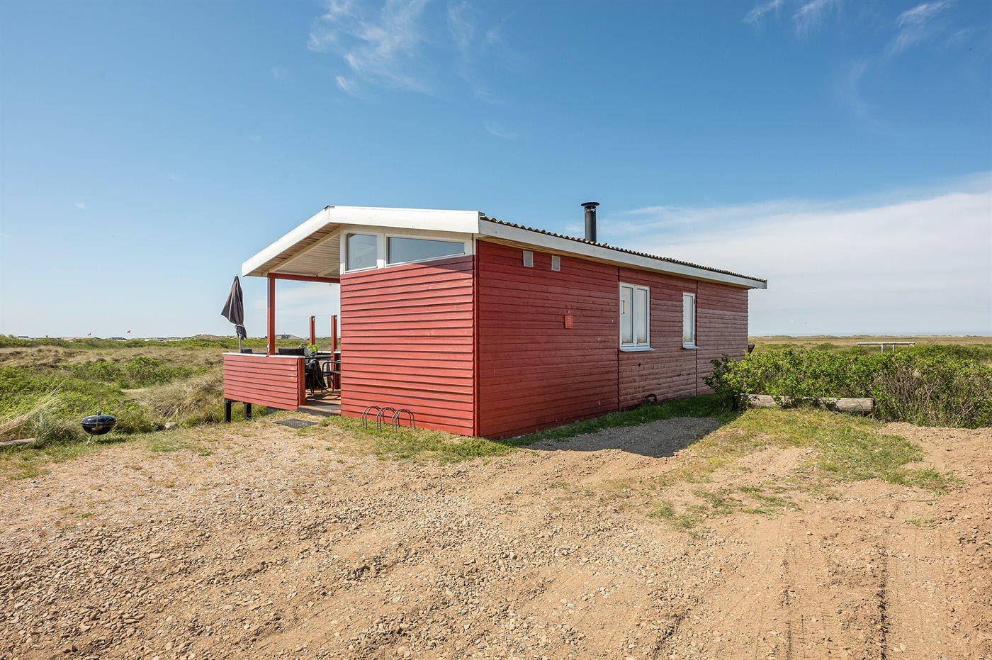 Dette dejlige, lille sommerhus i træ, bygget i 1950 og løbende renoveret, ligger på en kuperet naturgrund med en fantastisk, ugeneret udsigt over Vesterhavet. Til huset hører såvel åben som overdækket terrasse med havemøbler.