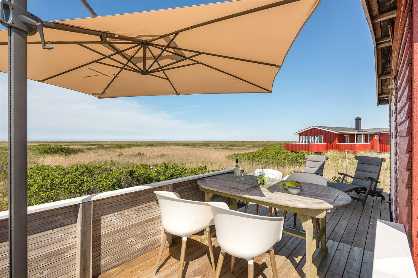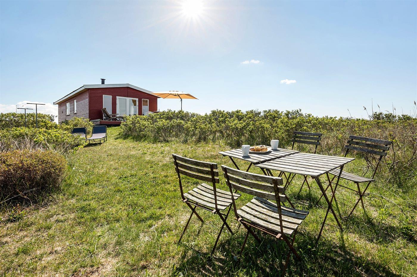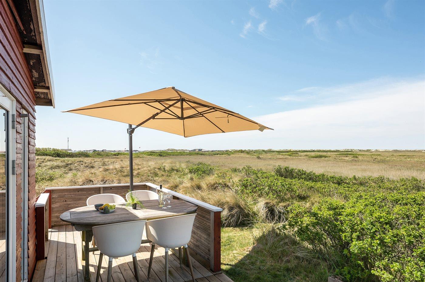 Dette dejlige, lille sommerhus i træ, bygget i 1950 og løbende renoveret, ligger på en kuperet naturgrund med en fantastisk, ugeneret udsigt over Vesterhavet. Til huset hører såvel åben som overdækket terrasse med havemøbler.
