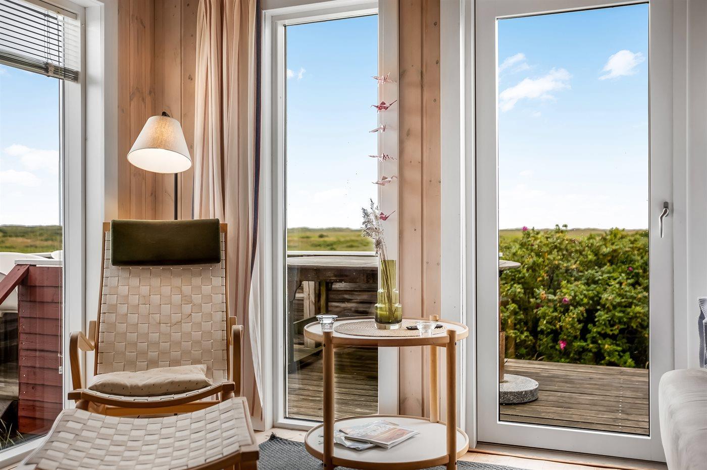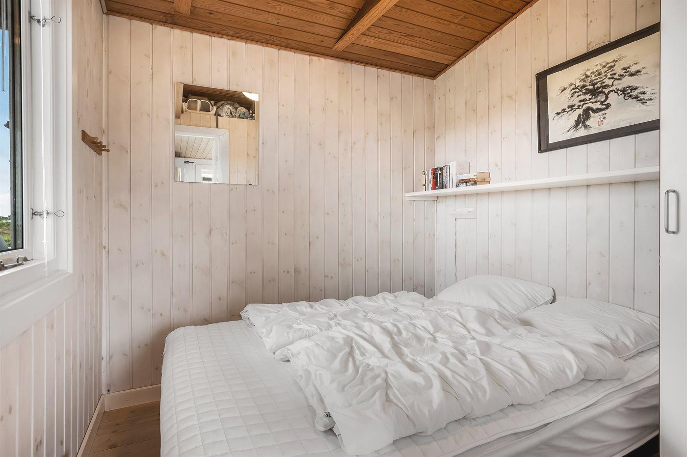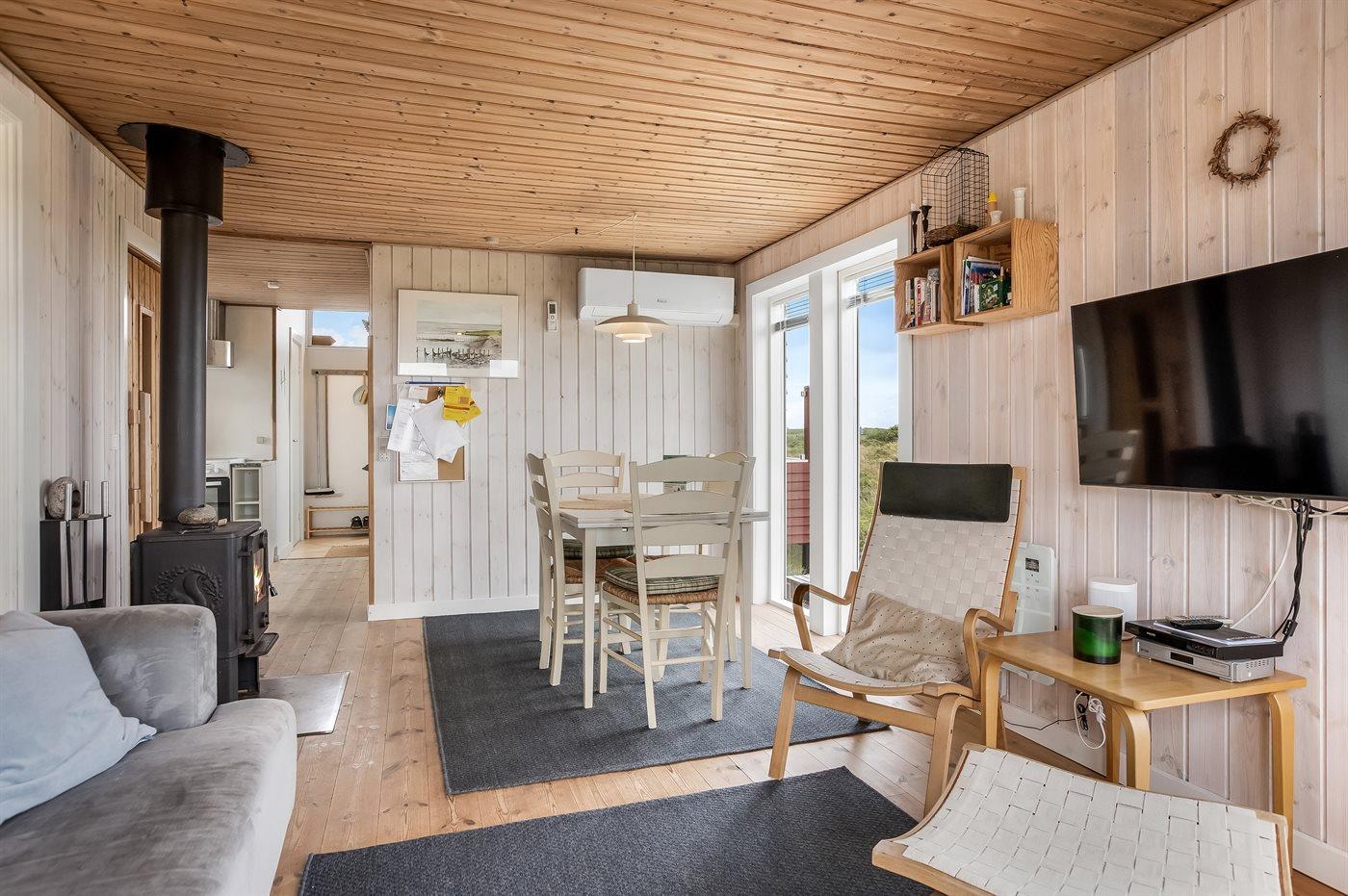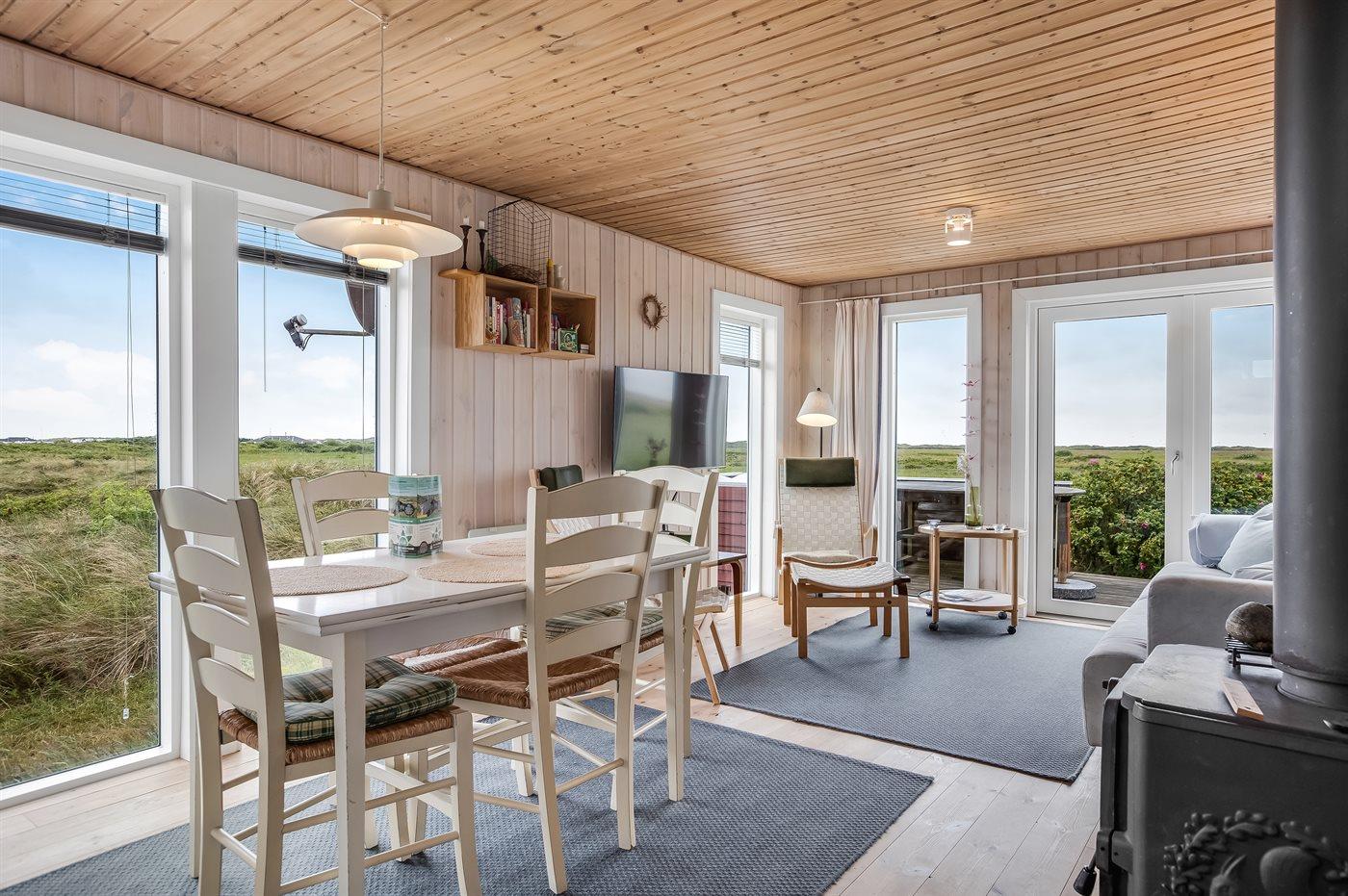 Dette dejlige, lille sommerhus i træ, bygget i 1950 og løbende renoveret, ligger på en kuperet naturgrund med en fantastisk, ugeneret udsigt over Vesterhavet. Til huset hører såvel åben som overdækket terrasse med havemøbler.
