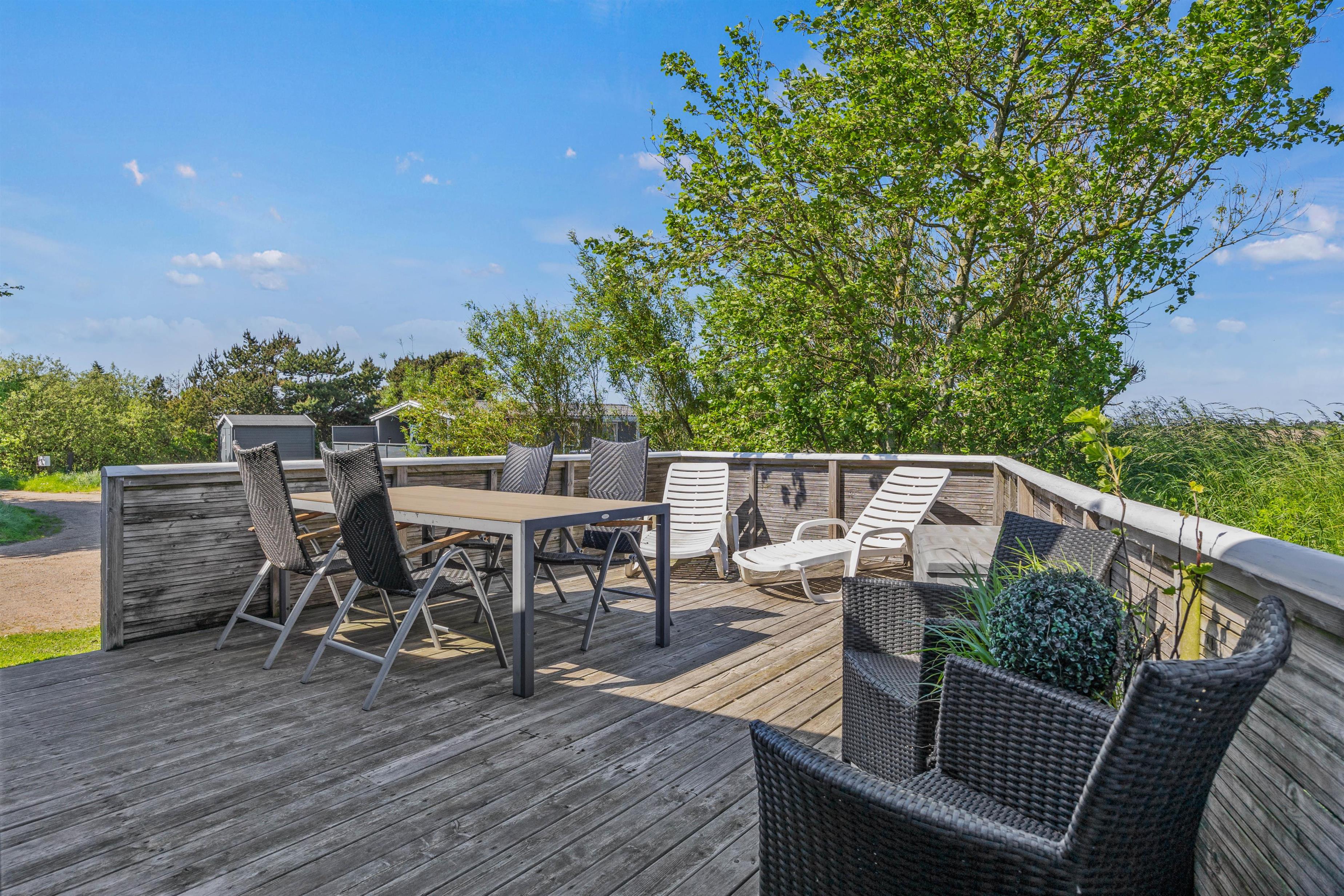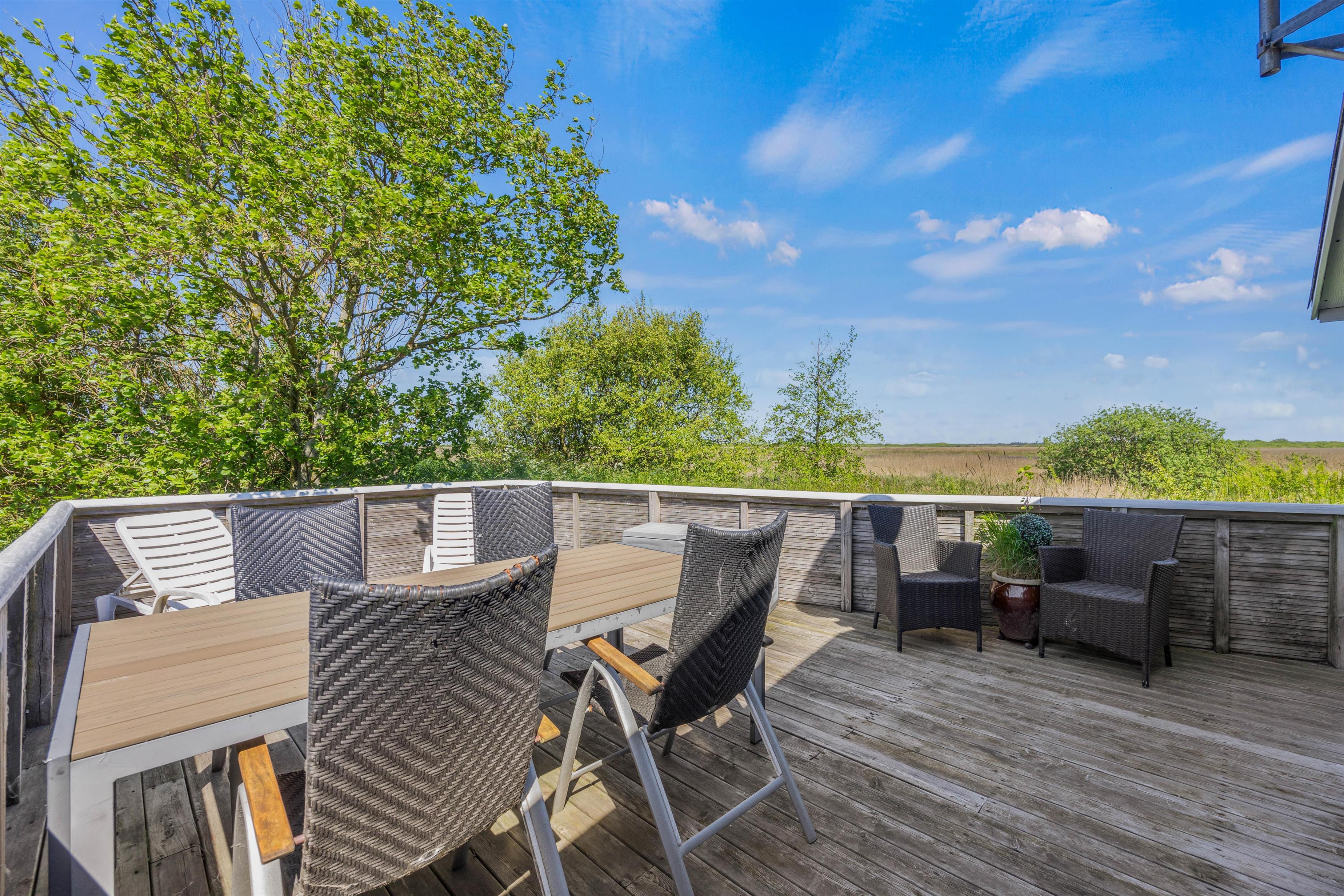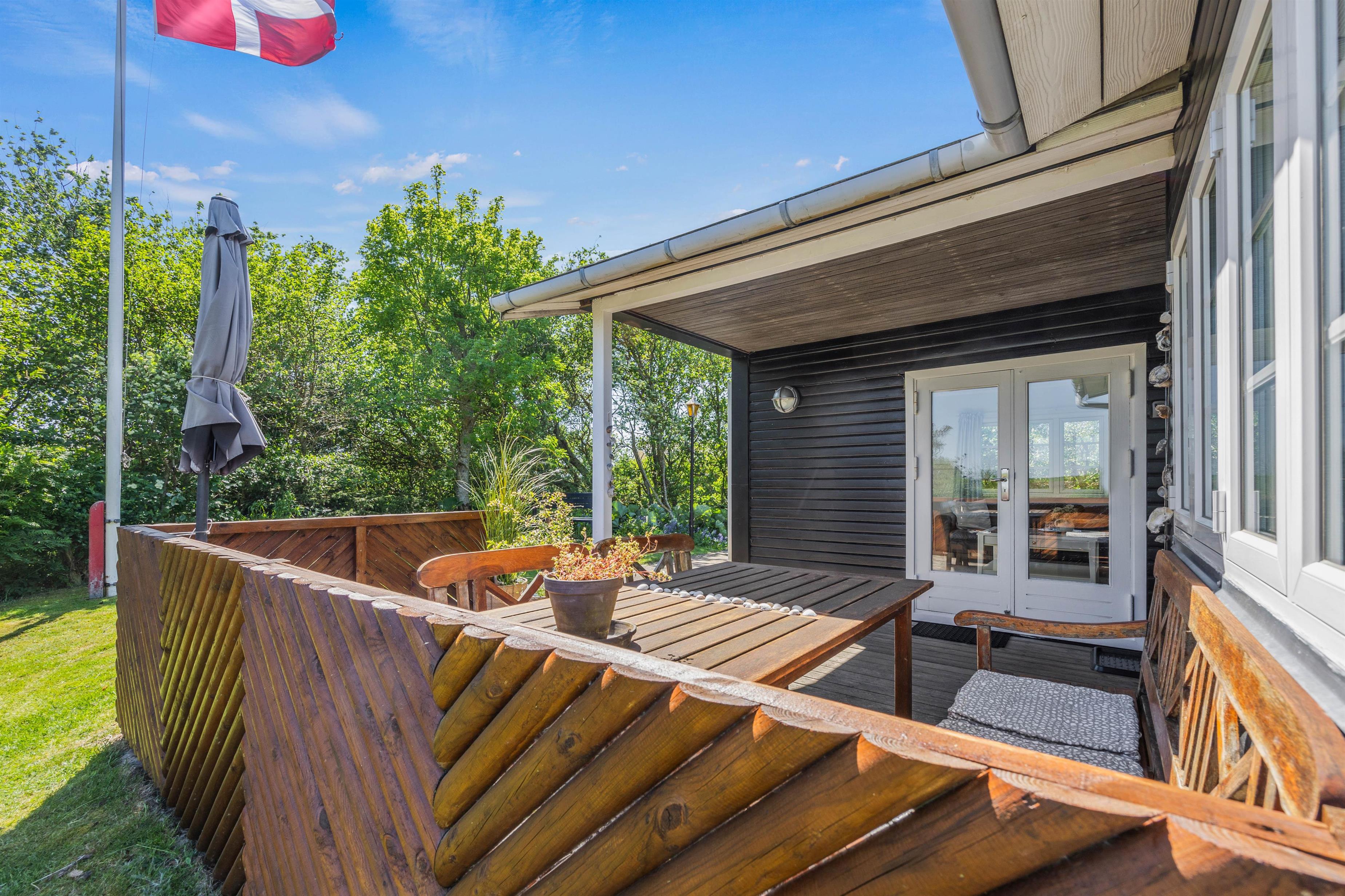 Udenfor findes en stor, delvist overdækket terrasse med siddepladser til solrige dage og hyggelige sommeraftener. Her kan I nyde varmen, morgenkaffen og ikke mindst roen. De rolige omgivelser og den smukke udsigt er helt fortryllende. Saml familien og slut aftenen af med en dejlig grillaften.