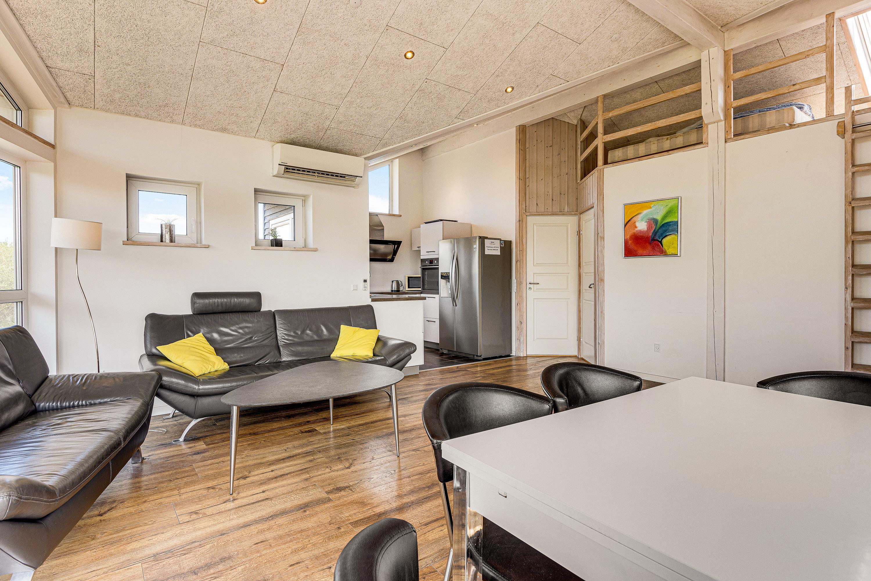 Sommerhuset er lyst og venligt indrettet. Vinduerne fra gulv til loft samt loft til kip sørger for en behagelig atmosfære og tillader dagslyset at oversvømme opholdsrummet. Fra den komfortable sofa kan I nyde udsigten til landskabet eller se jeres yndlingsfilm i fjernsynet. Her er desuden danske tv-kanaler. Den energibesparende varmepumpe sørger for en behagelig temperatur.