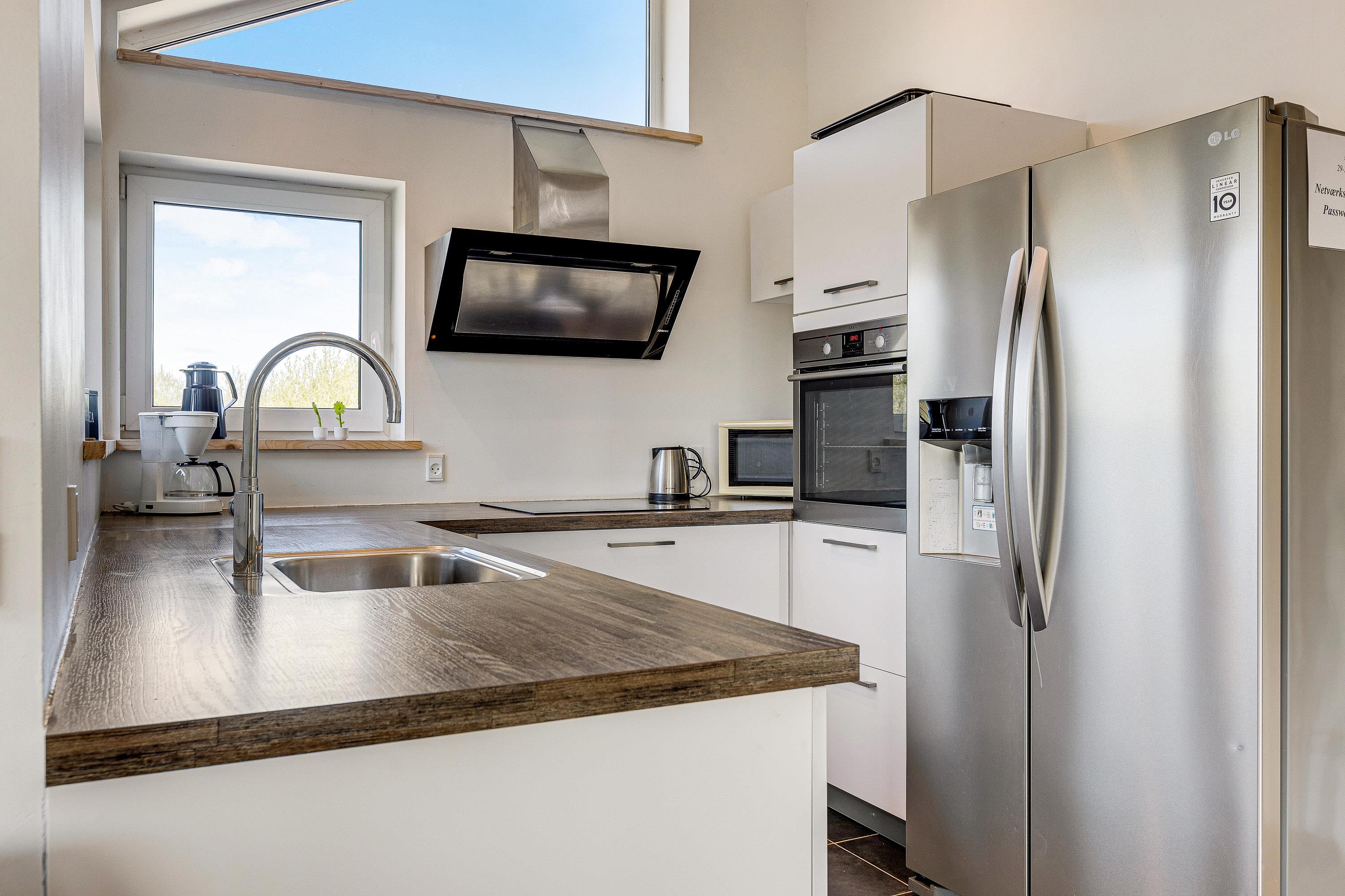 Det åbne køkken, der ligger i forbindelse med opholdsstuen, er praktisk udstyret med opvaskemaskine samt induktionskomfur og inviterer dig til at tilberede familiens yndlingsretter.