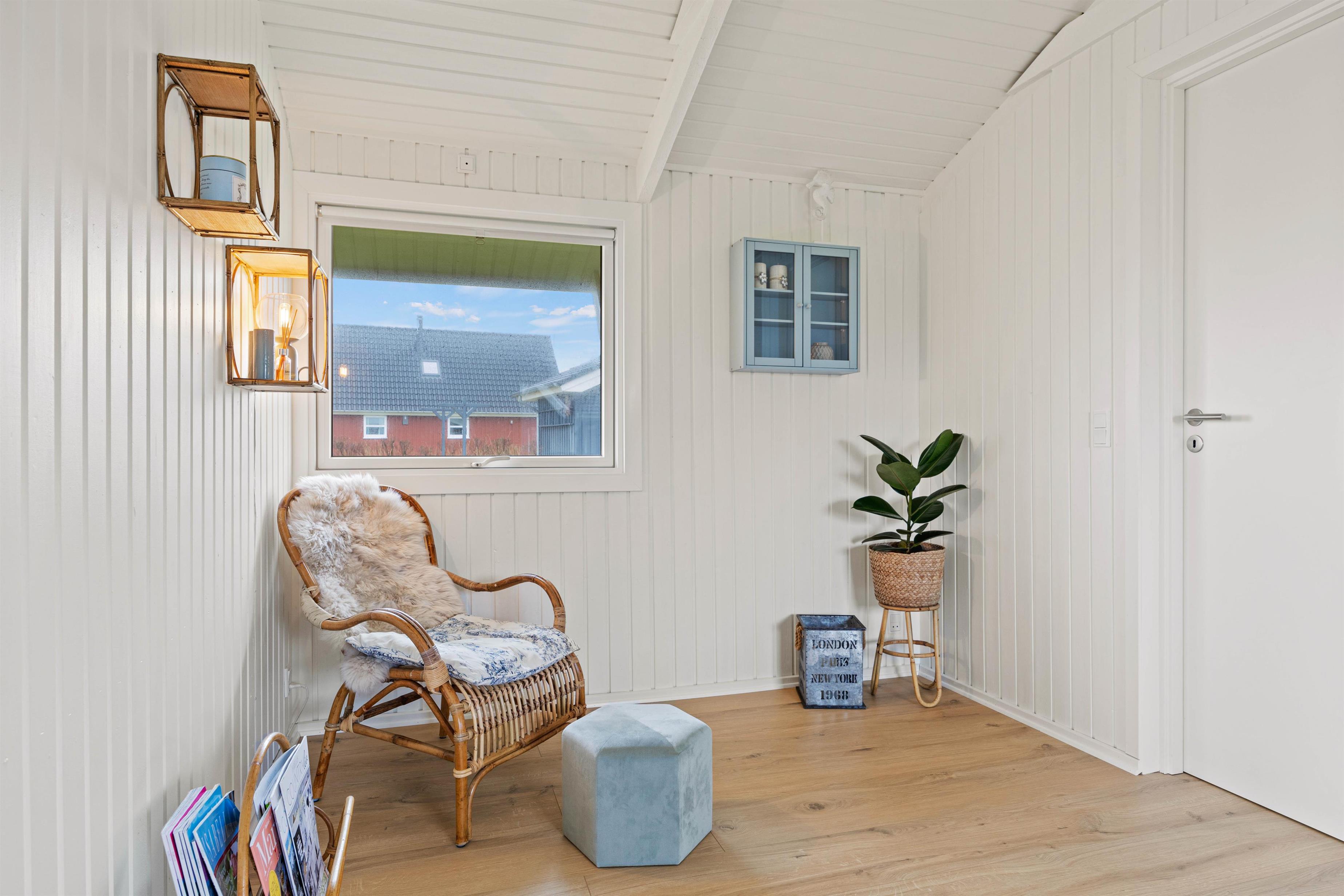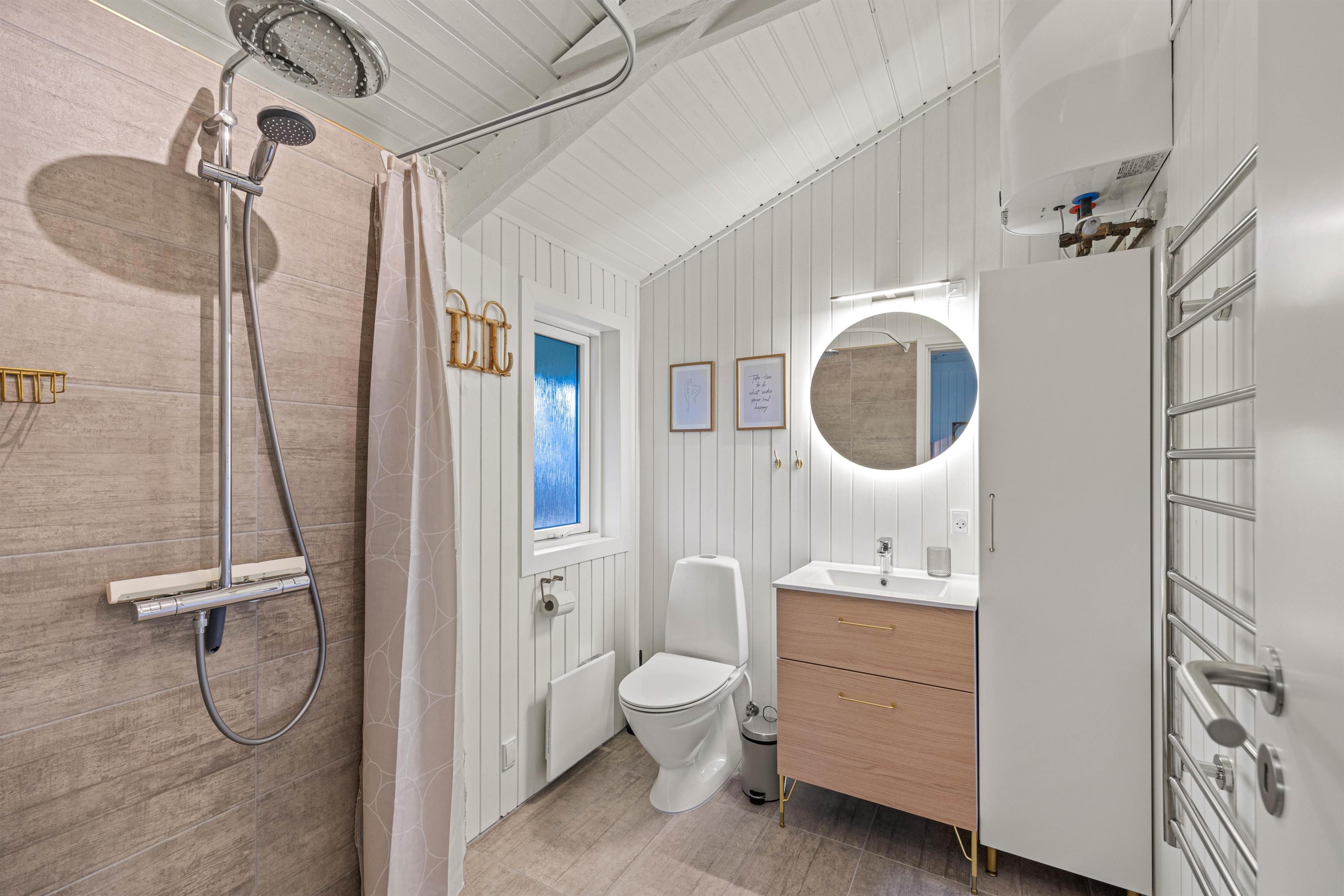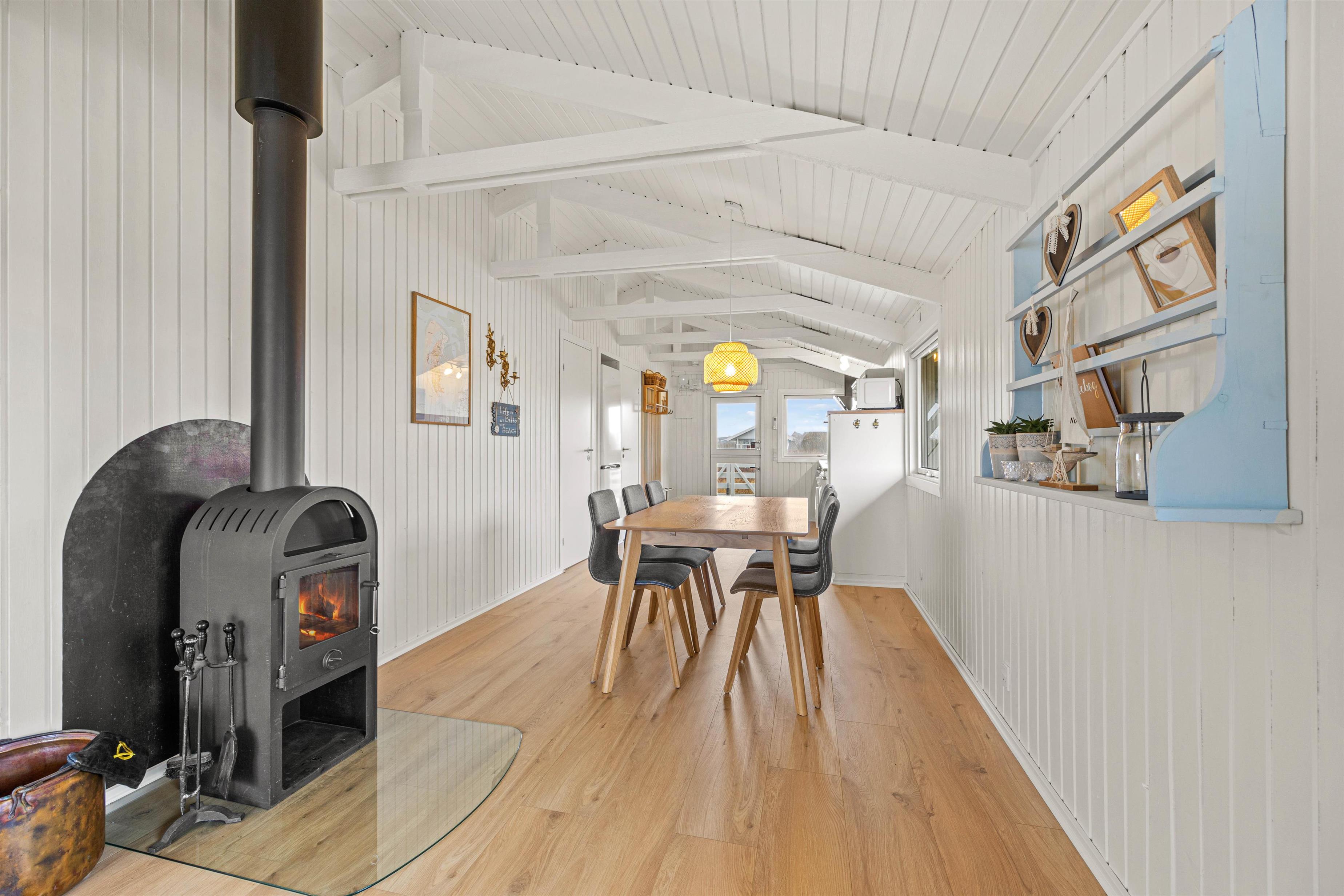 Samlingspunktet inden døre bliver dog køkkenalrummet, hvor køkken, spiseplads og stue er i forlængelse af hinanden. I køkkenet kan der tilberedes lækker mad, der senere skal en tur på gasgrillen eller måske bages en kage til kaffen? Den kedelige opvask klares heldigvis af opvaskemaskinen. Rummets store glasdøre og vinduer bidrager med masser af dagslys, mens brændeovnens placering i midten skaber en naturlig opdeling mellem køkken og stue. På denne måde spredes dens varme og hygge også i hele rummet. Slå efterfølgende benene op i sofaen med en god bog eller hyg med jeres yndlingsbrætspil ved spisebordet– alt imens pejsens varme og hygge spredes. Stuen har desuden en energibesparende varmepumpe, mens I til højre for indgangen har adgang til et lille separat opbevaringsrum, der også indeholder en tørretumbler.