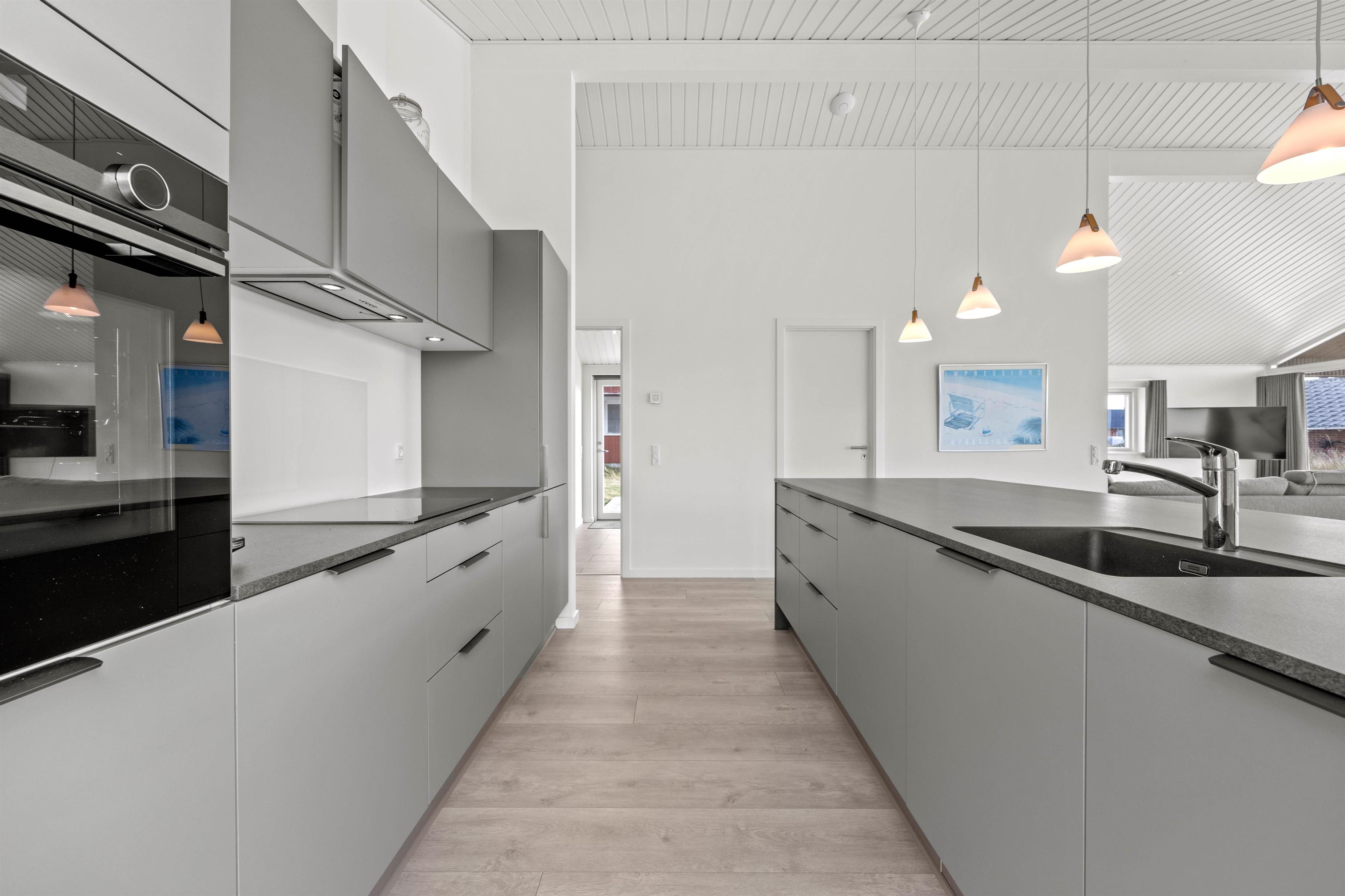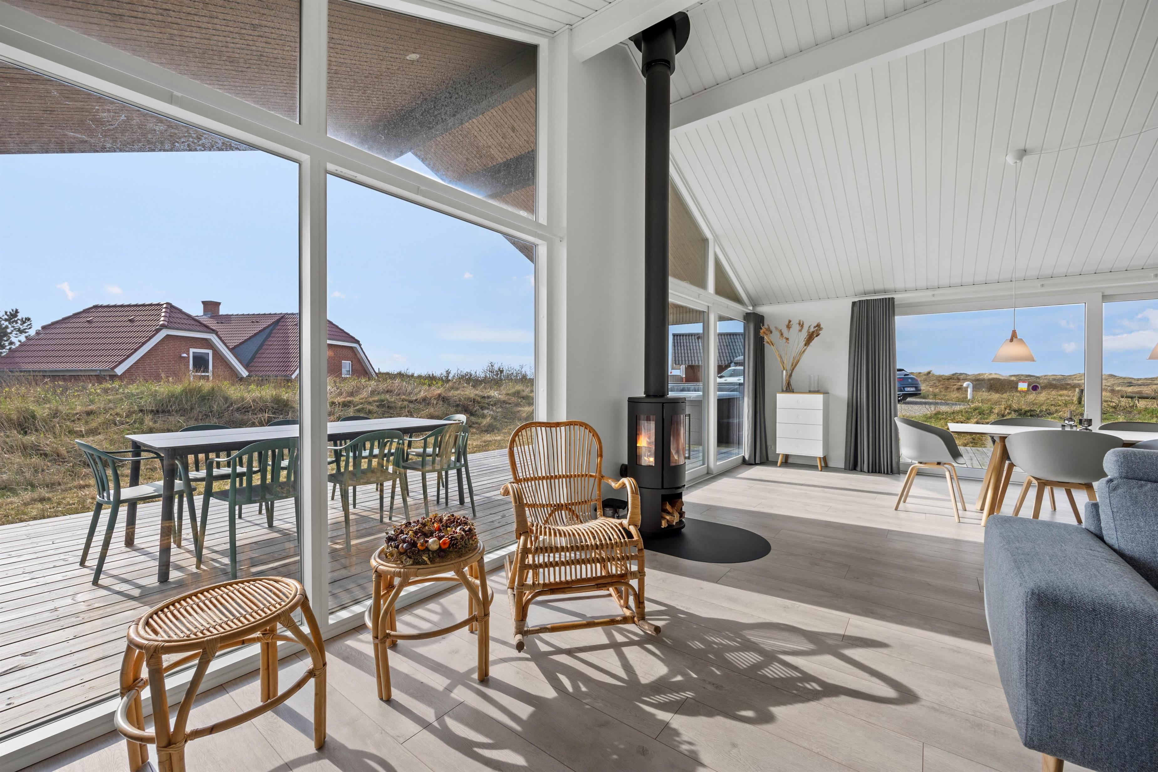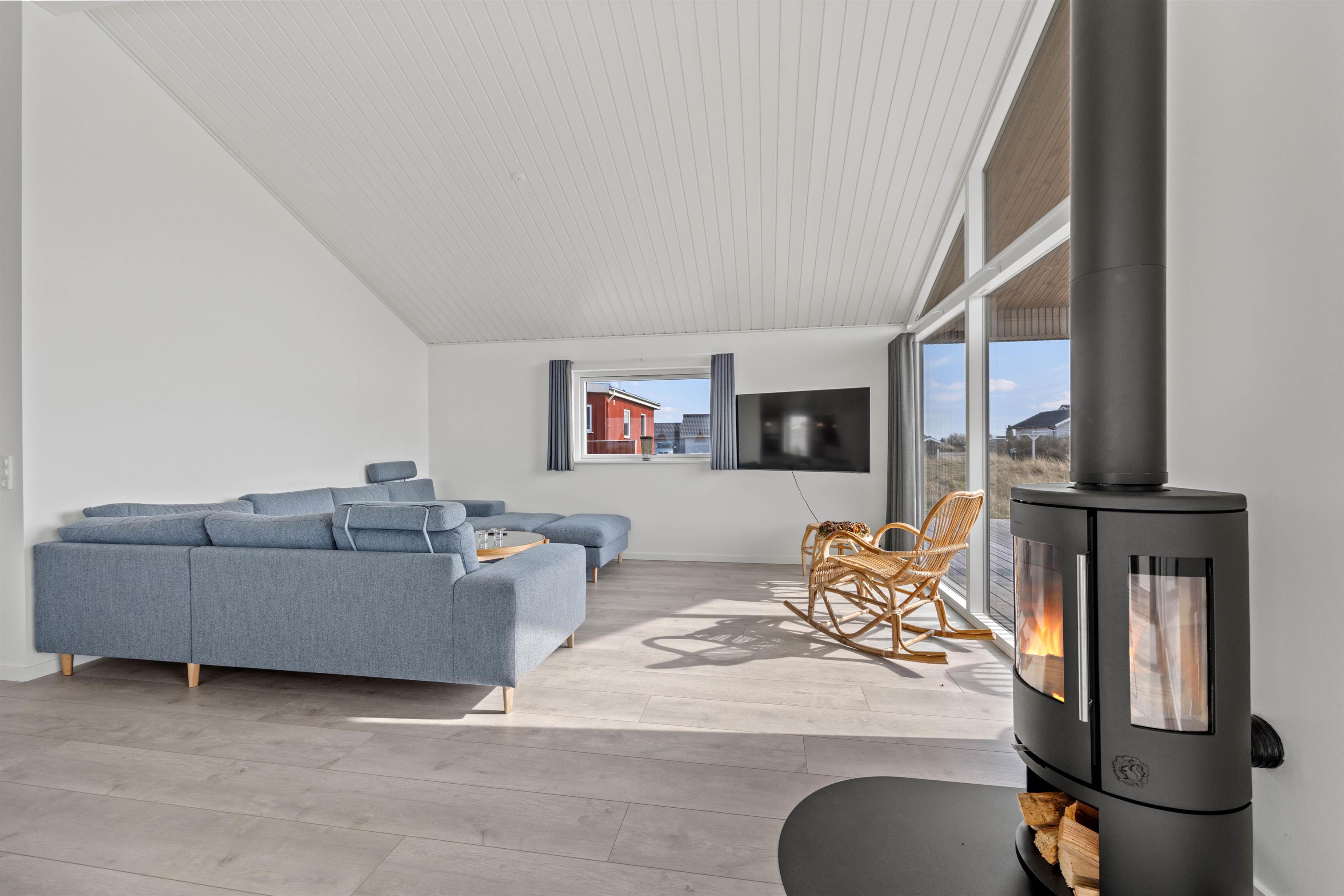 Sommerhuset er lyst og moderne indrettet, og sammen med de store vinduespartier i alrummet giver det en indbydende atmosfære i rummet. Den åbne planløsning giver jer mere tid sammen som familie, da I kan fortsætte snakken og hyggen, selvom nogle står for madlavningen, og andre slapper af på sofaen. Brændeovnen sætter prikken over i’et til den hyggelige feriestemning, og der er desuden en energibesparende varmepumpe i sommerhuset.