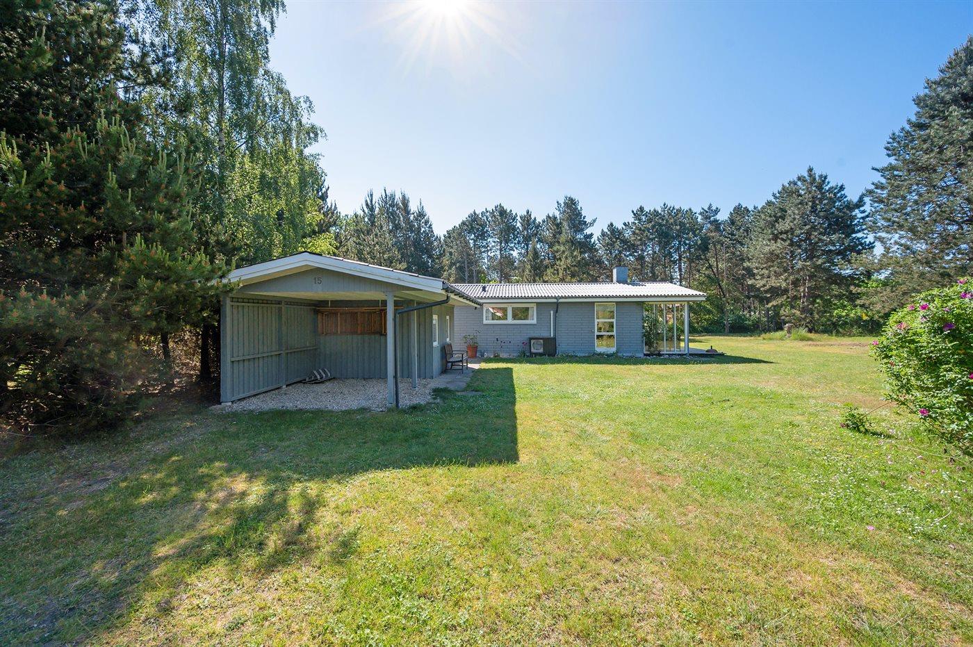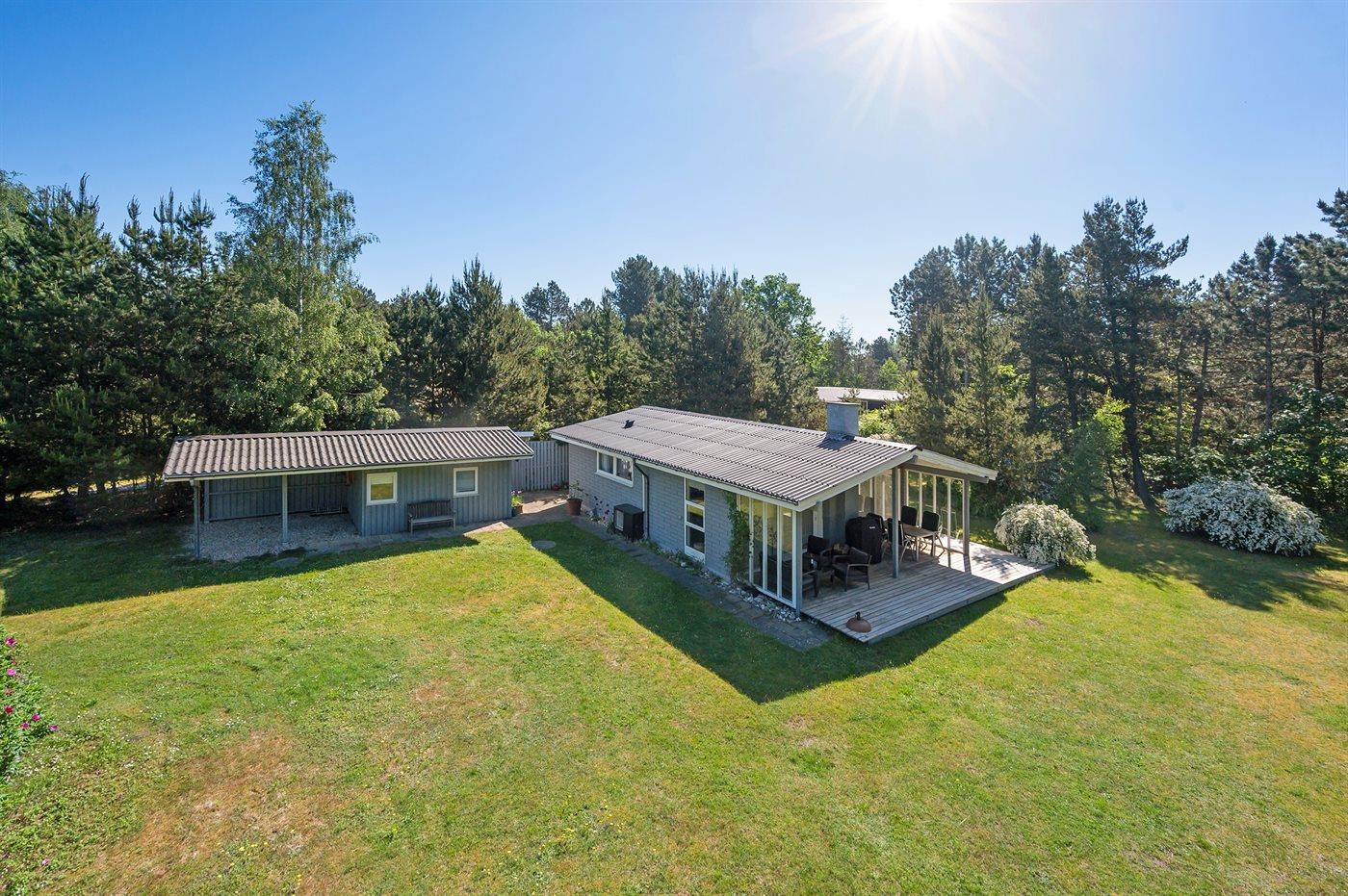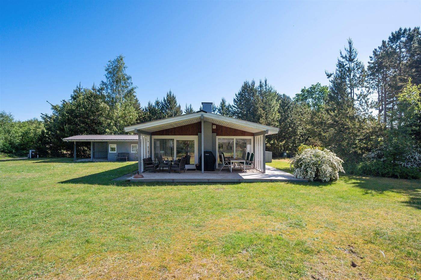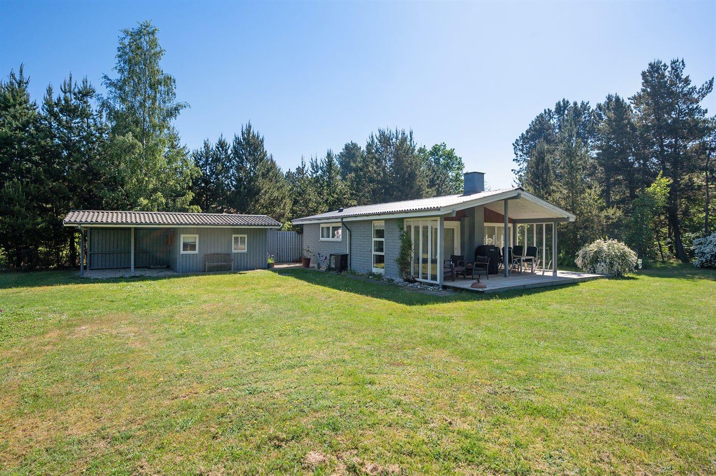 Ferieboligen er beliggende på en 1500 m² stor naturgrund. Der er 150 m til havet. Nærmeste forretning er beliggende i en afstand af 7000 m. Til ferieboligen hører 40 m² terrasseareal. Desuden er der 15 m² overdækket terrasse. Grill til rådighed. Der er carport til rådighed. Parkering ved ferieboligen.