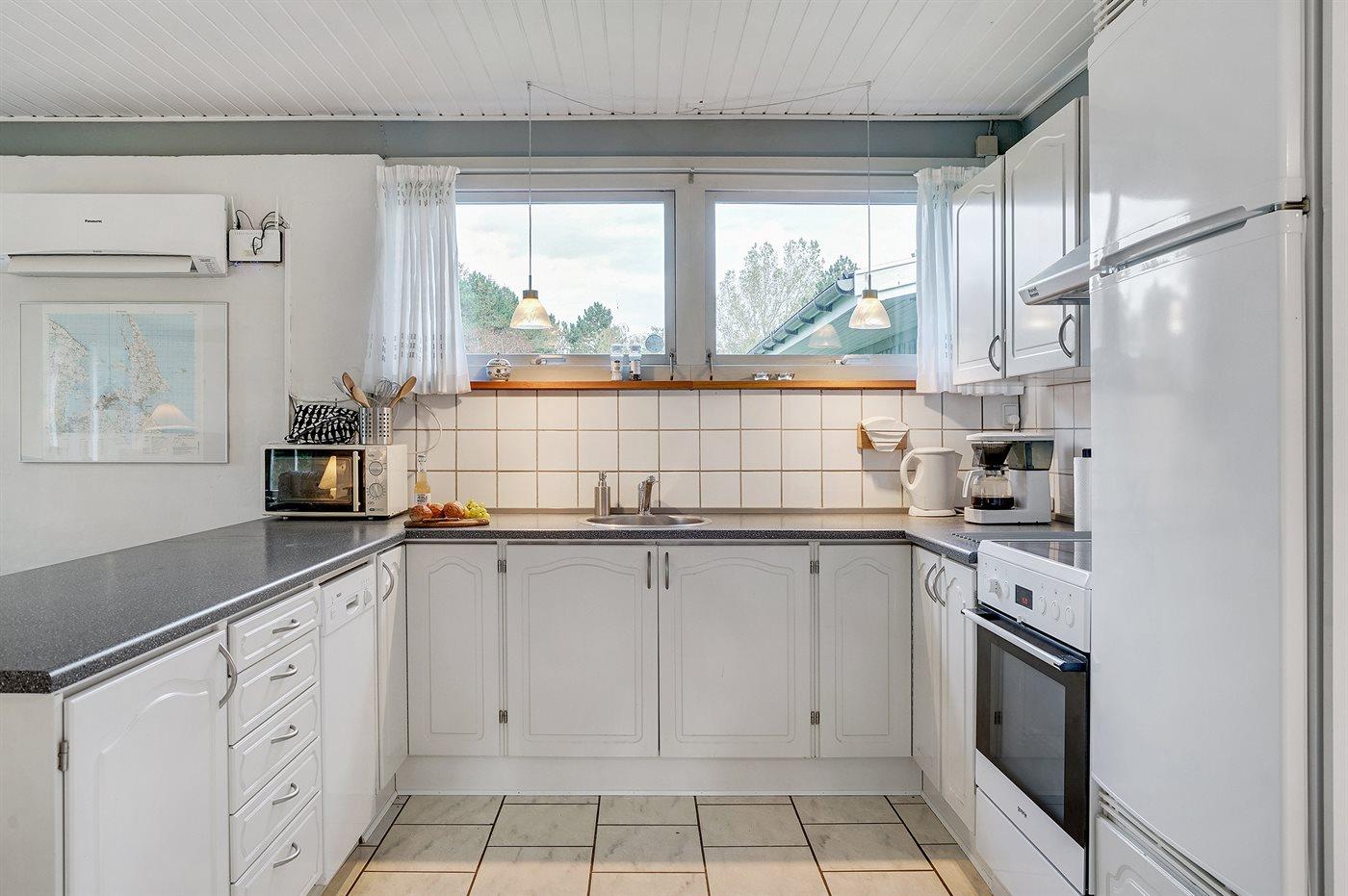 Køkkenet er udstyret med 1 køleskab. Der er 4 induktionskogeplader, varmluftovn, mikrobølgeovn samt opvaskemaskine.