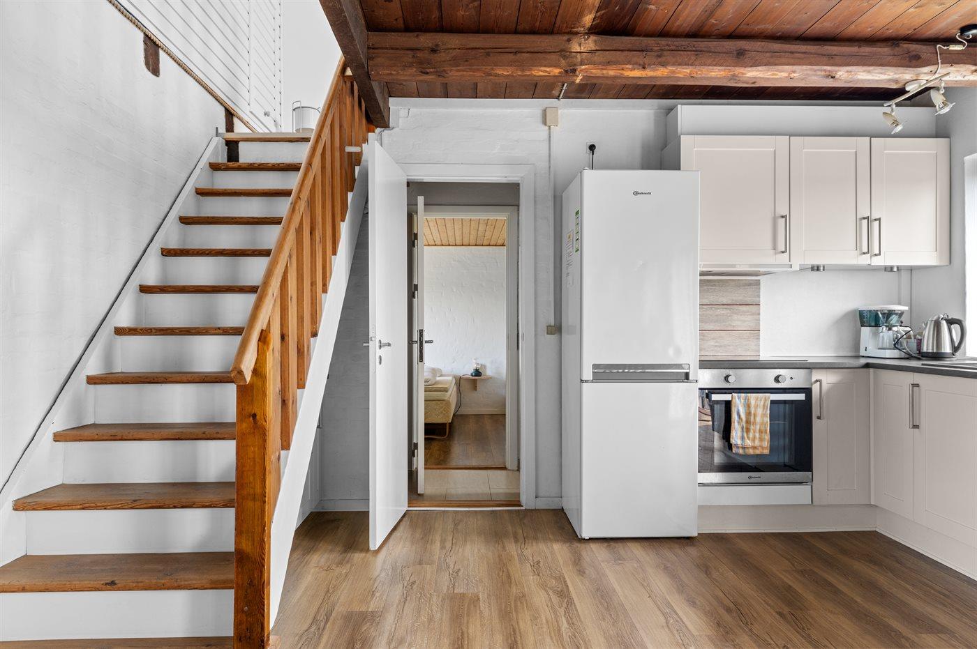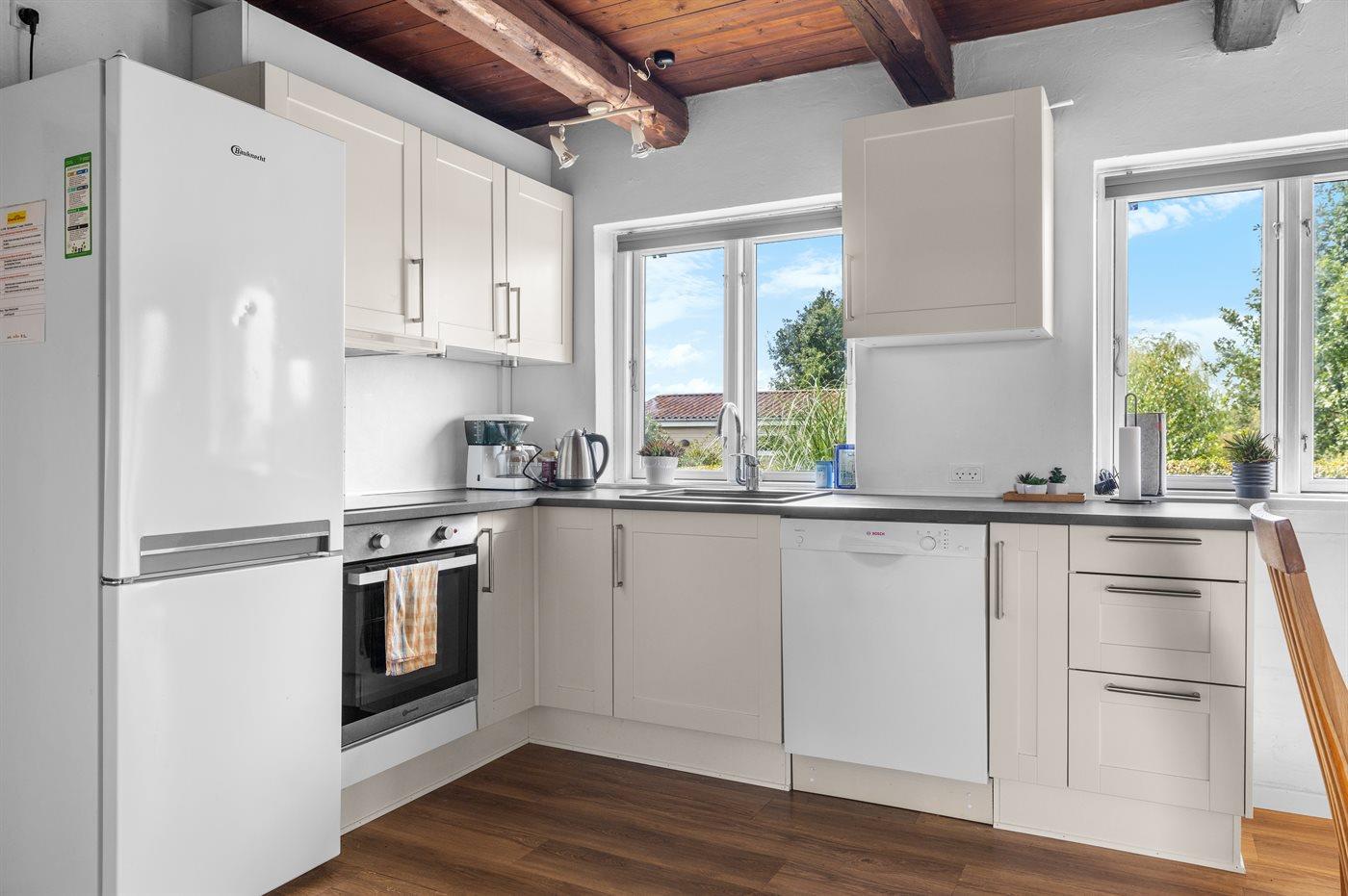 Køkkenet er udstyret med 1 køleskab. Der er 4 keramiske kogeplader, varmluftovn, mikrobølgeovn samt opvaskemaskine.