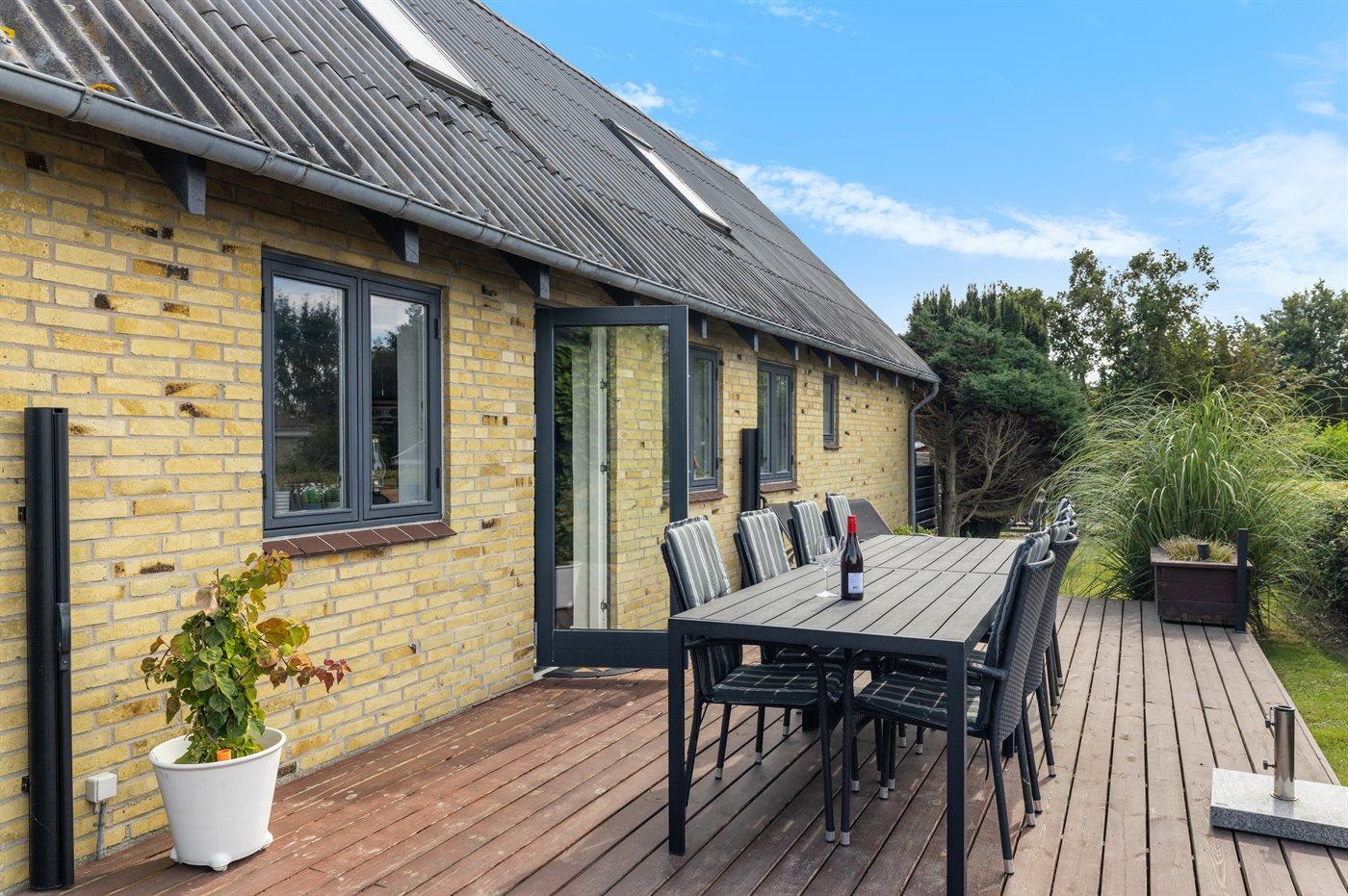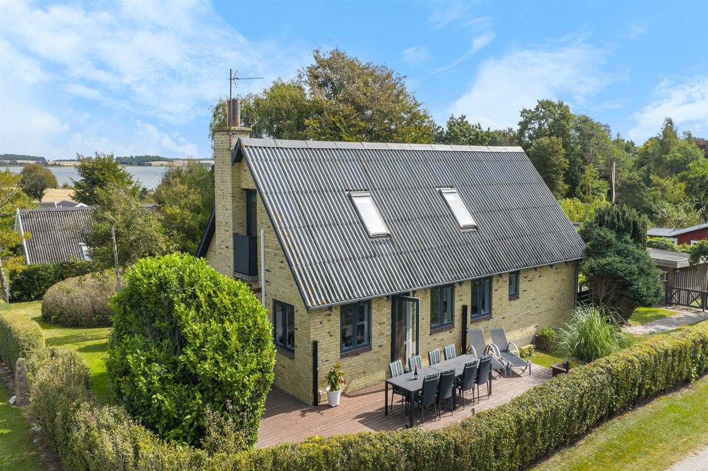 Omkring huset er der flere gode terrasser, hvoraf den største er sydvendt. Fra terrassen foran huset, er der god udsigt ud over vandet. I haven er der god plads til udendørs aktiviteter.