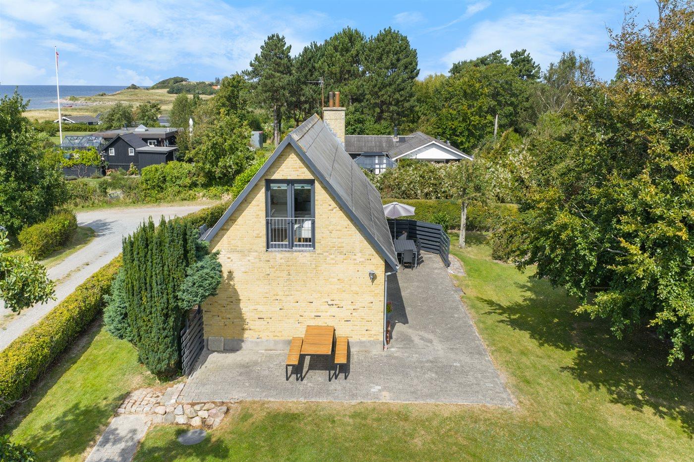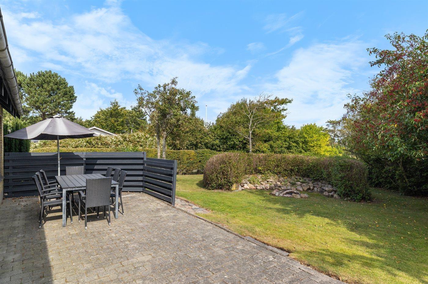 Ferieboligen er beliggende på en 1194 m² stor havegrund. Grunden er indhegnet. Der er 210 m til havet. Nærmeste forretning er beliggende i en afstand af 7800 m. Til ferieboligen hører åbent terrasseareal. Desuden er der overdækket terrasse. Gynge. Bålsted. Grill til rådighed. Parkering ved ferieboligen.