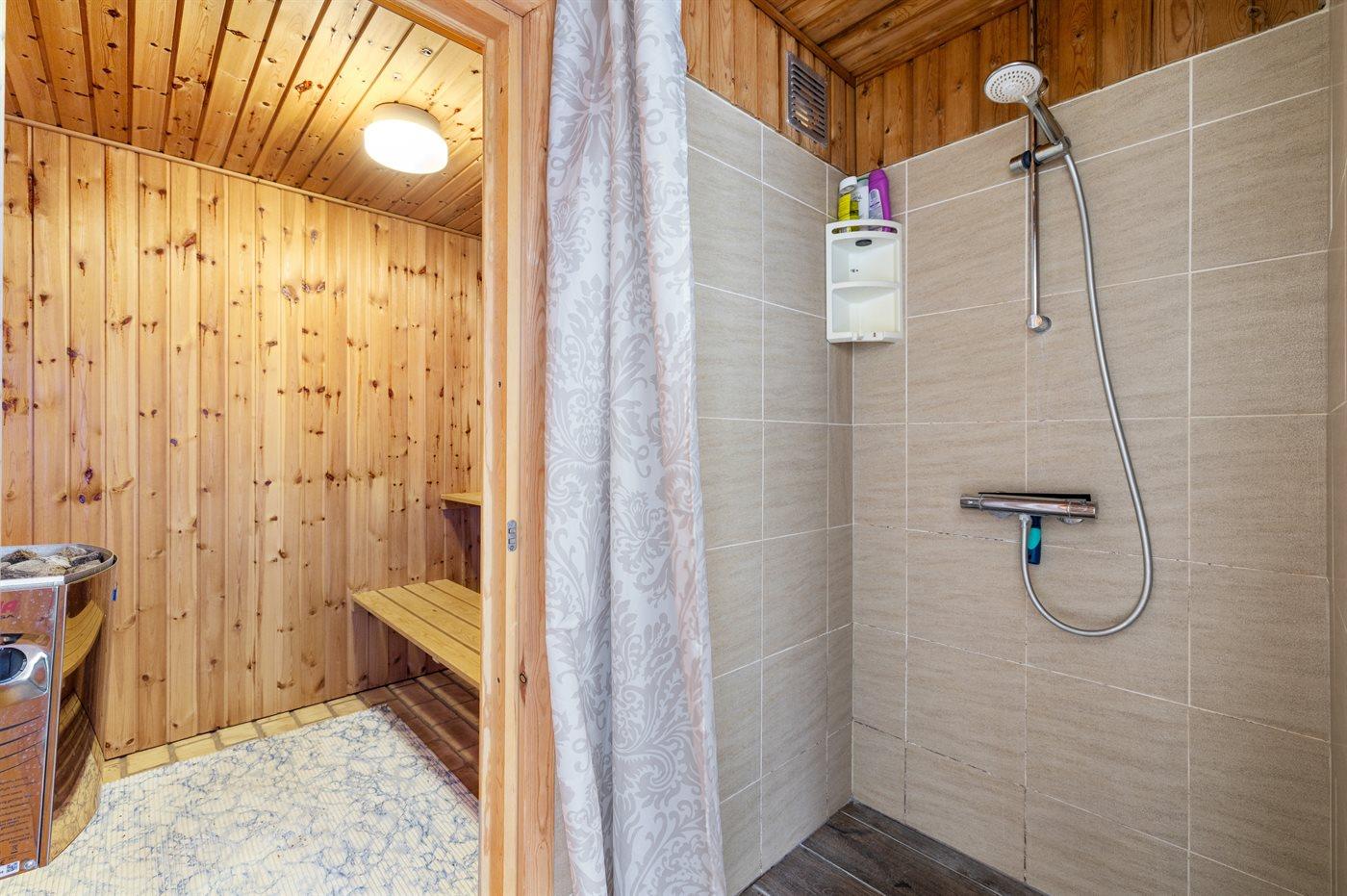 Der er 1 badeværelse med bruseniche og 1 toilet.. Der er gulvvarme på 1 badeværelse. I saunaen er der mulighed for afslapning.