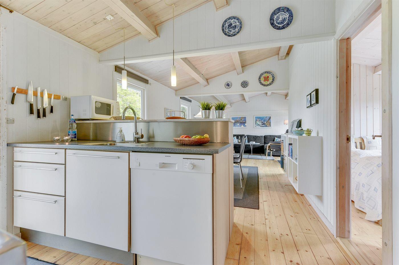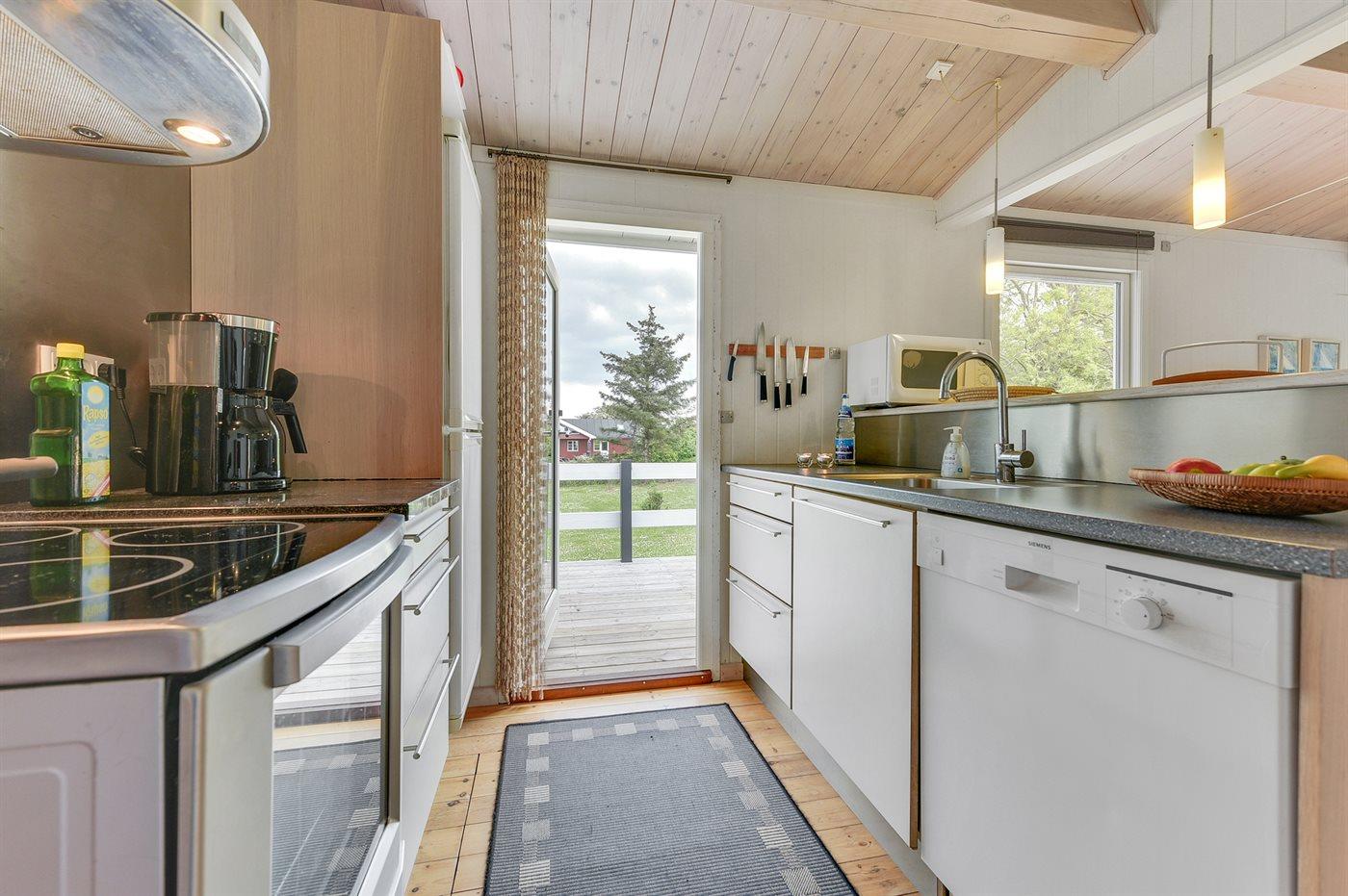 Køkkenet er udstyret med 1 køleskab. Der er 4 induktionskogeplader, varmluftovn, mikrobølgeovn samt opvaskemaskine.