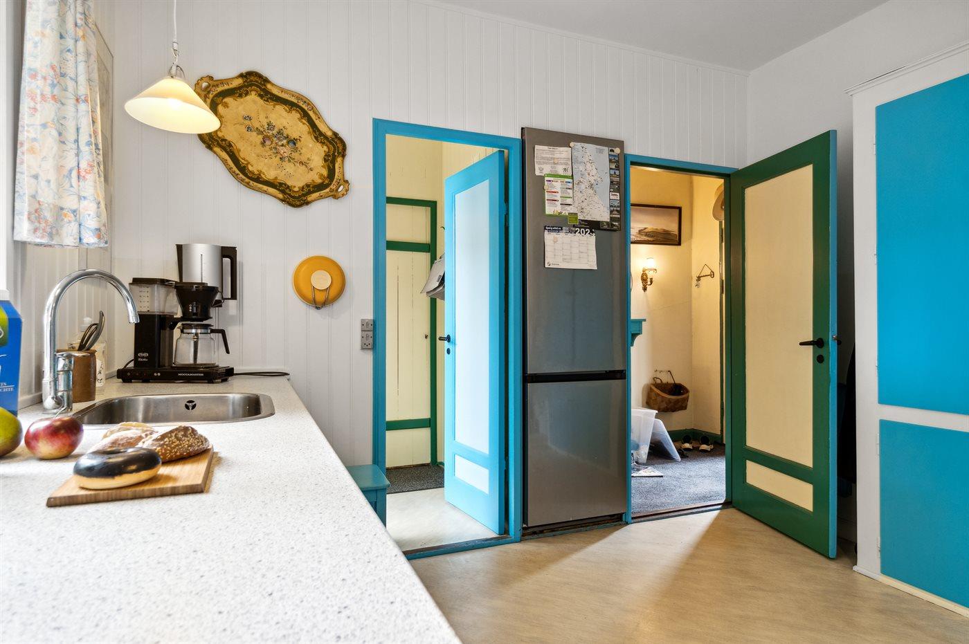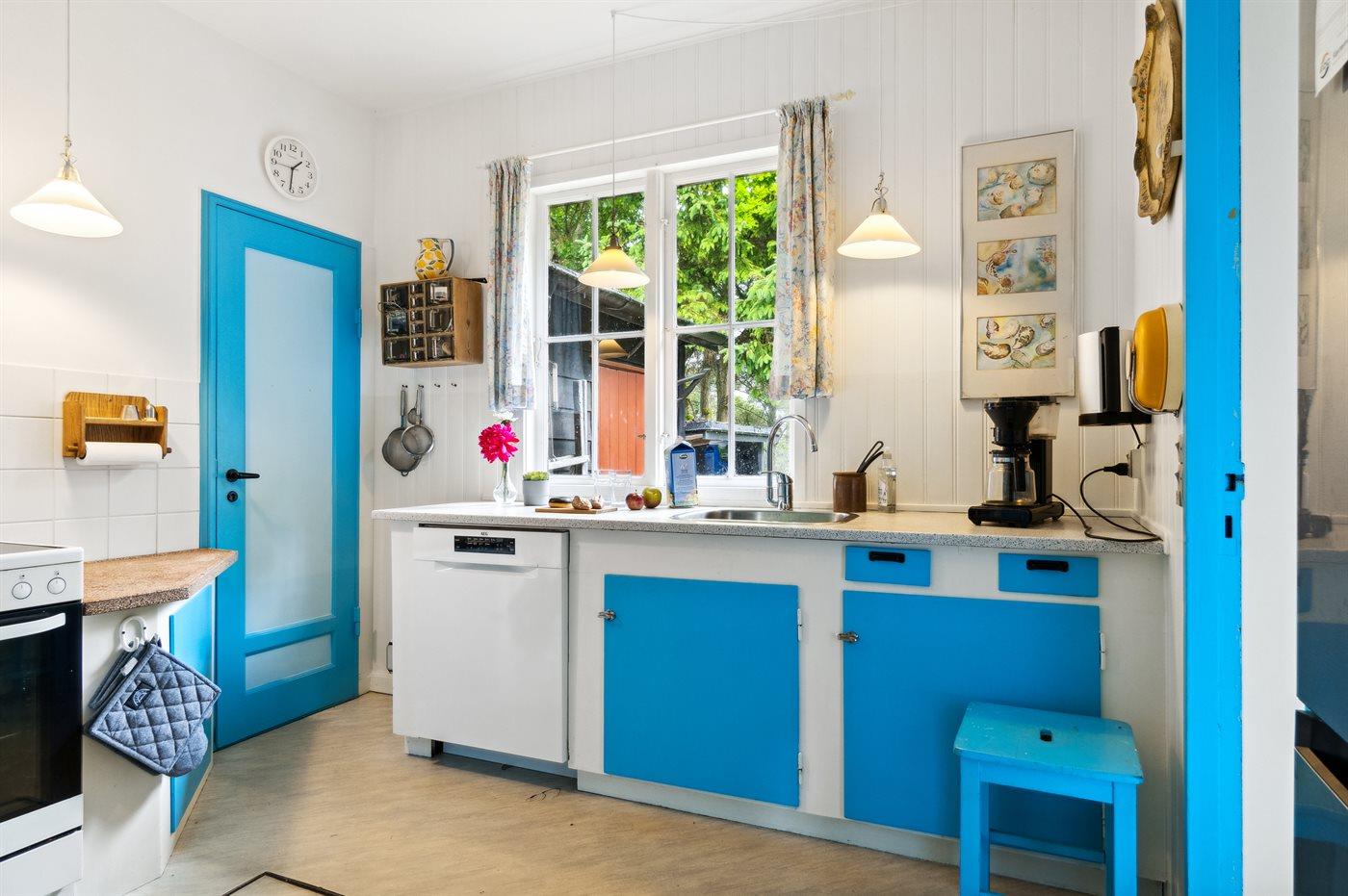 Køkkenet er udstyret med 1 køleskab. Der er 4 keramiske kogeplader, varmluftovn samt opvaskemaskine.