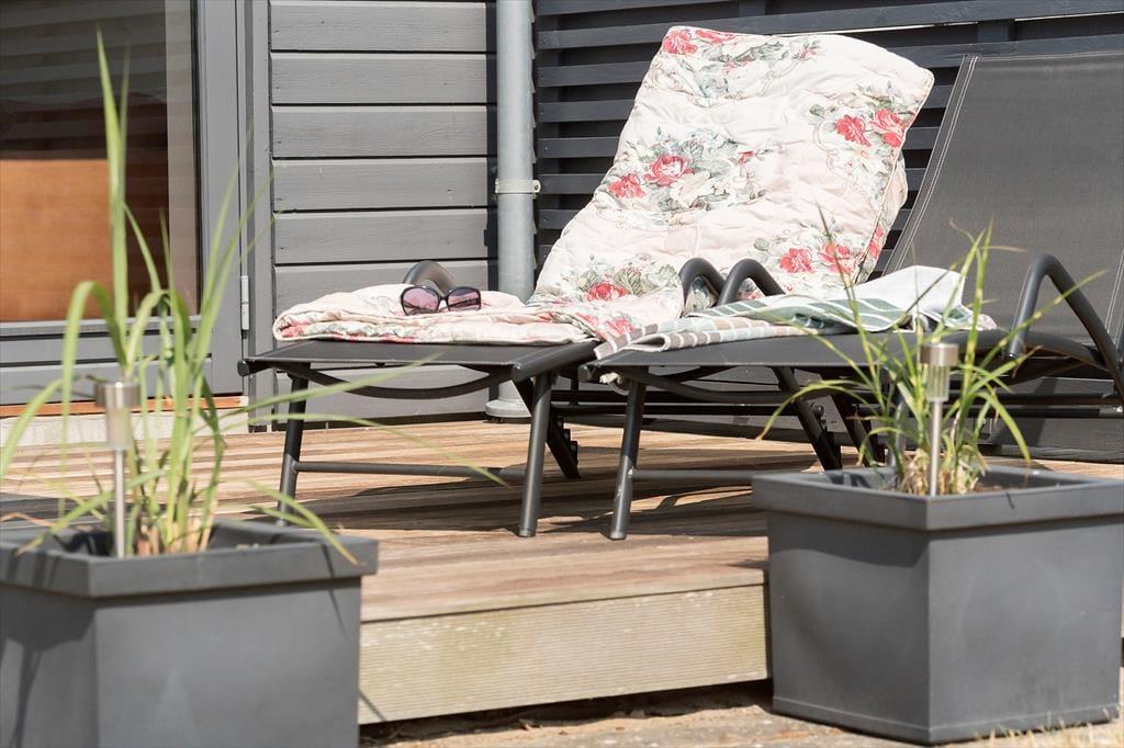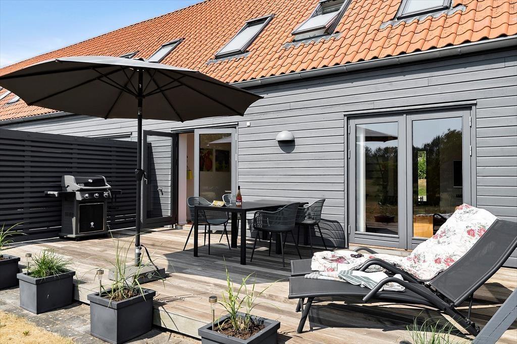På træterrassen er der gode havemøbler samt en parasol og grill, så når det er muligt, er det oplagt at bruge terrassen som et ekstra uderum til både afslapning og madlavning.