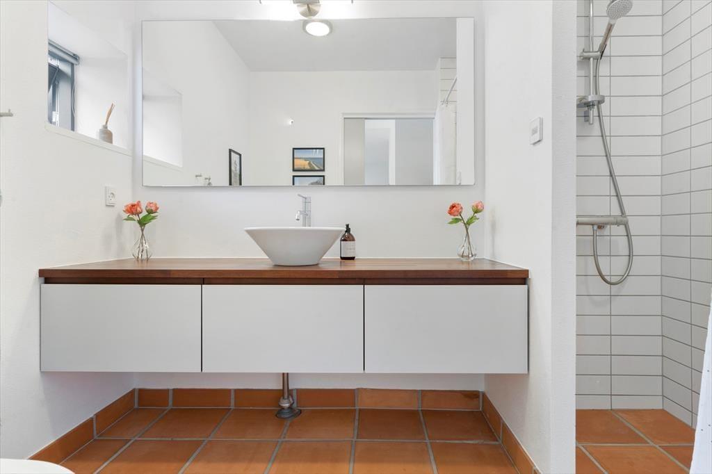 I stueetagen er et lyst badeværelse med en god bruseniche. Det er gennemført i samme moderne og indbydende stil som resten af boligen med træelementer og hvide fliser.