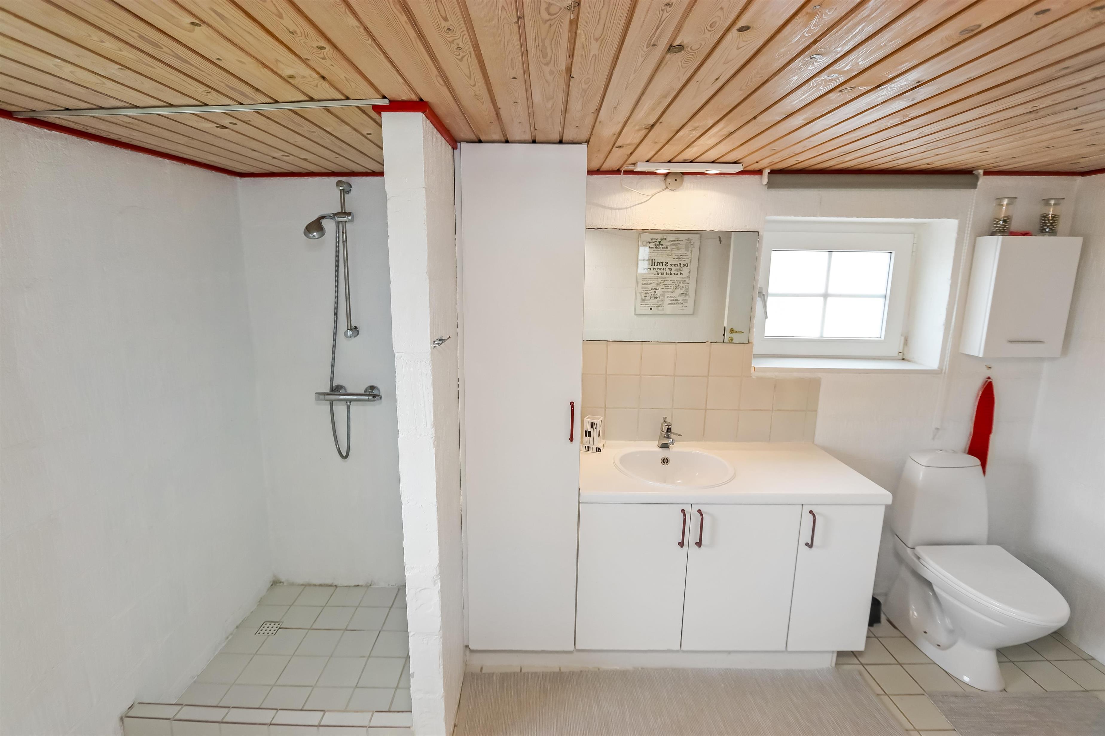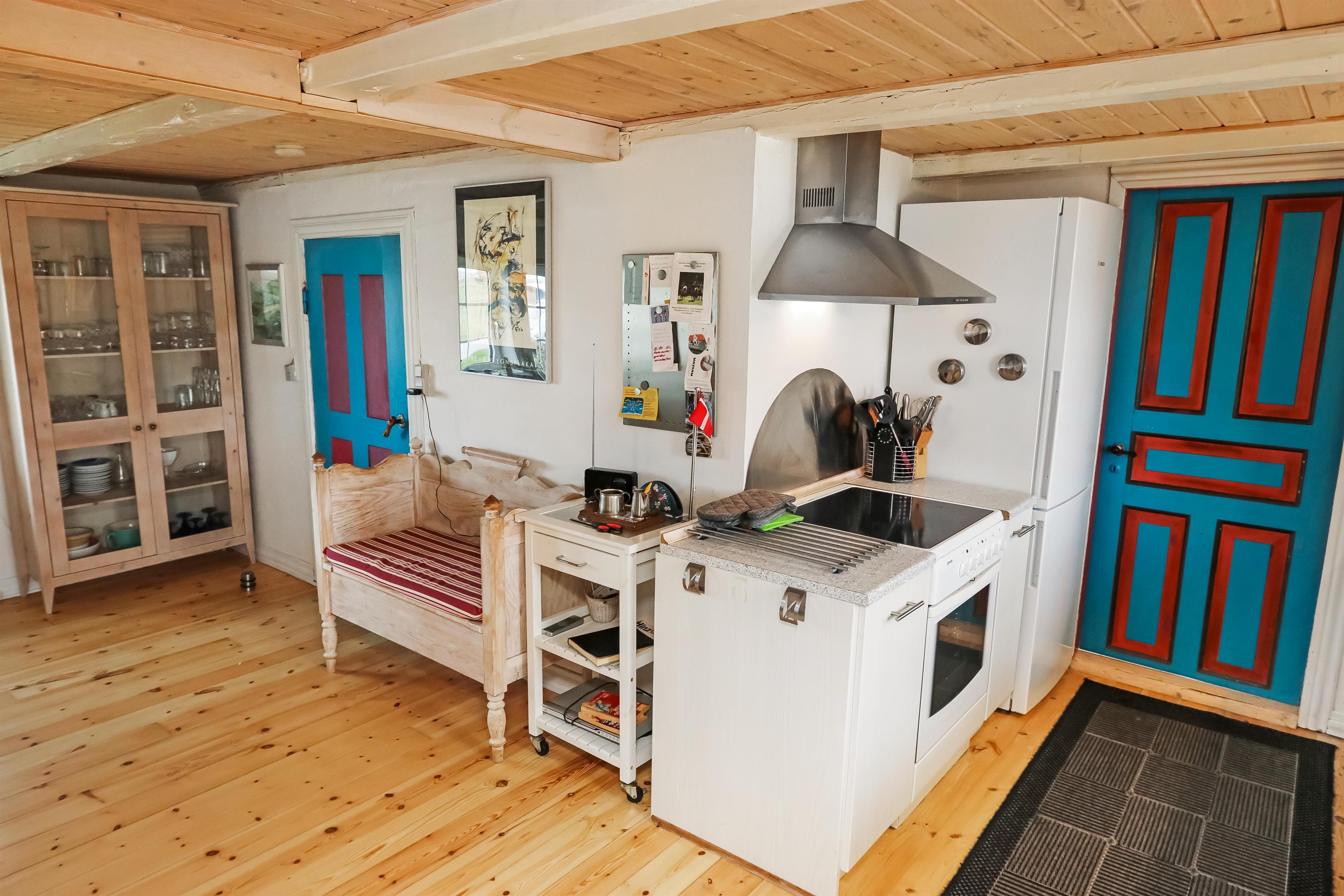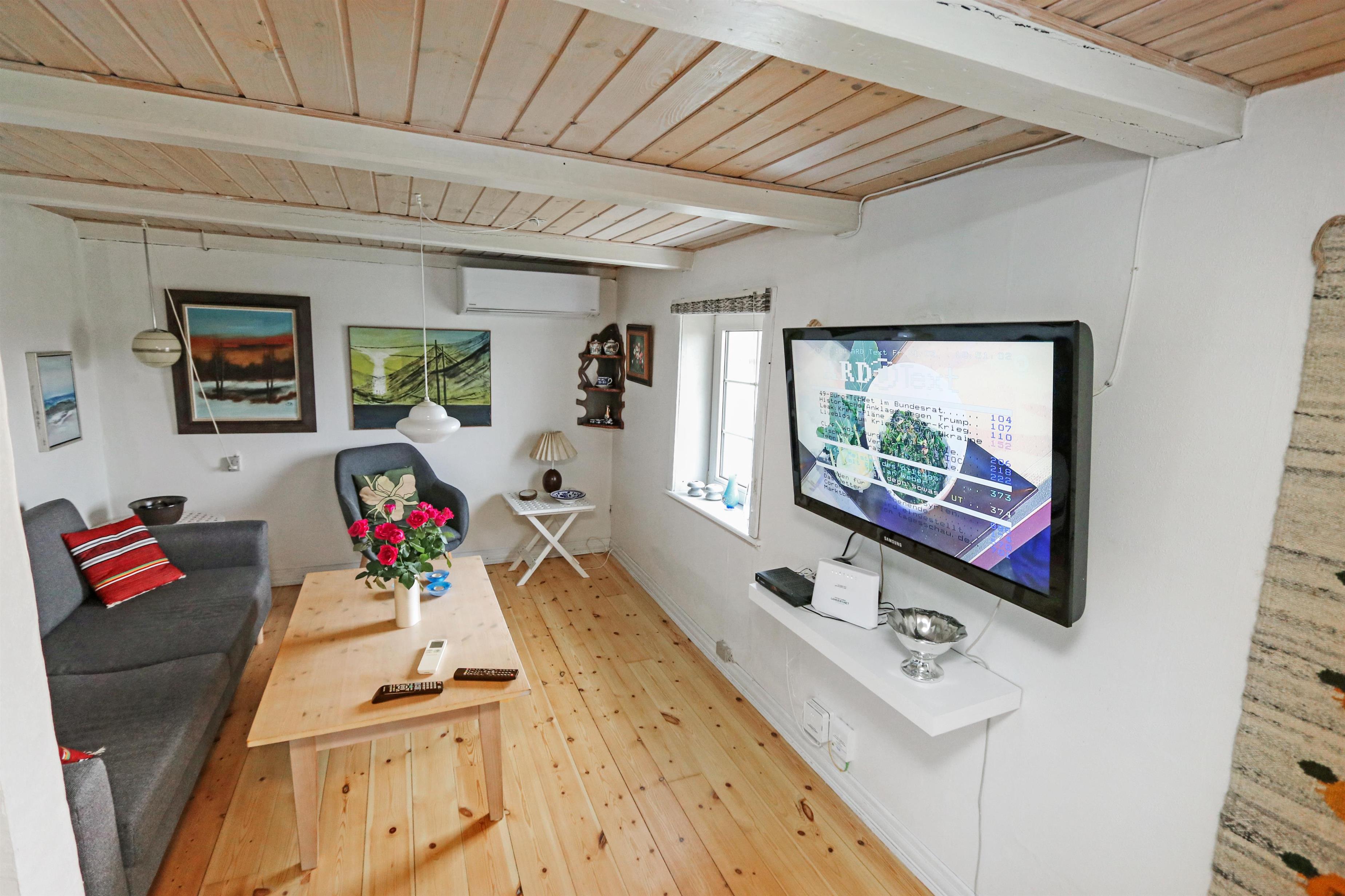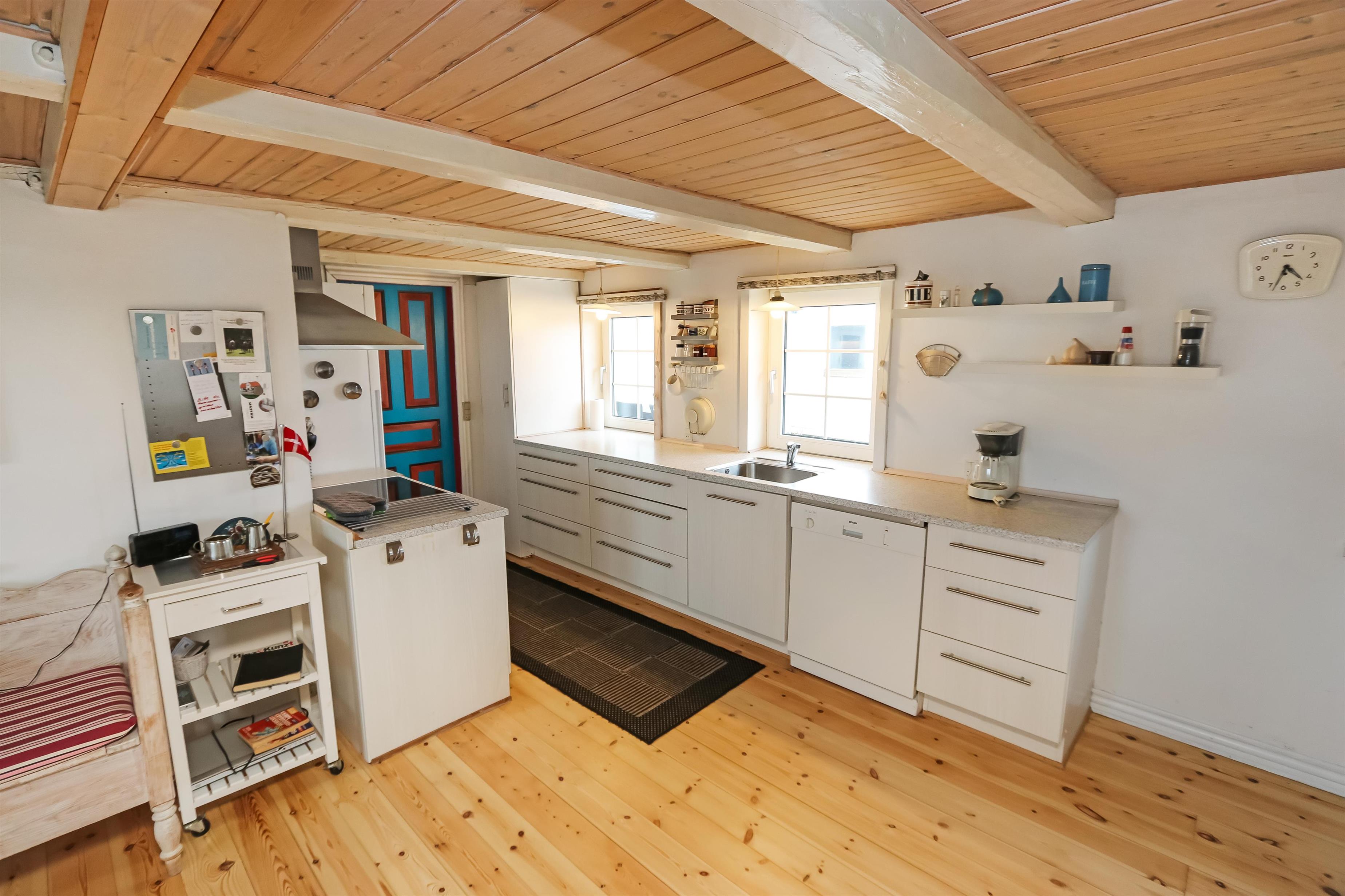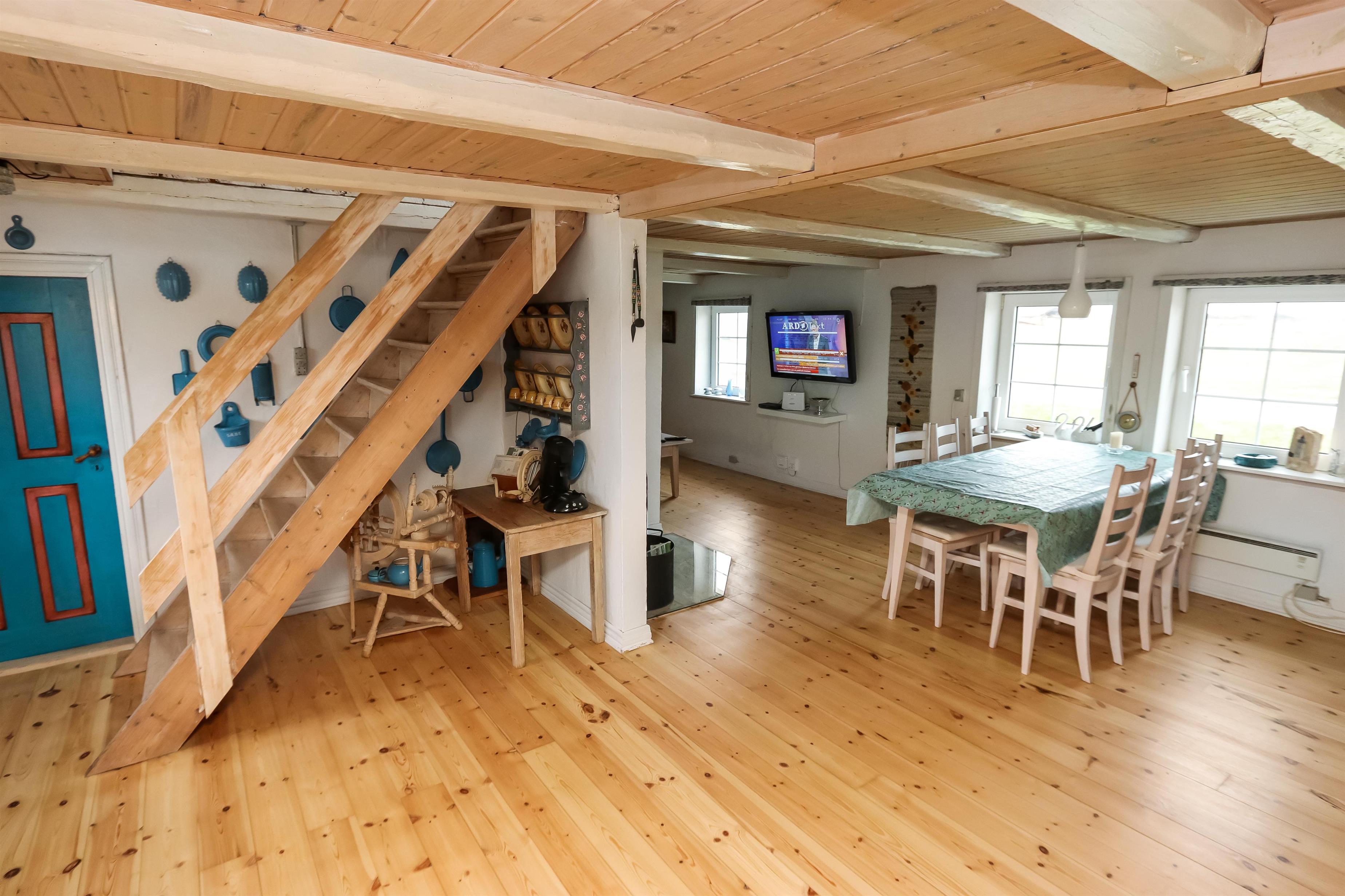 Indgang gennem huset entre med udgang til terrassen, grovkøkken og siddemuligheder. Fra entréen er der adgang til et nyere åbent køkken med glaskeramisk komfur, opvaskemaskine, mikroovn og køleskab med lille fryseboks. Fra køkkenet er der adgang til spisebord med spiseplads og hyggelig TV-stue med danske og tyske kanaler. De danske TV-kanaler koster 30 kr. pr. dag og inkluderer bl. a. TV3, TV2 og DR, radio, cd-afspiller og tv med danske kanaler. Varmepumpe og en hyggelig brændeovn sørger såvel for varmen samt ekstra hygge. Badeværelse med toilet, håndvask og bruser. 3 soveværelser: 1ds, 1ds, 2es. 2 af soveværelser er på 1. sal via trappe i køkkenet. Værelset mod vest har den flot udsigt til de høje klitter ved Vesterhavet. I underetagen er den oprindelige konstruktion med synlige bjælker bevaret, her er loftshøjden ca 1,9 m. 1 husdyr tilladt. ikke ryger hus.