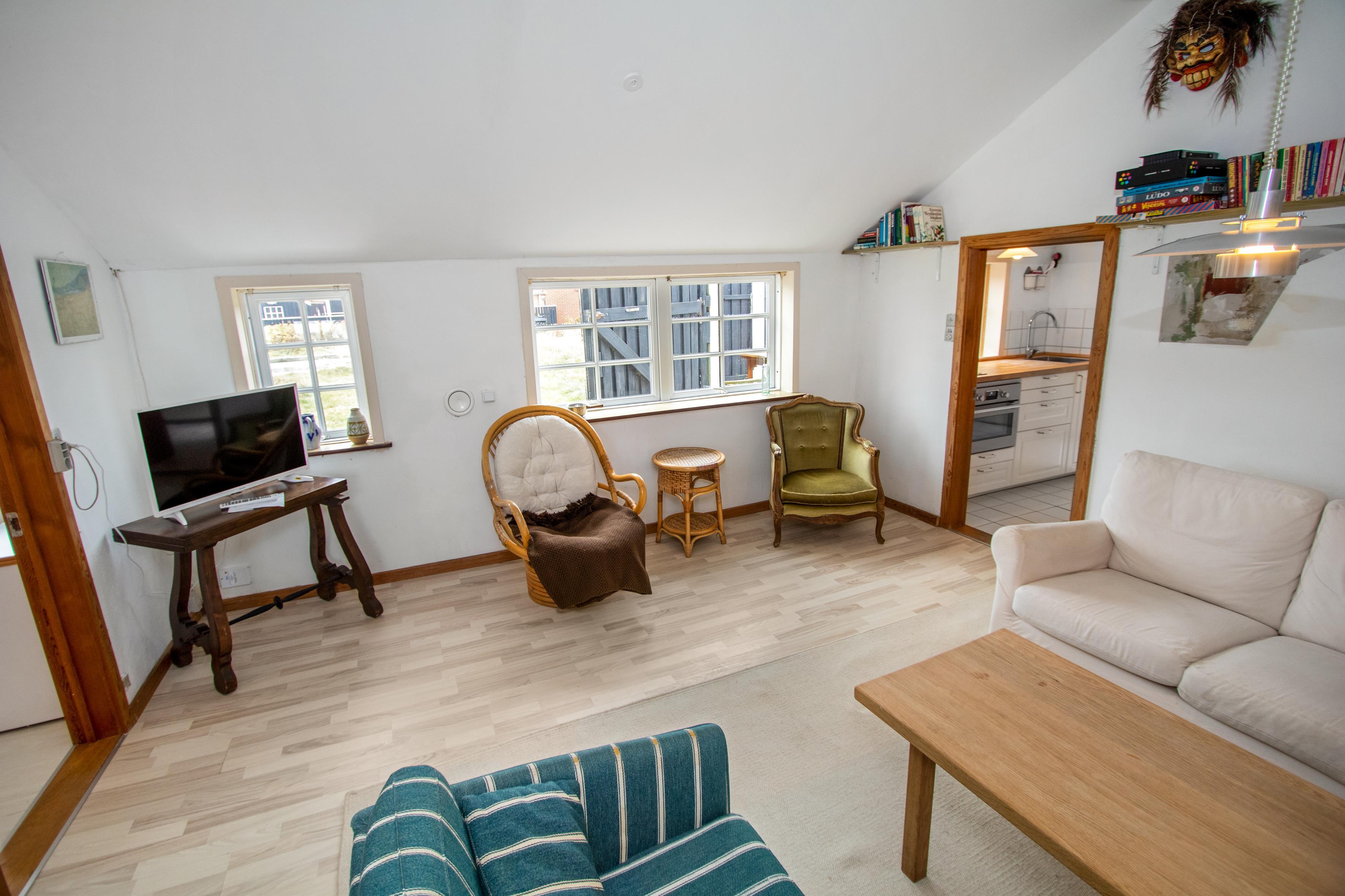 Gammel klitgård med 2 soverum (1DS, 1DS). Flot nyrenoveret badeværelse med bruser, toilet, håndvask og klinkegulv. Hyggelig opholdsstue med trægulv, og ældre polstermøbler. TV med danske og tyske programmer, og varmeapparater til de kolde aftener. Nyt køkken med klinkegulv, spiseplads, omduktions kogeplader, emhætte, kombiovn og køleskab med lille fryseboks. Ikke ryger hus. 2 husdyr tilladt.