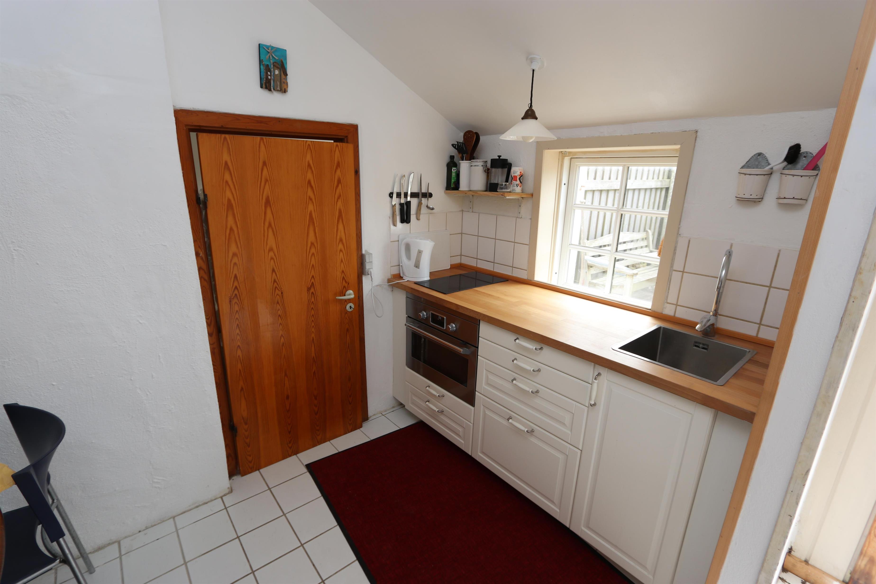 Fra køkkenet er der udgang til en stor, indhegnet terrasse med havemøbler og grill. Huset ligger på en ca. 987 m2 stor klitgrund kun 50 fra Vesterhavet. Nyd en ferie tæt ved Vesterhavet i en charmerende Klitgård med en helt unik beliggenhed. Parker bilen og nyd at I resten af ferien kan gå til stranden på under 5 minutter.