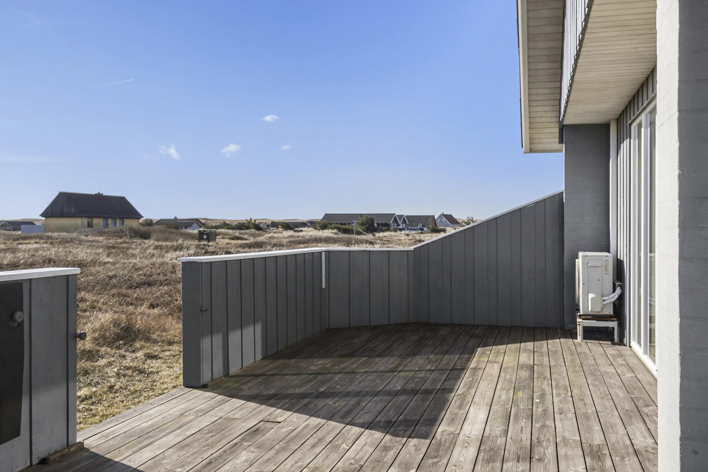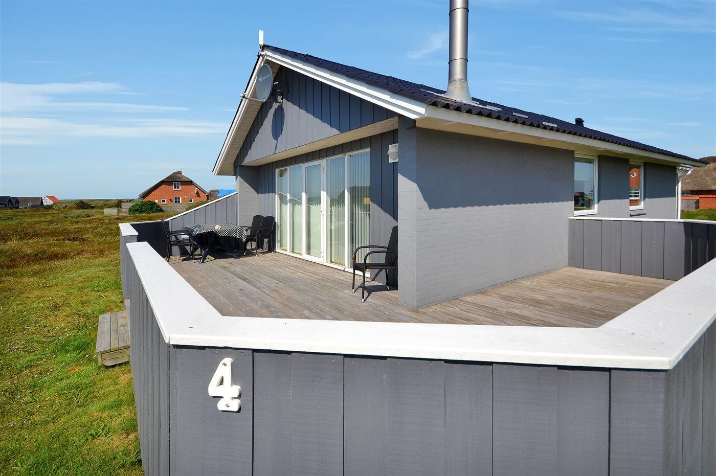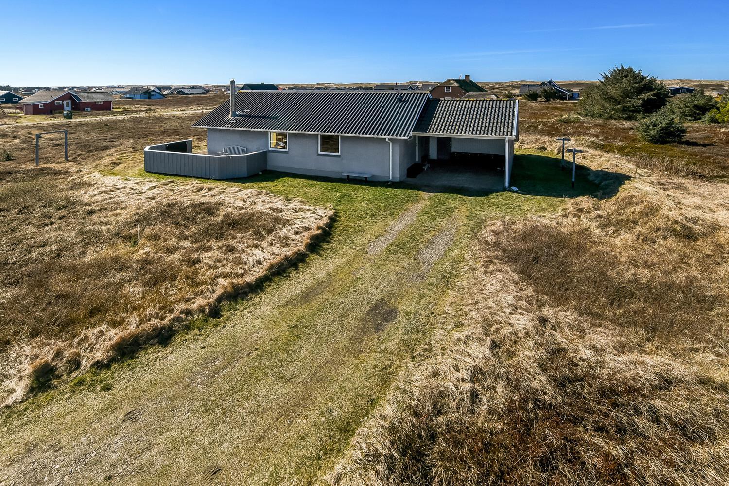 Fra opholdsstuen er der udgang til en dejlig indhegnet terrasse med havemøbler, liggestole og grill. Carport og ekstra opbevaringsrum. Gynge til børnene. Et rigtig godt sommerhus med den perfekte beliggenhed på en dejlig naturgrund tæt på det unikke Vesterhav som er et dagligt besøg værd både på solrige- som på blæsende dage. Hop ind i bilen eller tag cyklen og hent morgenbrød til familien i hos de nærved liggende supermarkeder. Så hvad enten du er til aktiv ferie eller total afslapning, danner dette feriehus en dejlig ramme både hvad angår hus, beliggenhed og omgivelser.