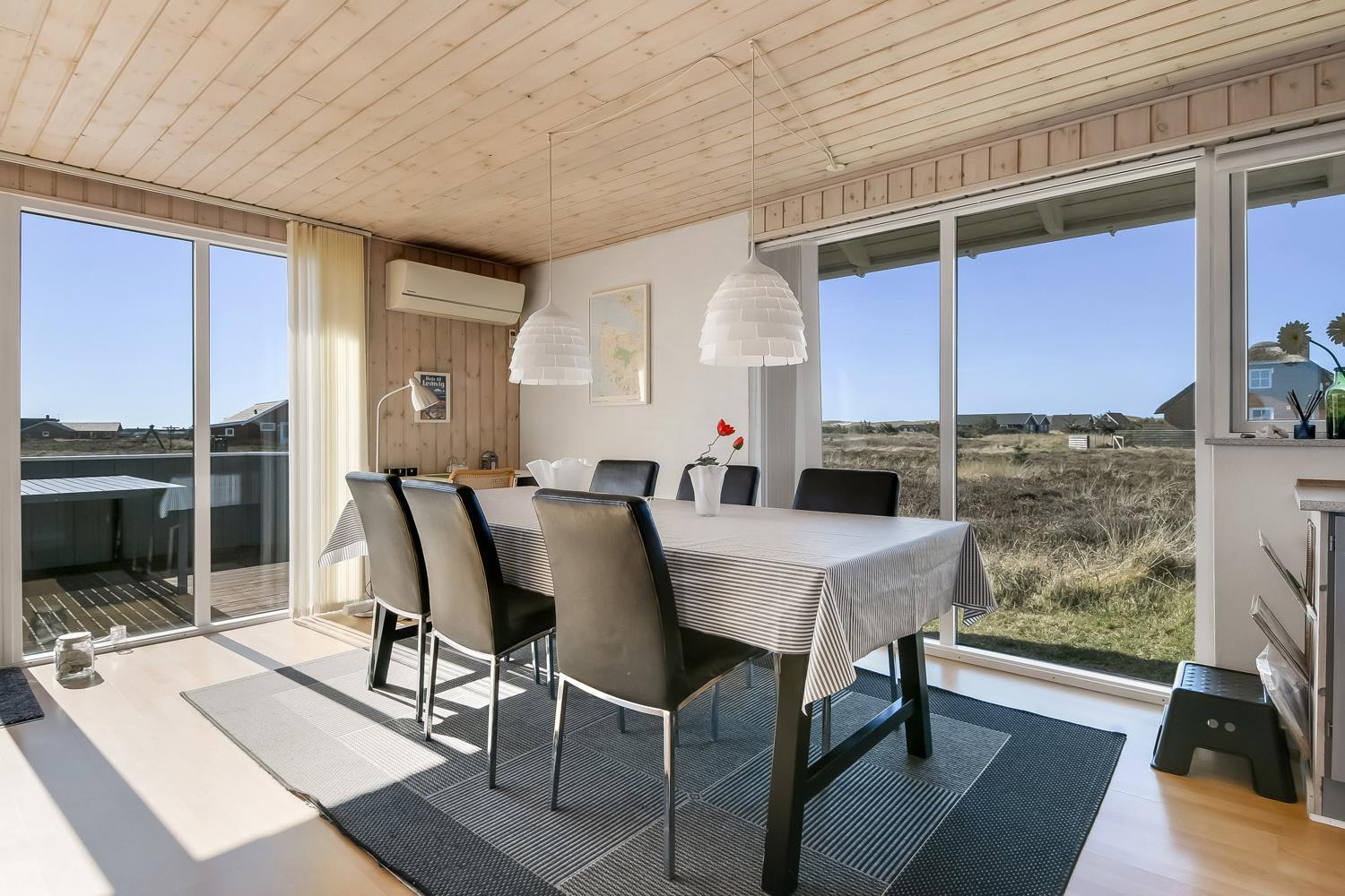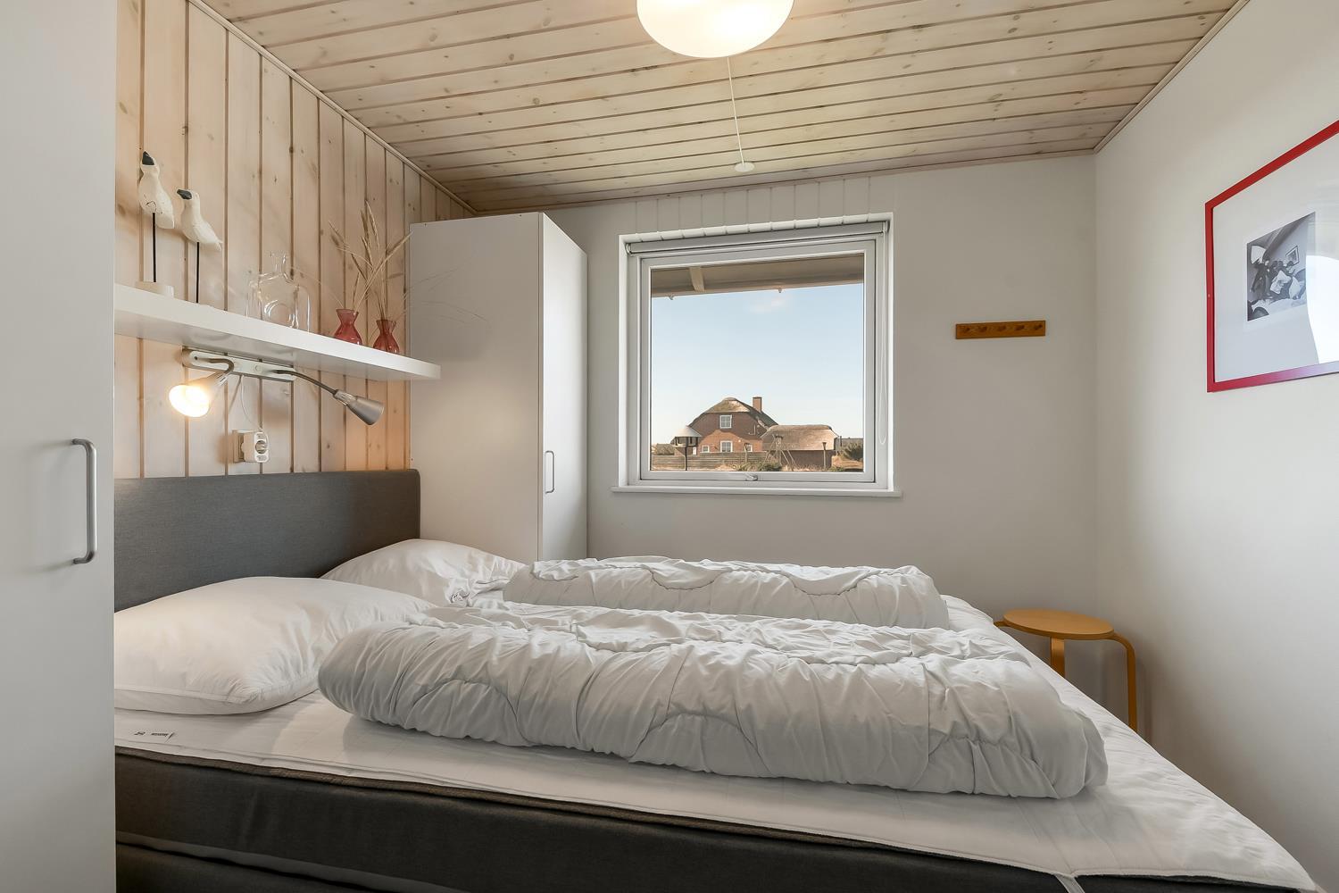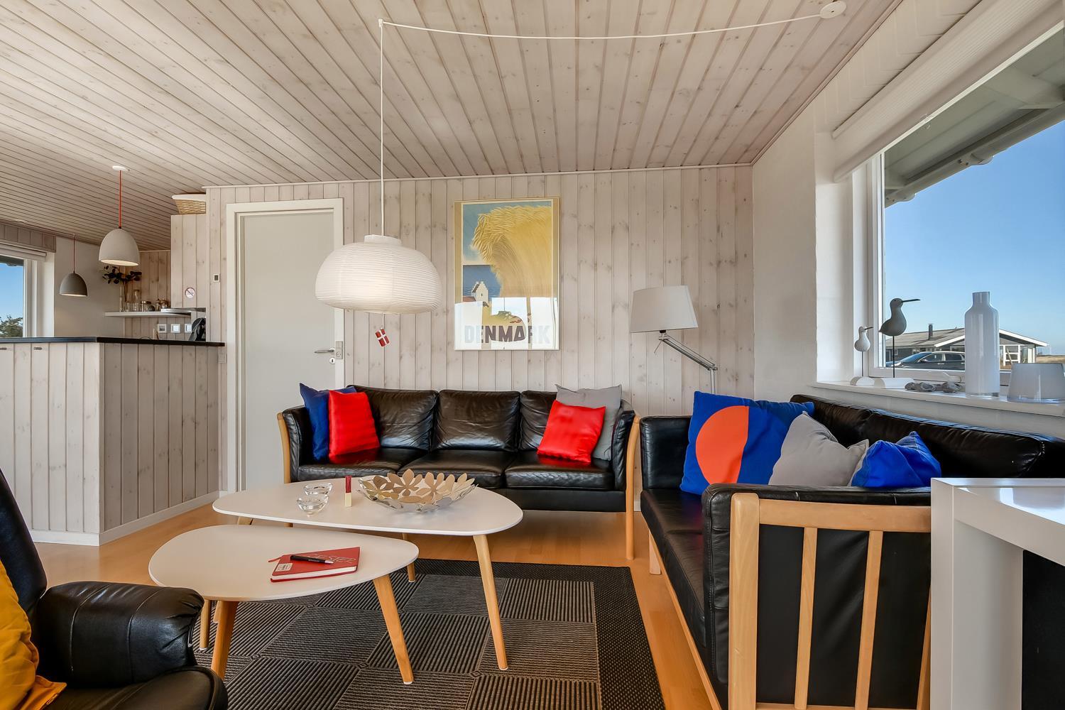 Godt udnyttet feriehus på ca. 75 m2 med kig til de høje klitter ved Vesterhavet. 2 soveværelser (1DS, 2ES+1KS). Huset seneste større renovering var 2006, men huset bliver løbende vedligeholdt og renoveret. Huset er indrettet med lædermøbler, spiseplads, samt-TV med danske og tyske programmer samt mulighed for streaming af TV / radio / Apps. Radio og CD-afspiller. En hyggelig brændeovn samt varmepumpe søger for en billigere el-regning og ekstra hygge samt varme til de rå dage ved Vesterhavet. Praktisk køkkenhjørne med bl.a. opvaskemaskine, komfur med keramiske kogeplade, emhætte, mikroovn samt køleskab med fryseboks. Badeværelse med toilet, håndvask, bruseniche og klinkegulv samt vaskemaskine. Der er praktiske træ gulve i alle opholds- og soverum. Max. 1 husdyr tilladt. Ikke ryger hus.