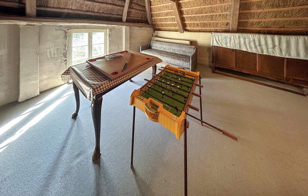 Glæd jer til den unikke charme i dette traditionelle stråtagshus. Find jer til rette i sofaerne i den rummelige stue og nyd den varme atmosfære med træloftet og den fine murede pejs. Tænd op på de kølige aftener og tilbring hyggelige timer i opholdsstuen. Tilbered jeres måltider med lethed i det rummelige køkken, hvor der er godt med flader og bordplads til madlavningen. Find sammen omkring det store bord i den separate spisestue og planlæg jeres udflugter. Brug det ekstra rum på loftet med bordfodboldbordet til sjove spil.
