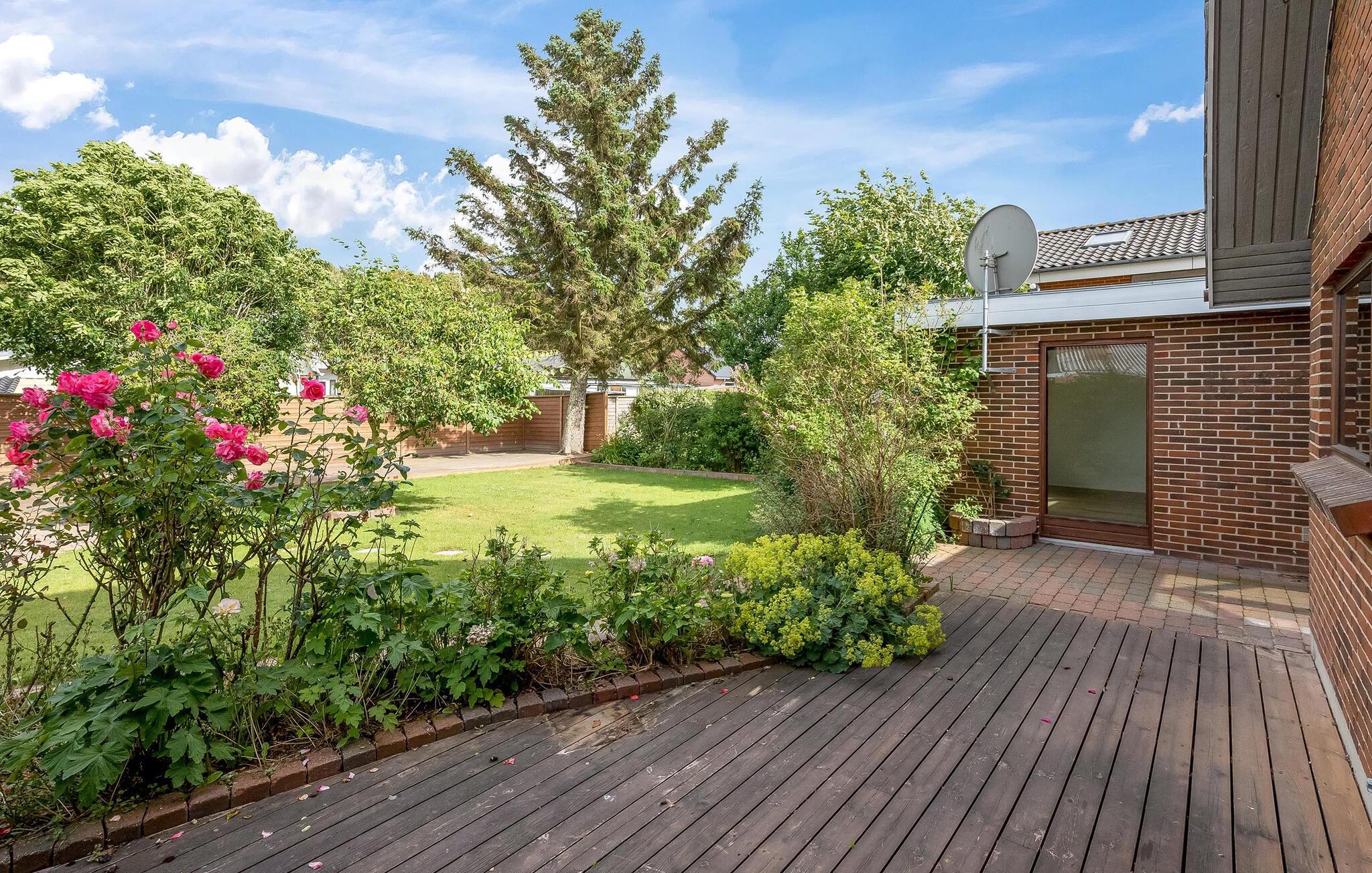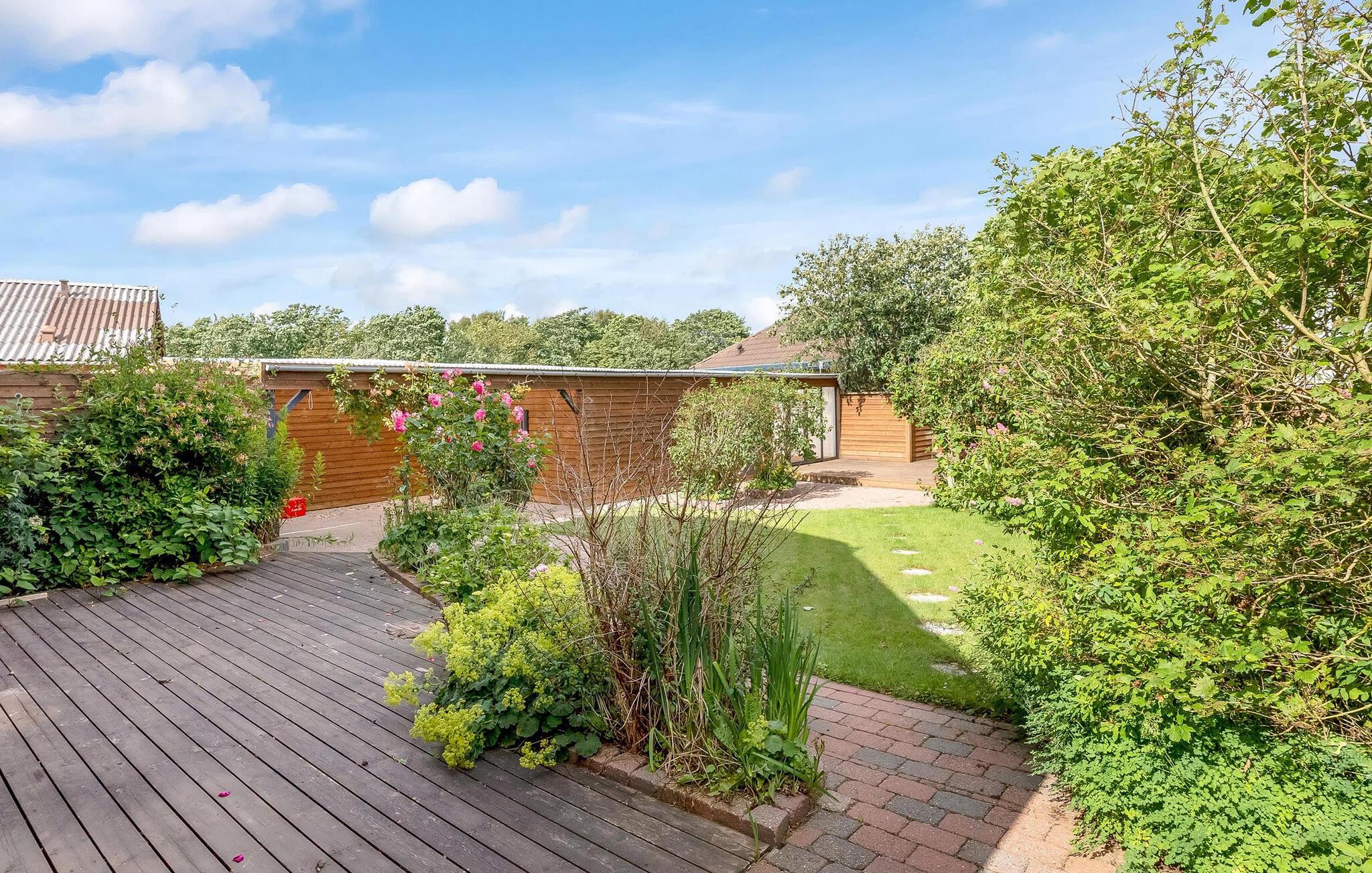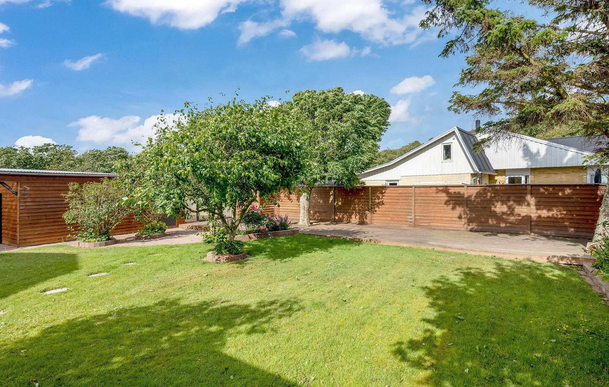 Udearealet er tilsvarende dejligt. Fra altanen har I en fantastisk udsigt over fjorden, og haven er stor og velplejet med flere terrasser, træer og planter, så I kan finde sol, skygge og læ og nyde måltiderne i det fri, når vejret er godt.