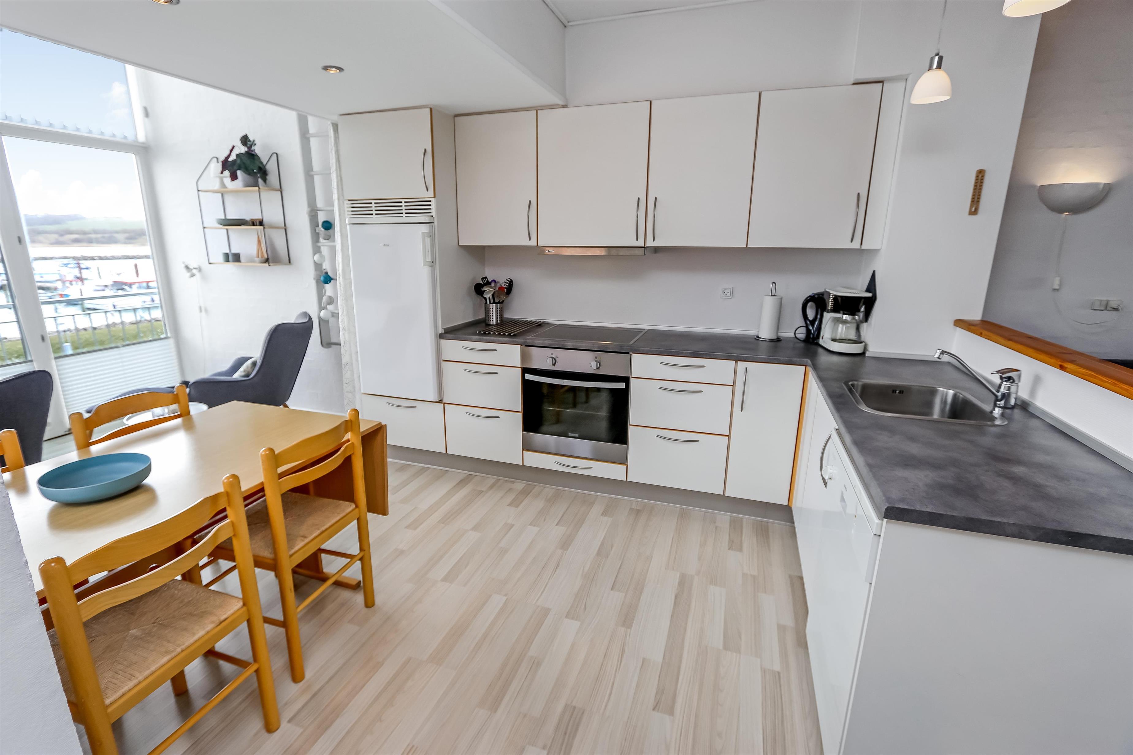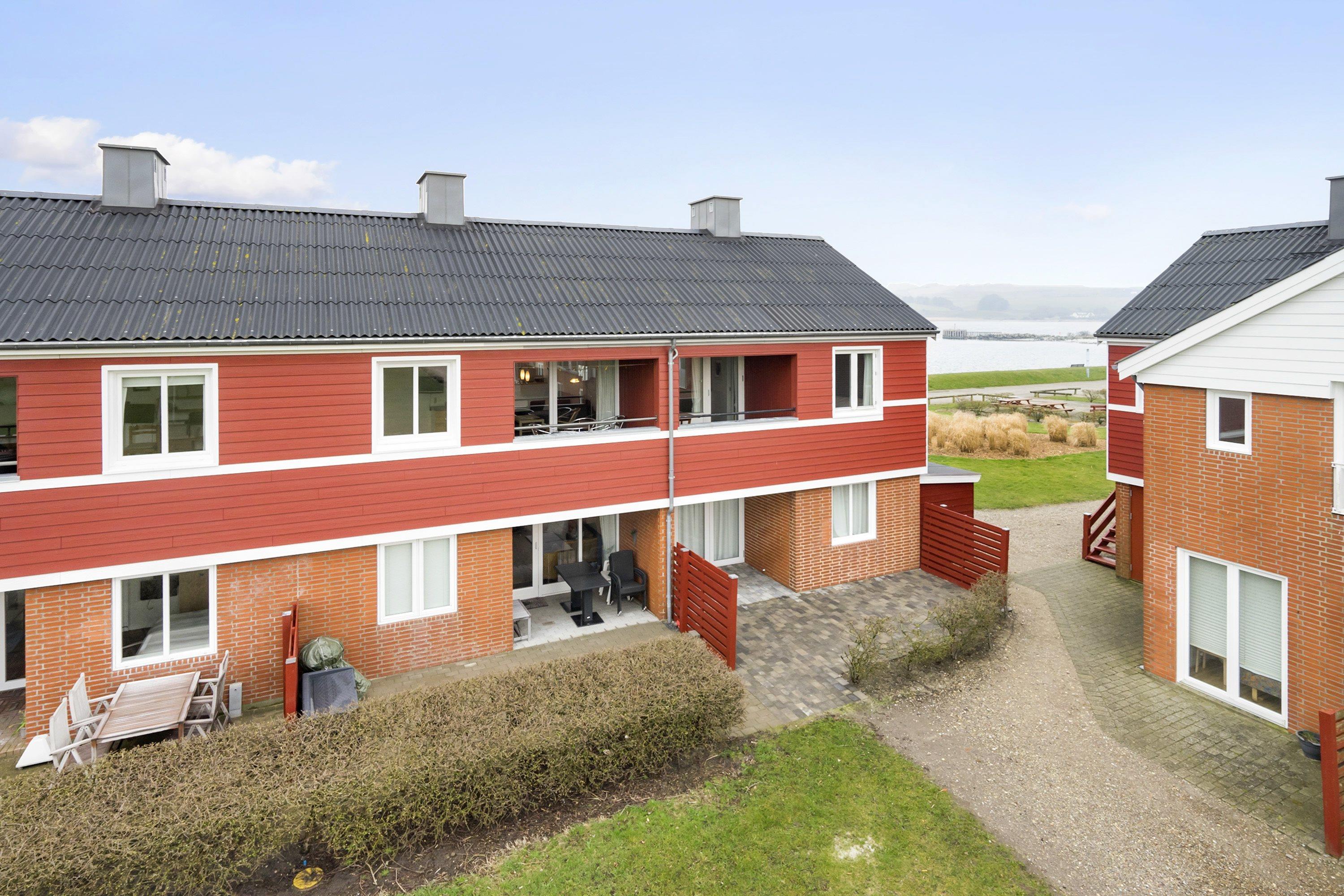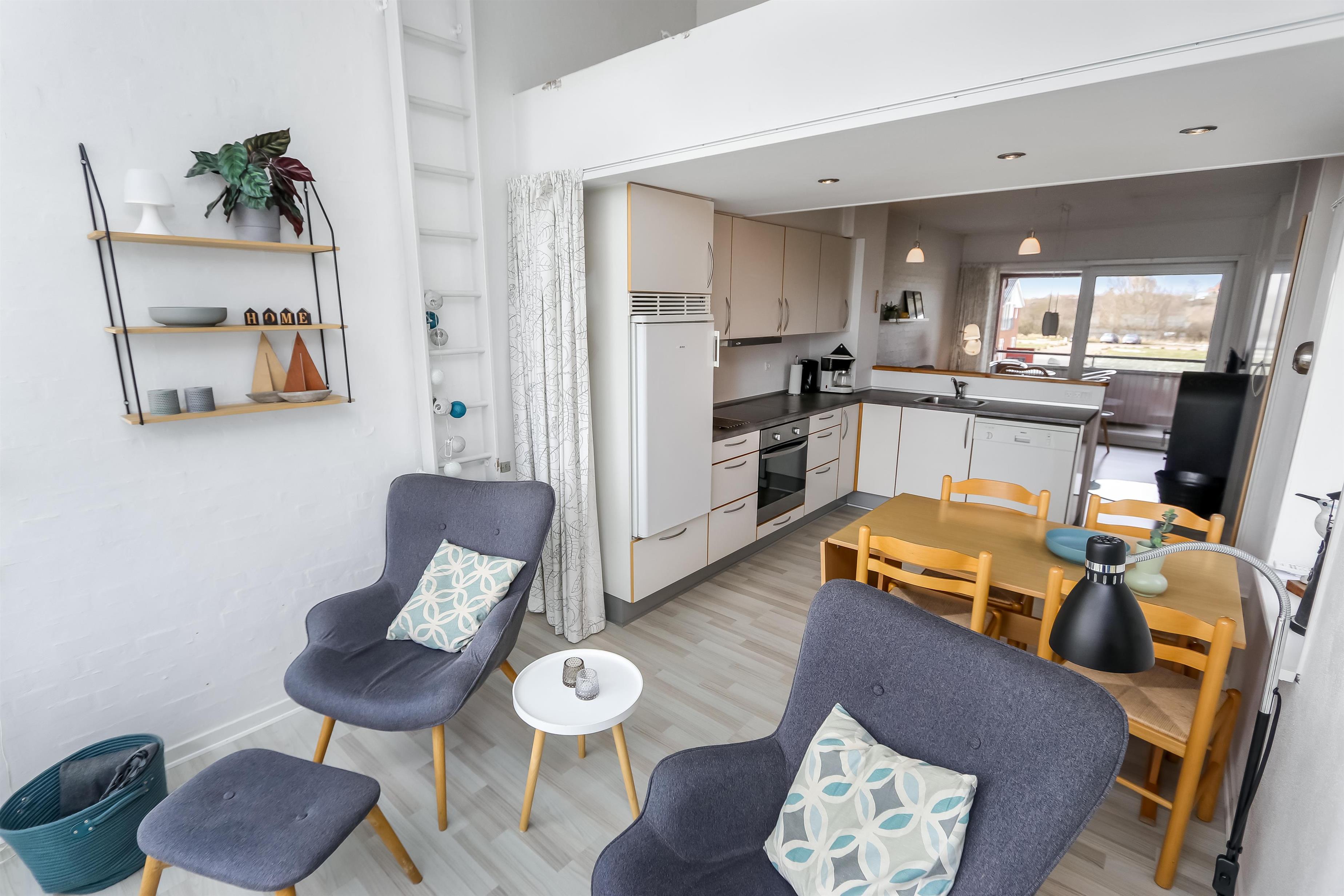 Lejligheden er renoveret i 2013 med blandt andet nyt køkken med opvaskemaskine. Her er glaskeramisk komfur, emhætte, køleskab med separat fryser på 10 liter. Der er trægulv over det hele med undtagelse af badeværelset som er belagt med klinker. Stuen er hyggelig indrettet med sofabord, sofagruppe, brændeovn, DVD-afspiller samt kabel-tv med DR, TV2, tysk EUROSPORT 1 og RTL. Her er også direkte udgang til den sydvestvendte balkon med havemøbler. Der findes også en anden stue med spisebord hvor der er en sofa, der kan laves om til sovesofa til 2. Her kan man vågne op til udsigt over limfjorden, men solens står op i øst. Herudover er der soveværelset med dobbeltseng samt en hems med en enkelt sovemulighed. Vær opmærksom på at for at komme op på hemsen skal man kravle op ad en ribbe. Har man el-bil eller en Plug-In hybrid, så er der 4 Ladebokse til Type 2 ladestik, der kan lade op til 11 kWh ved Feriecenteret - de er lige efter miljøstationen.