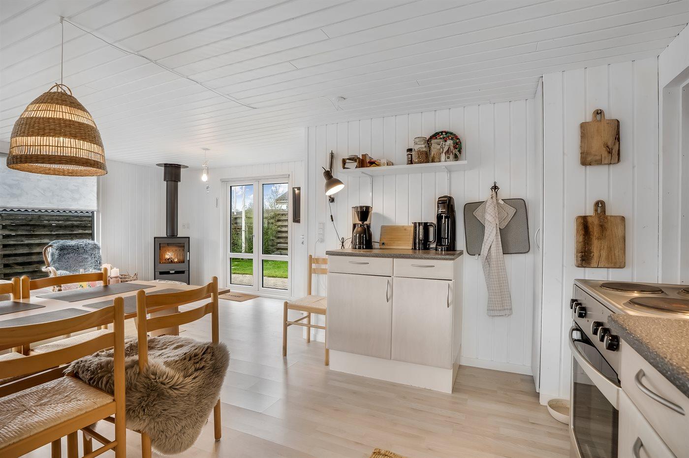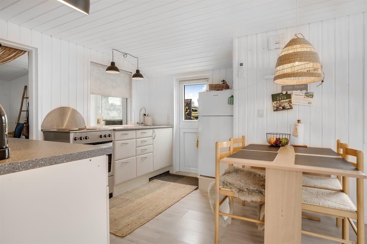 Køkkenet er udstyret med 1 køleskab. Der er 4 keramiske kogeplader, varmluftovn.