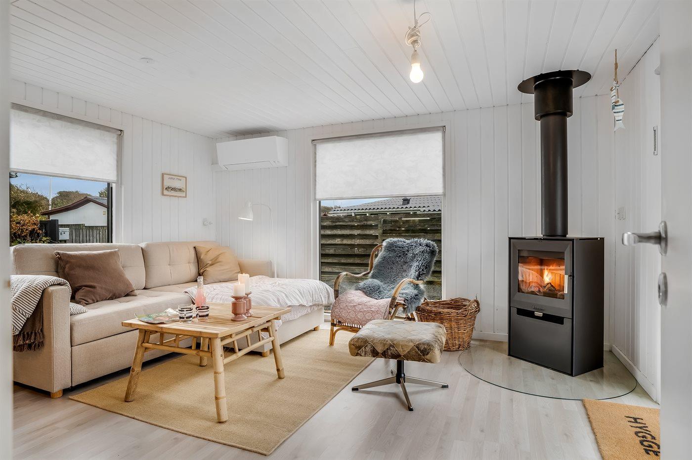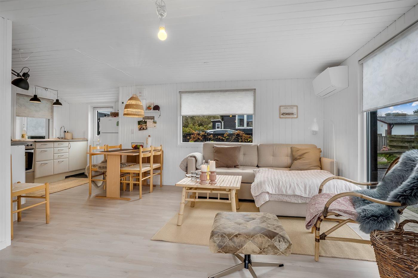 Huset er nyrenoveret i 2020 og har et boligareal på 46 m² med en enkel indretning, som er lys og indbydende. Ude kan du nyde morgenkaffen på den hyggelige terrasse, hvor der er læ.