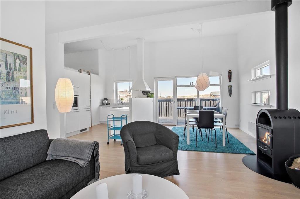 Lild Strand er et skønt sted at holde ferie – ikke mindst, hvis det foregår i dette dejlige sommerhus, der er stilfuldt indrettet og udstyret med blandt andet brændeovn og solrige terrasser.