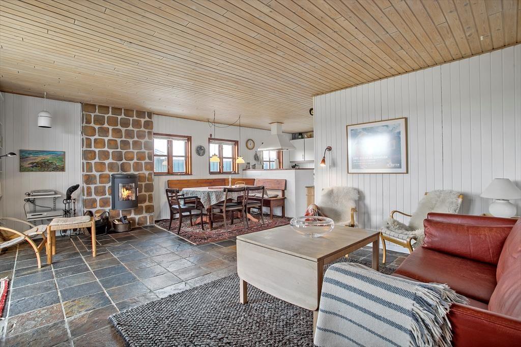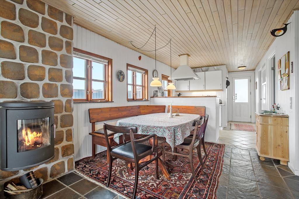 Med så smukke og uforstyrrede omgivelser kan feriedagene oplagt foregå ude under den høje himmel. Men der er nu også god grund til at slappe af inden døre, for sommerhuset har en charmerende og personlig indretning, som giver en skøn atmosfære. Er vejret køligt, kan I tænde op i brændeovnen lige fra morgenstunden, mens I forbereder dagens første måltid i det åbne køkken. Vil I hygge jer med en god bog eller avisen, er der flere gode siddepladser at vælge imellem – og selvom der ikke er TV, kan I takket være en hurtig wifi-forbindelse stadig se nyheder eller jeres yndlingsserie, hvis I blot medbringer en laptop eller tablet. Udover opholdsrummet finder I et pænt badeværelse og tre gode soveværelser med seks sovepladser i huset, og så er der endda en ekstra dobbeltseng og en barneseng i det tilstødende anneks.
