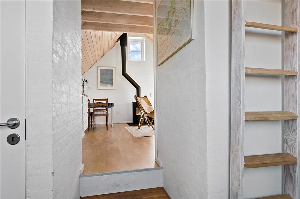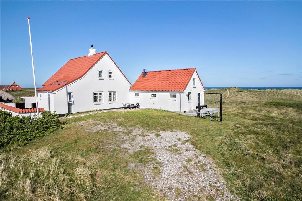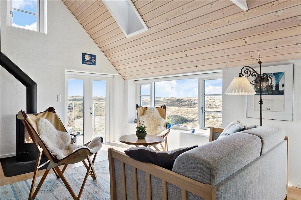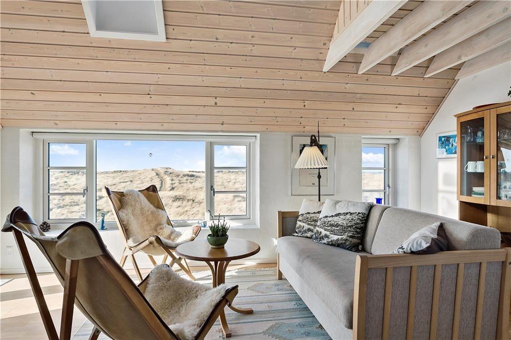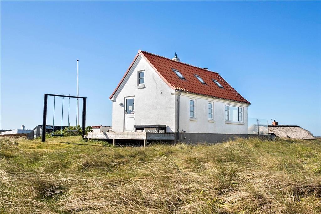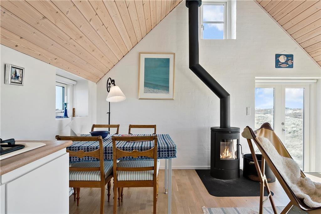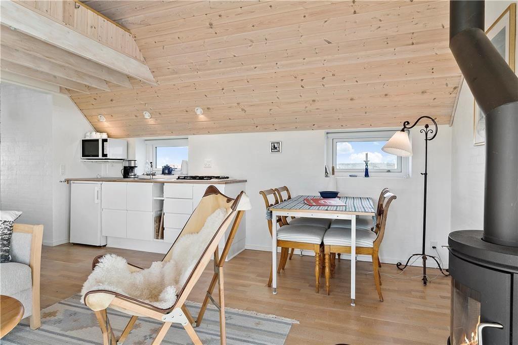 Dette anneks på 40 m2 indeholder alt, man kan ønske sig til en ferie i fredelige omgivelser med fokus på hinanden. Her er hverken wifi eller tv, men i stedet mulighed for at nyde hinanden og ikke mindst den fantastiske natur, som annekset er omringet af. På de få m3 er der både indrettet entre, badeværelse med bruseniche og vaskemaskine, stue med spiseplads, sofaafdeling og brændeovn samt et funktionelt køkken med kombi-ovn og gasblus. Der er mulighed for enten at sove på den lille hems med adgang fra stige i entréen eller benytte sovesofaen i stuen. Begge sovepladser måler 140 x 200 cm. Fra både hemsen og stuen har I en fantastisk udsigt over det åbne klit-landskab med Vesterhavet i baggrunden.