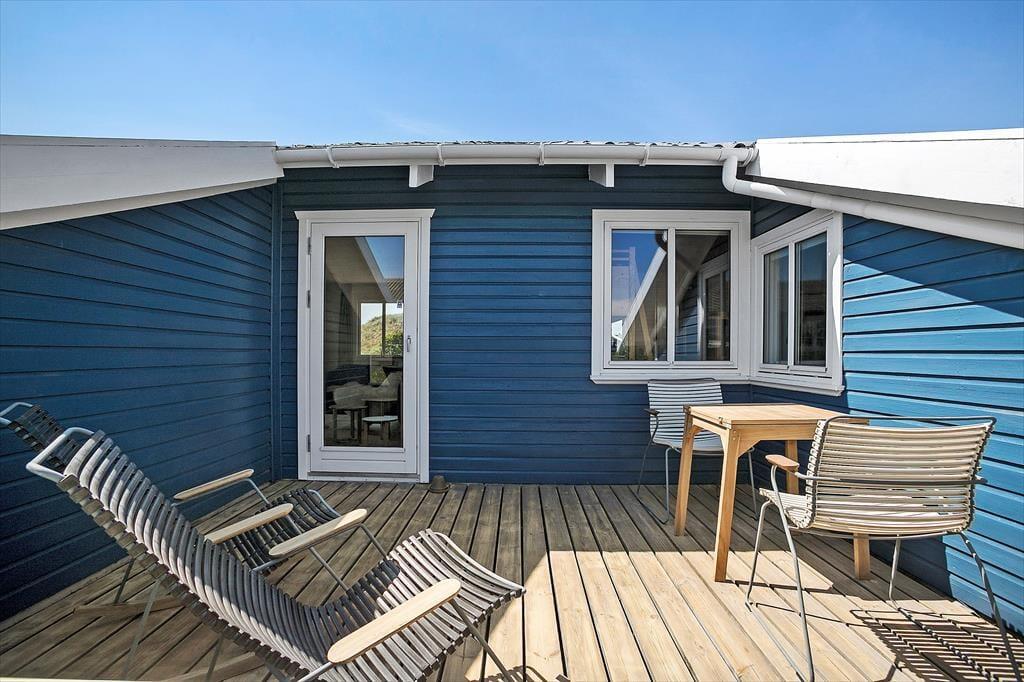 Der er mulighed for at flytte en del af madlavningen udenfor, der er nemlig en stor grill også. Huset har mange små hyggelige kroge på terrasserne og der vil altid være en krog at søge læ i. Den ene terrasse, med udgang fra stuen, er lukket og der er derfor mulighed for at åbne op, uden I behøver at være nervøse for hverken hunde eller børn.
