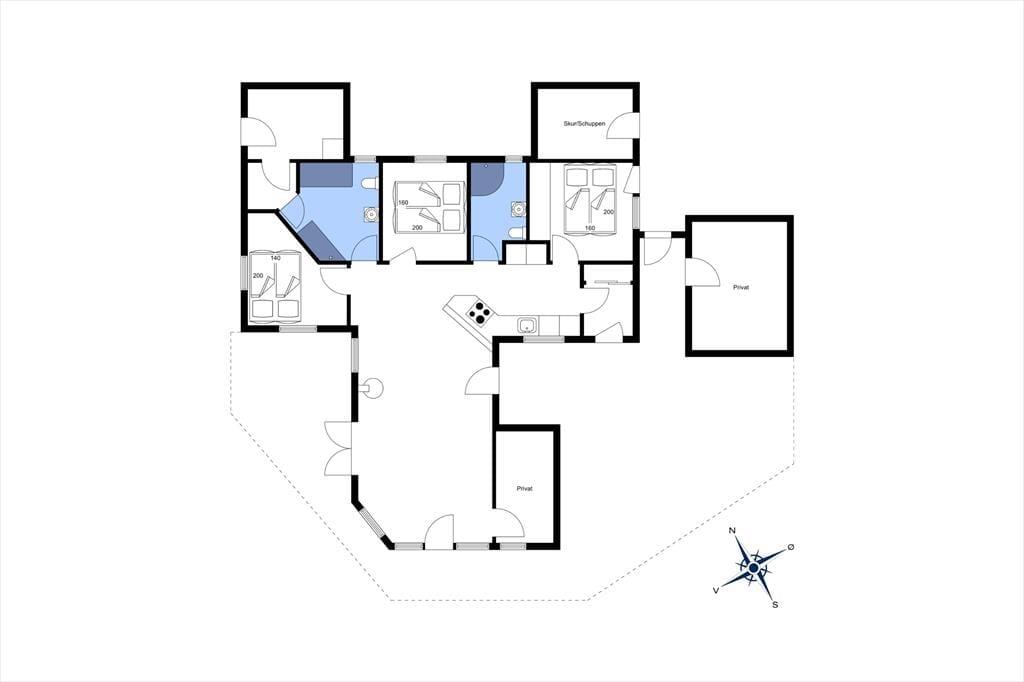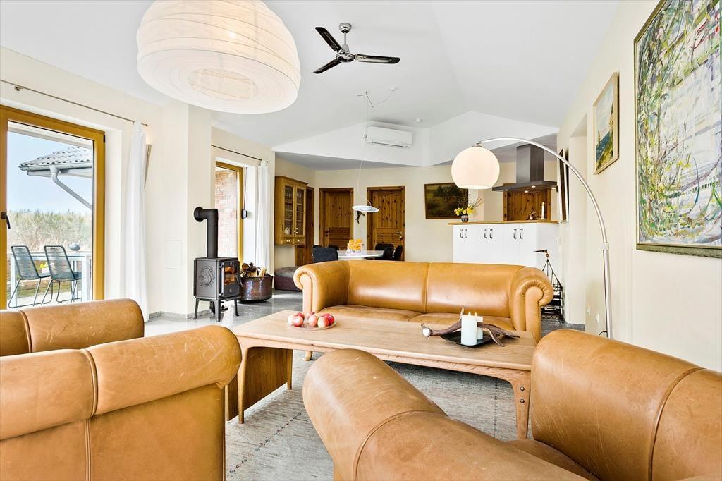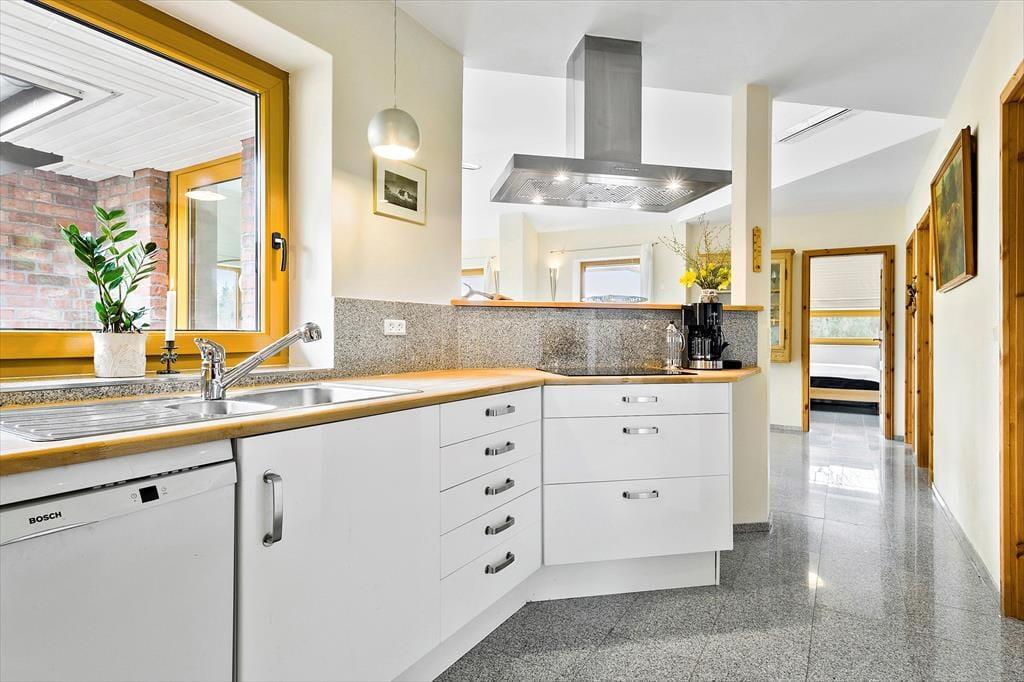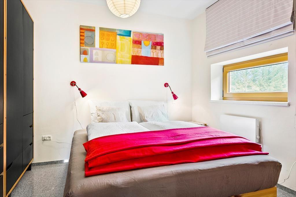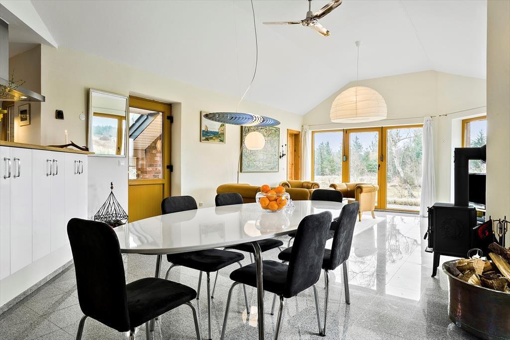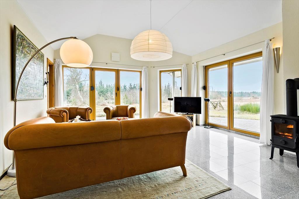 Dette lyse, imødekommende og meget flotte sommerhus er velholdt og moderne indrettet med et stort og centralt opholdsrum, hvor hele familien kan mødes til madlavning, måltider, hygge, spil og afslapning. Holder man ferie i de kolde måneder, er det ekstra dejligt at tænde op i brændeovnen i stuen og nyde det frie udsyn til naturen lige uden for. Sommerhuset er godt udstyret og har der ud over et fint aflåst skur hvor I har mulighed for at låse cykler eller barnevogn inde. Huset råder også over 2 badeværelser med bruser og på det ene finder I endda et badekar, hvor der er god mulighed for at slappe af efter en lang og dejlig dag i naturen.