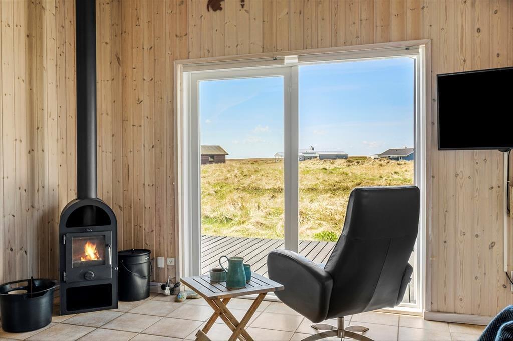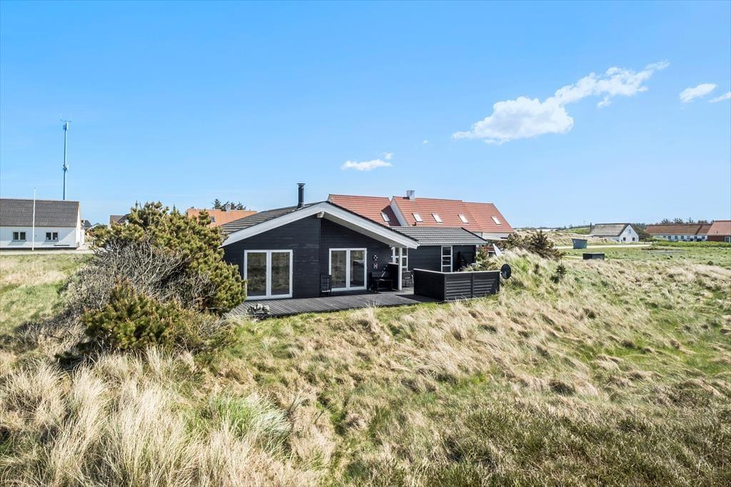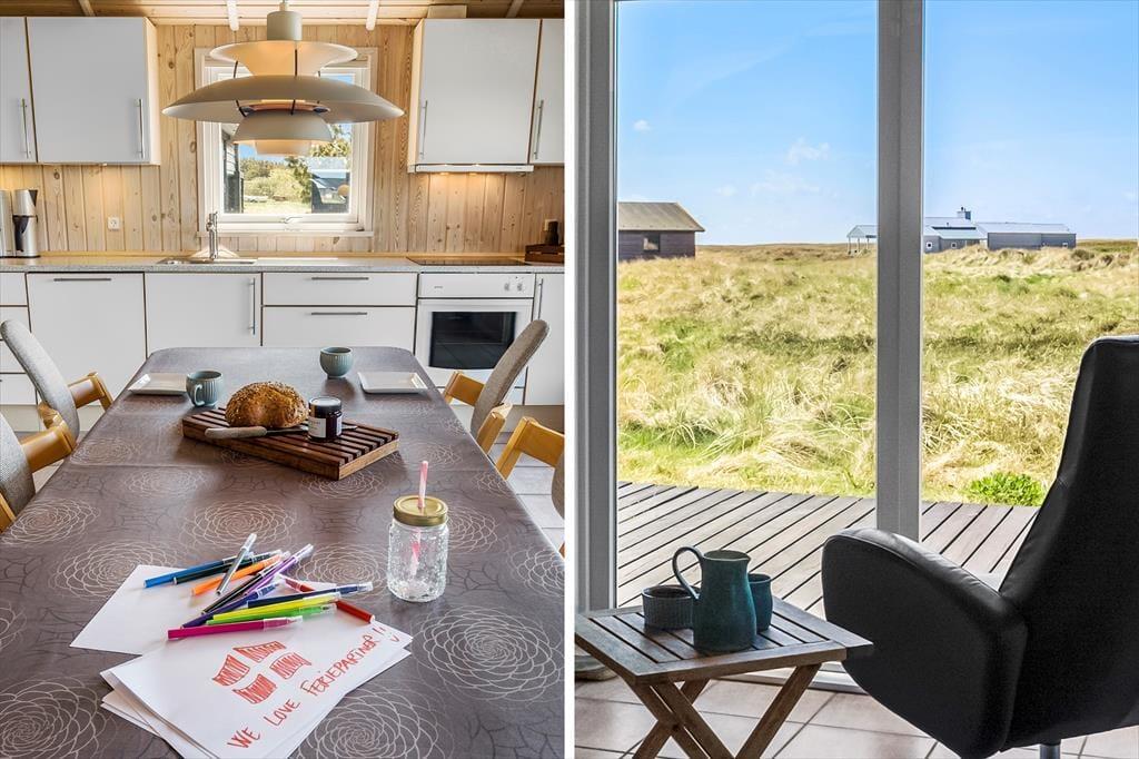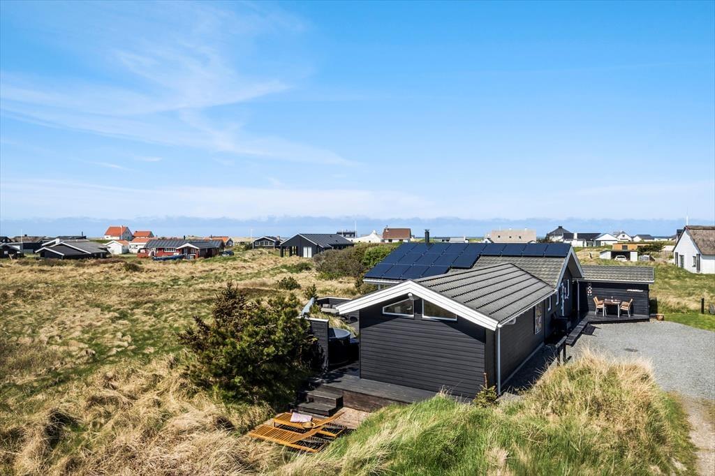 I kommer til at bo i en helt unik natur, når I holder ferie i dette smukke sommerhus i det lille fiskerleje Lild Strand. Fra både stue og køkken er der en betagende udsigt over den fredede klithede. Vesterhavet venter blot 300 meter væk.