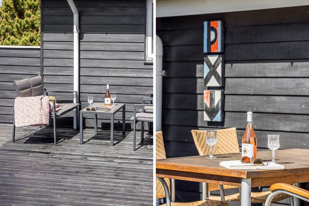 Dette charmerende hus har sine helt egne kunstværker, helt som et rigtigt hus i Lild Strand skal have det. Der er cykelstativ ved hoveddøren, så det er let at parkere cyklen når I har været ved havet. Landingspladsen ligger kun 300m væk. Den store terrasse ved køkken og stue indbyder til udeliv - adgangen er let og pladsen er god. Her finders også et vildmarksbad som ligger i læ i hjørnet. Ved husets gavl, er der lavet en lille nedsænket terrasse der virkelig indbyder til hygge. Hvem vil ikke gerne sidde her i læ, uanset om det er for at tage en lur, nyde solen eller måske stjernerne.