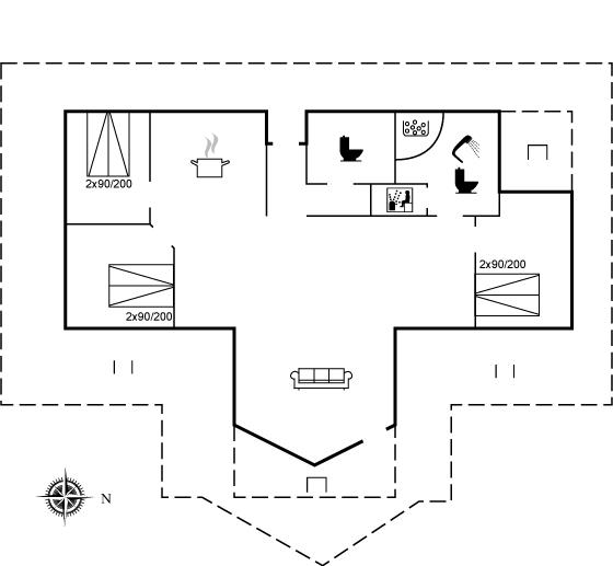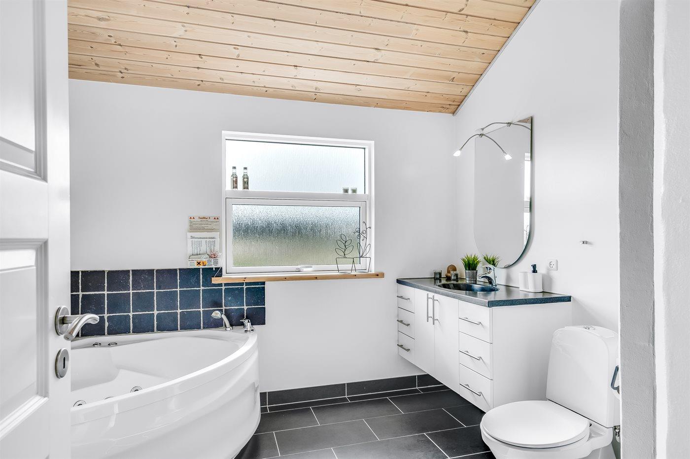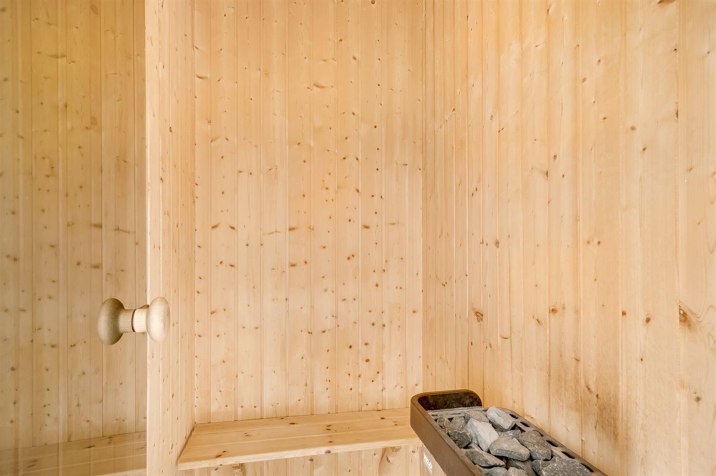Der er 1 badeværelse med bruseniche og 2 toiletter, heraf 1 gæstetoilet. Der er gulvvarme på 1 badeværelse. Der er gulvvarme på gæstetoilettet. I saunaen er der mulighed for afslapning.