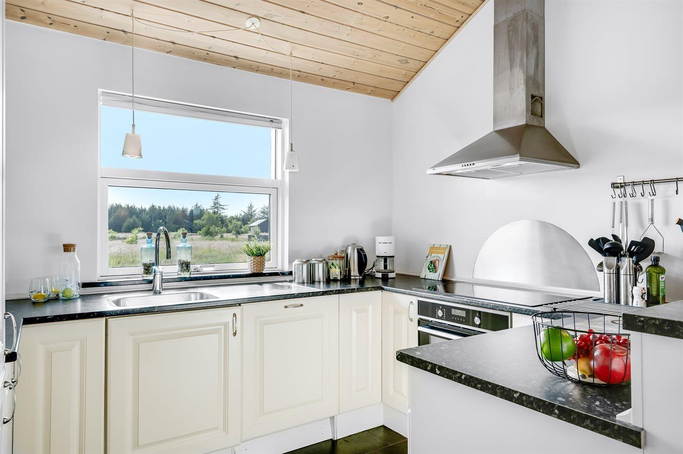 Køkkenet er udstyret med 1 køleskab. Der er 4 keramiske kogeplader, varmluftovn, mikrobølgeovn samt opvaskemaskine.