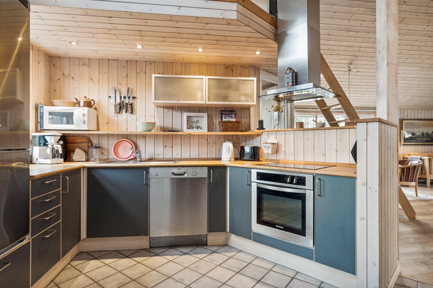 Køkkenet er udstyret med 1 køleskab. Der er 4 keramiske kogeplader, varmluftovn, mikrobølgeovn samt opvaskemaskine Der er gulvvarme i køkkenet.