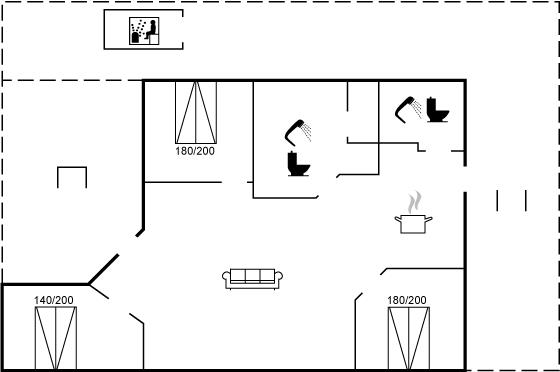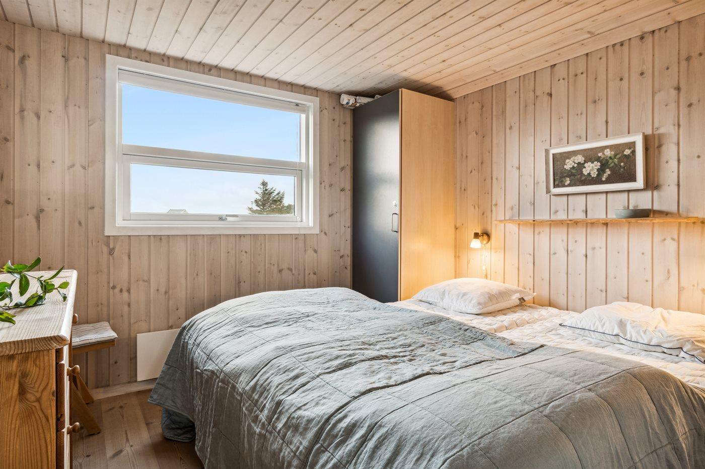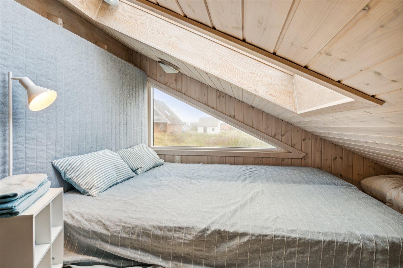 Der er i alt 3 soveværelser. Sovepladserne fordeler sig på: 6 sovepladser i dobbeltsenge. 2 sovepladser på madrasser. 2 af disse sovepladser befinder sig på husets hems. Derudover er der 1 stk. barneseng.