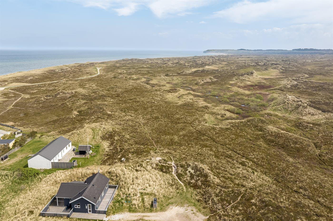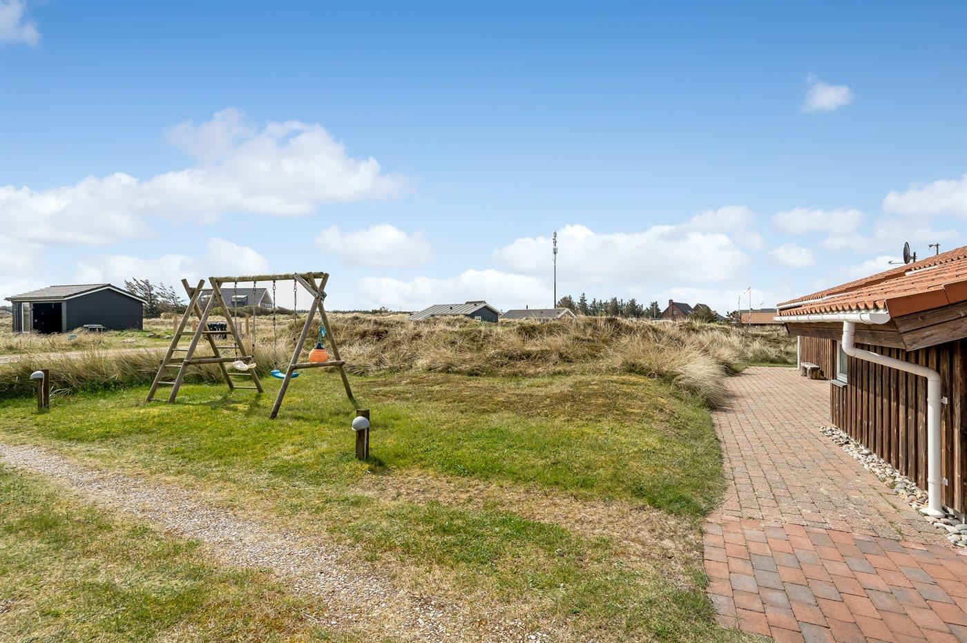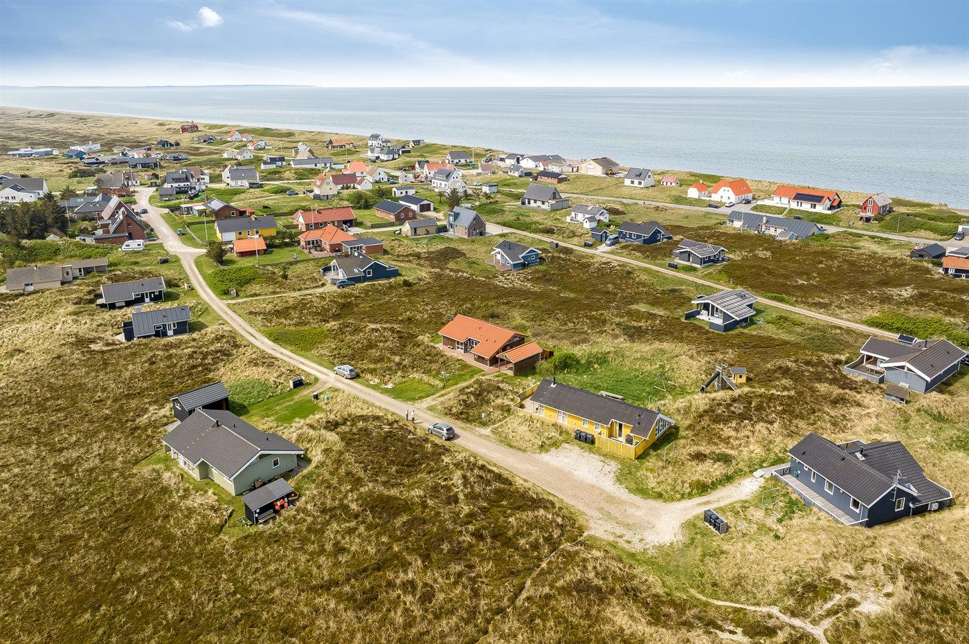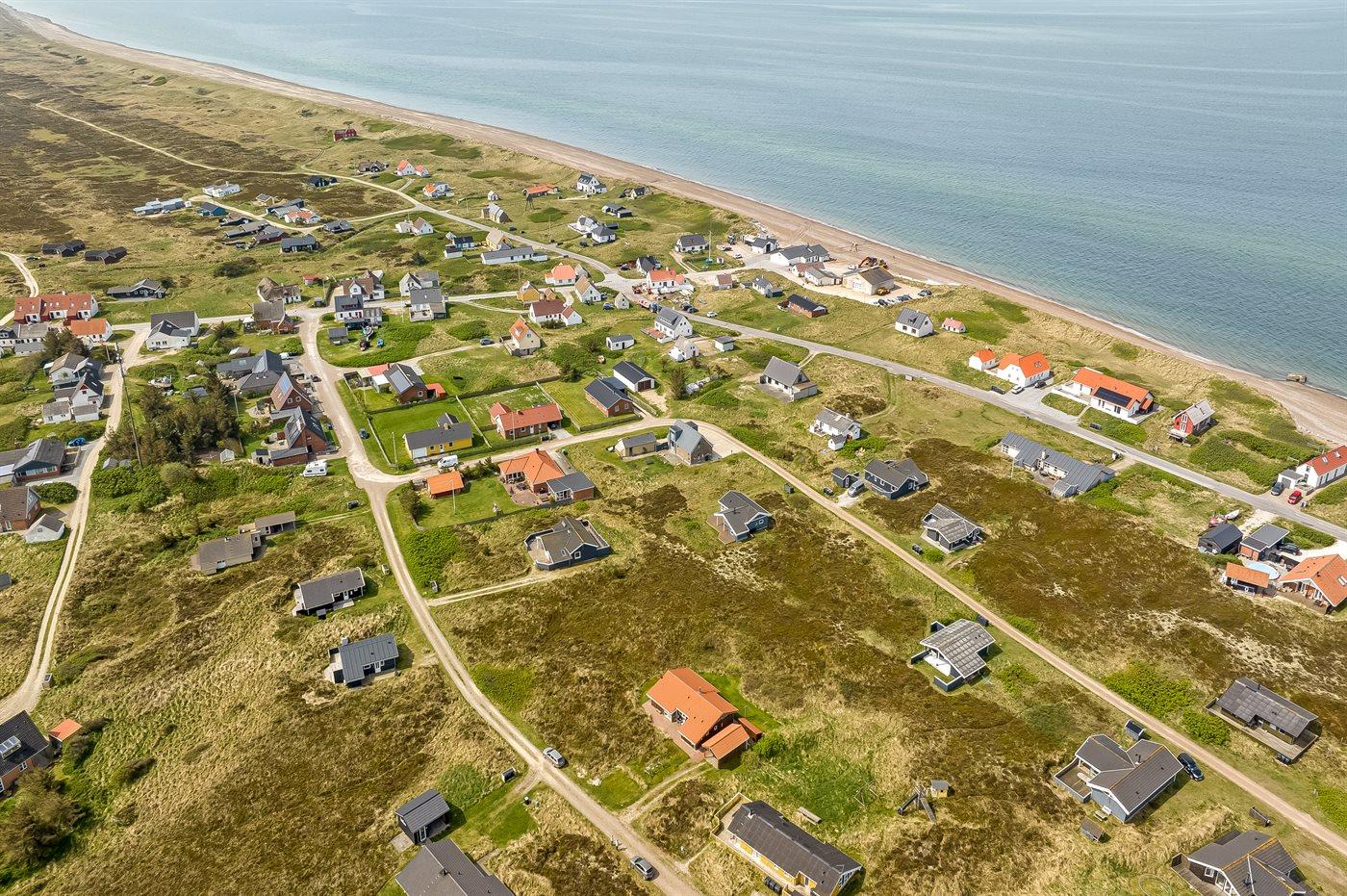 Ferieboligen er beliggende på en 1674 m² stor klitgrund. Der er 200 m til havet. Nærmeste forretning er beliggende i en afstand af 10000 m. Der er en golfbane i en afstand af 25000 m. Til ferieboligen hører 100 m² terrasseareal. Desuden er der 30 m² overdækket terrasse. Der er redskabsrum. Grill til rådighed. Der er carport til rådighed. Parkering ved ferieboligen.