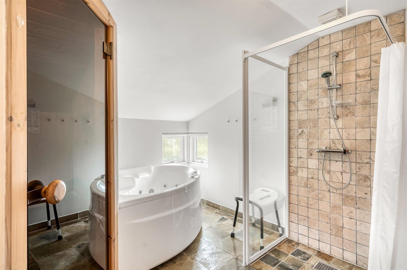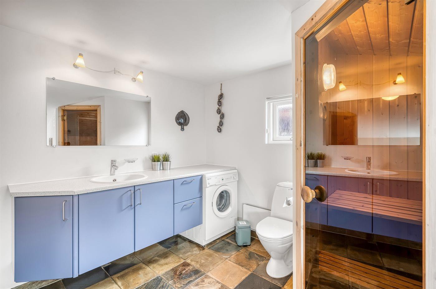 Der er 1 badeværelse med bruseniche og 2 toiletter, heraf 1 gæstetoilet. Der er gulvvarme på 1 badeværelse. Der er gulvvarme på gæstetoilettet. I saunaen er der mulighed for afslapning.