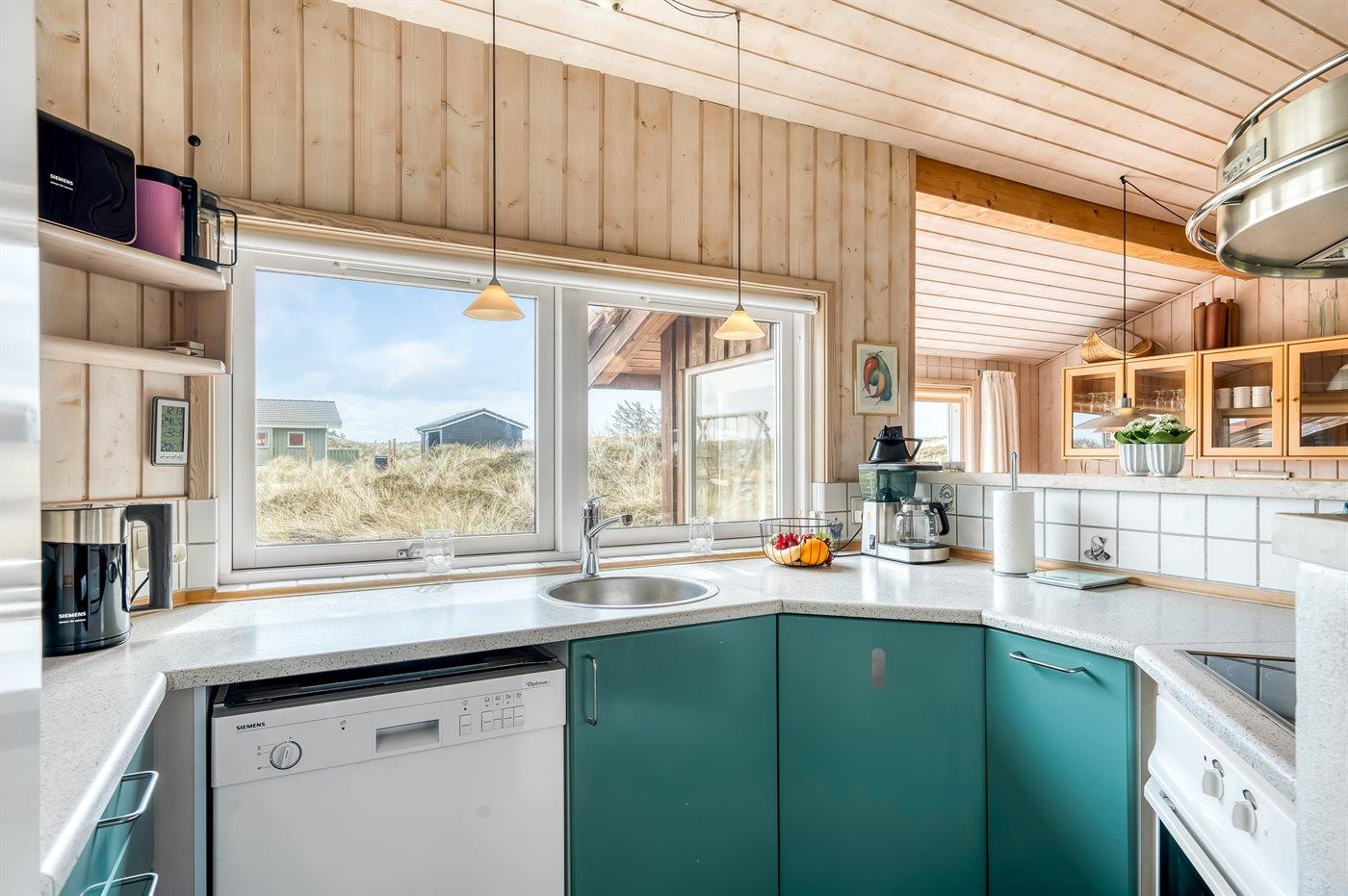 Køkkenet er udstyret med 1 køleskab. Der er 4 keramiske kogeplader, varmluftovn, mikrobølgeovn samt opvaskemaskine.